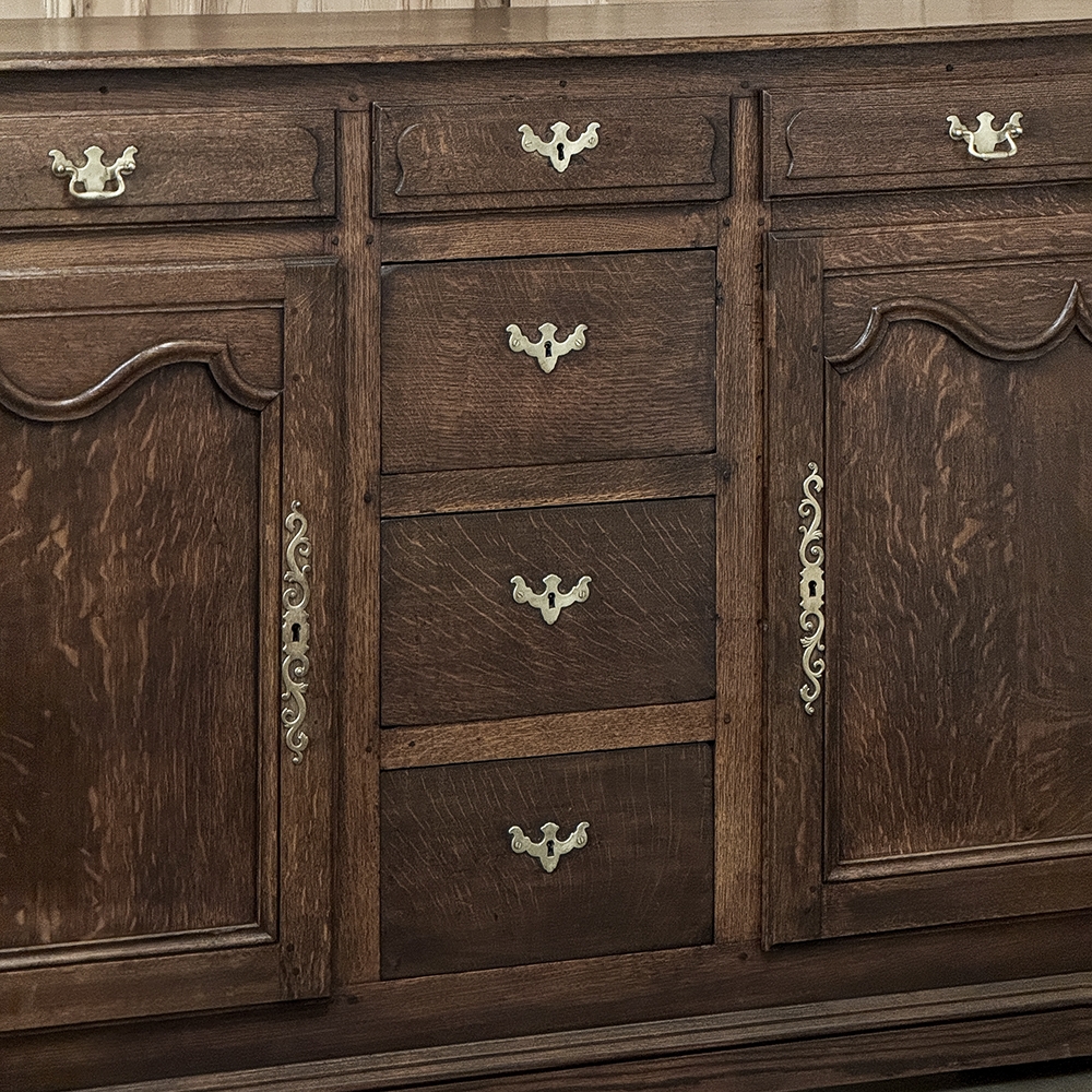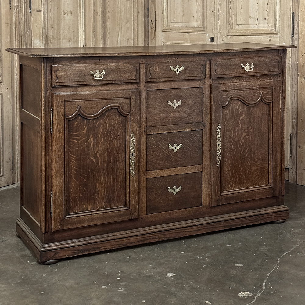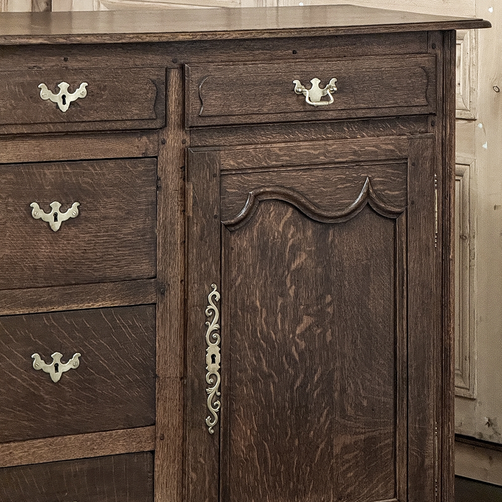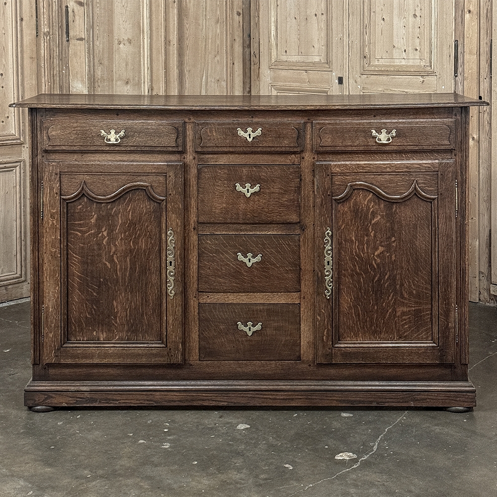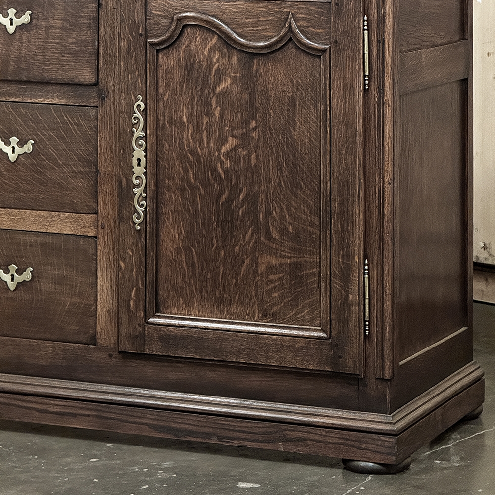 19th Century Country French Buffet ~ Linen Press was designed to provide all the storage space needed by a large family for all their linens and flatware needed for setting a grand table! Hand-crafted entirely from quarter-sawn oak and cast brass, it features a solid plank beveled surface for display and serving, with no less than three top drawers and three bin-size drawers all of which are fitted with cast brass key guards or bale pulls with guards. Those with key guards, like the cabinet doors, require a key (supplied) to use as a pull. Such a design creates a clean look so favored by the French. The cabinet doors are hung with brass barrel hinges, and feature the only fancy molding with a bold scrollwork in the upper frame. A straight baseboard and bun feet complete the exterior visual appointments. Open the drawers and doors to reveal a voluminous storage capacity which you'll really come to appreciate. Nobody can have TOO much storage, right? Note the hand-hewn chamfered solid planks on the back side.