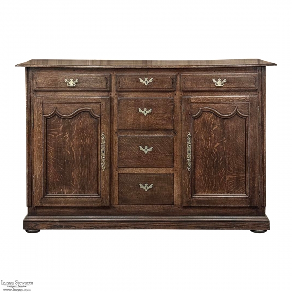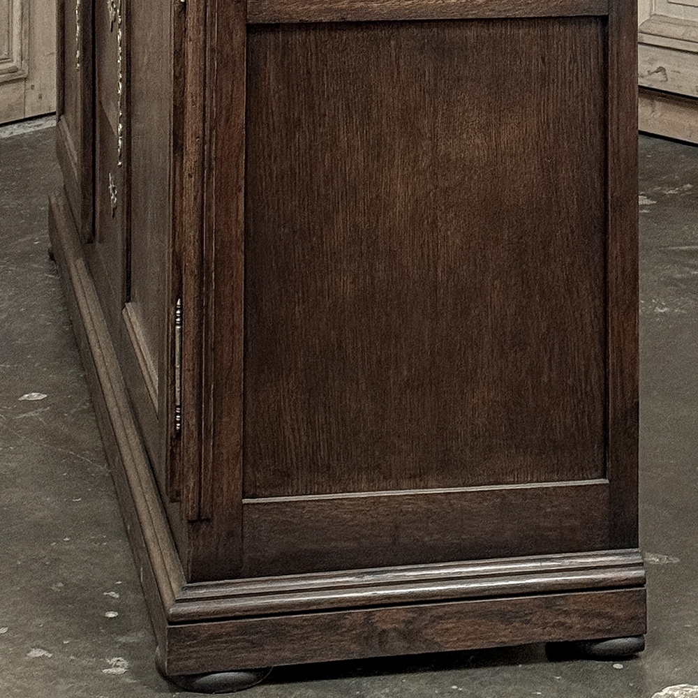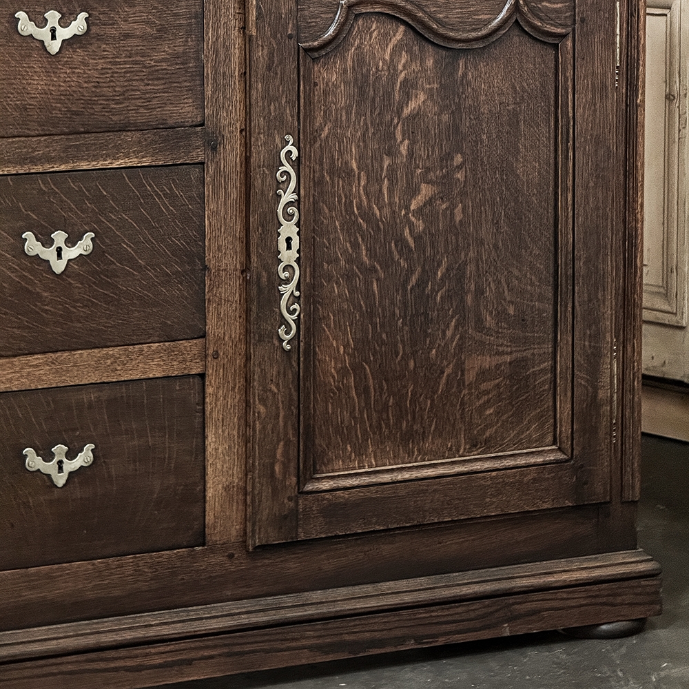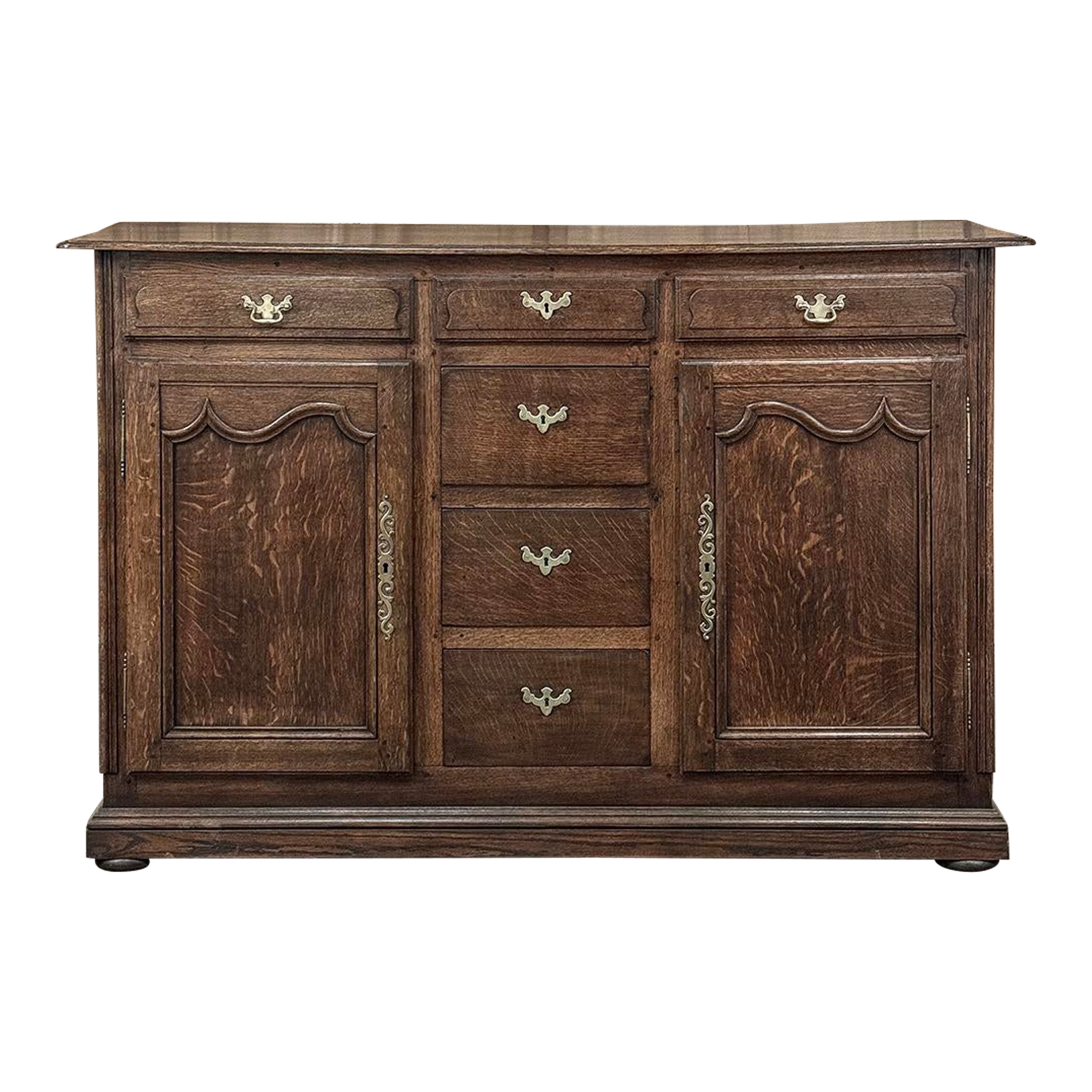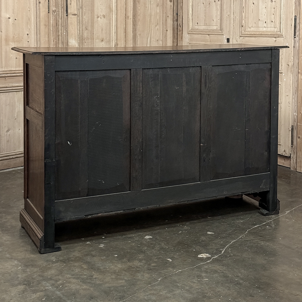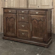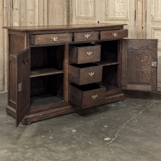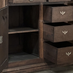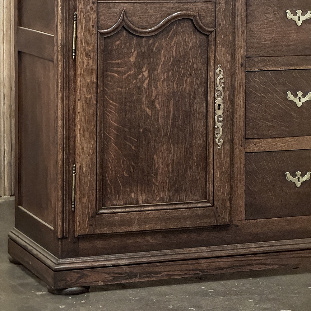 19th Century Country French Buffet ~ Linen Press was designed to provide all the storage space needed by a large family for all their linens and flatware needed for setting a grand table! Hand-crafted entirely from quarter-sawn oak and cast brass, it features a solid plank beveled surface for display and serving, with no less than three top drawers and three bin-size drawers all of which are fitted with cast brass key guards or bale pulls with guards. Those with key guards, like the cabinet doors, require a key (supplied) to use as a pull. Such a design creates a clean look so favored by the French. The cabinet doors are hung with brass barrel hinges, and feature the only fancy molding with a bold scrollwork in the upper frame. A straight baseboard and bun feet complete the exterior visual appointments. Open the drawers and doors to reveal a voluminous storage capacity which you'll really come to appreciate. Nobody can have TOO much storage, right? Note the hand-hewn chamfered solid planks on the back side.