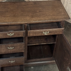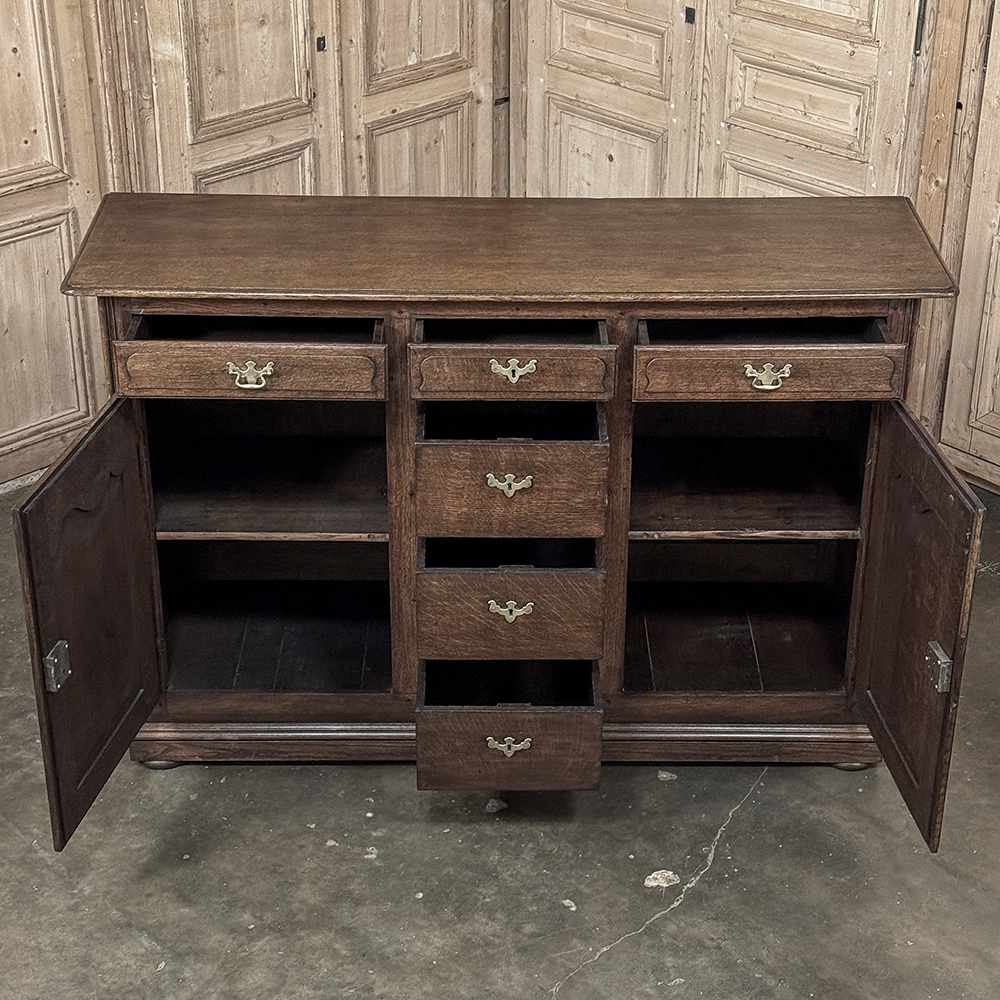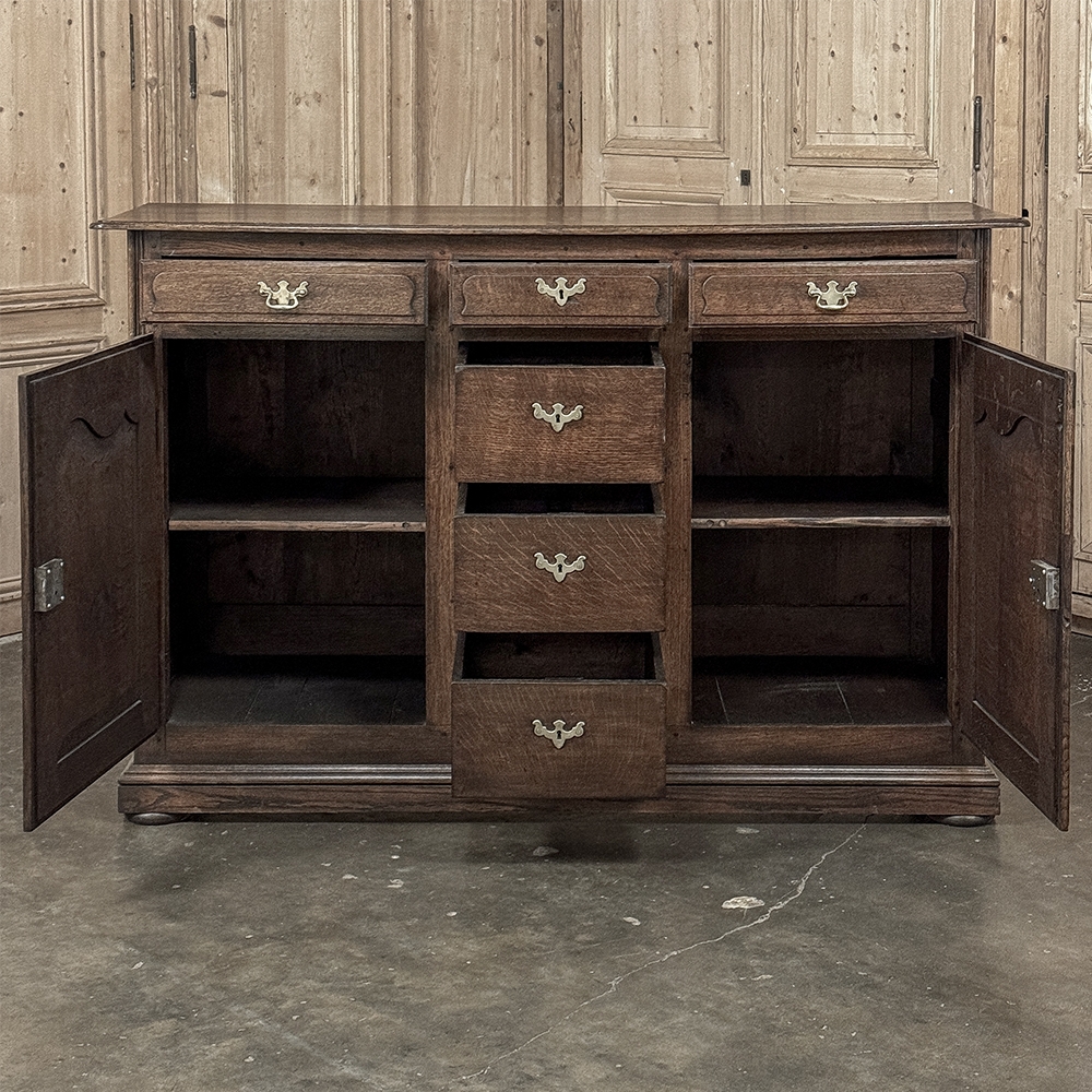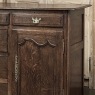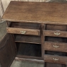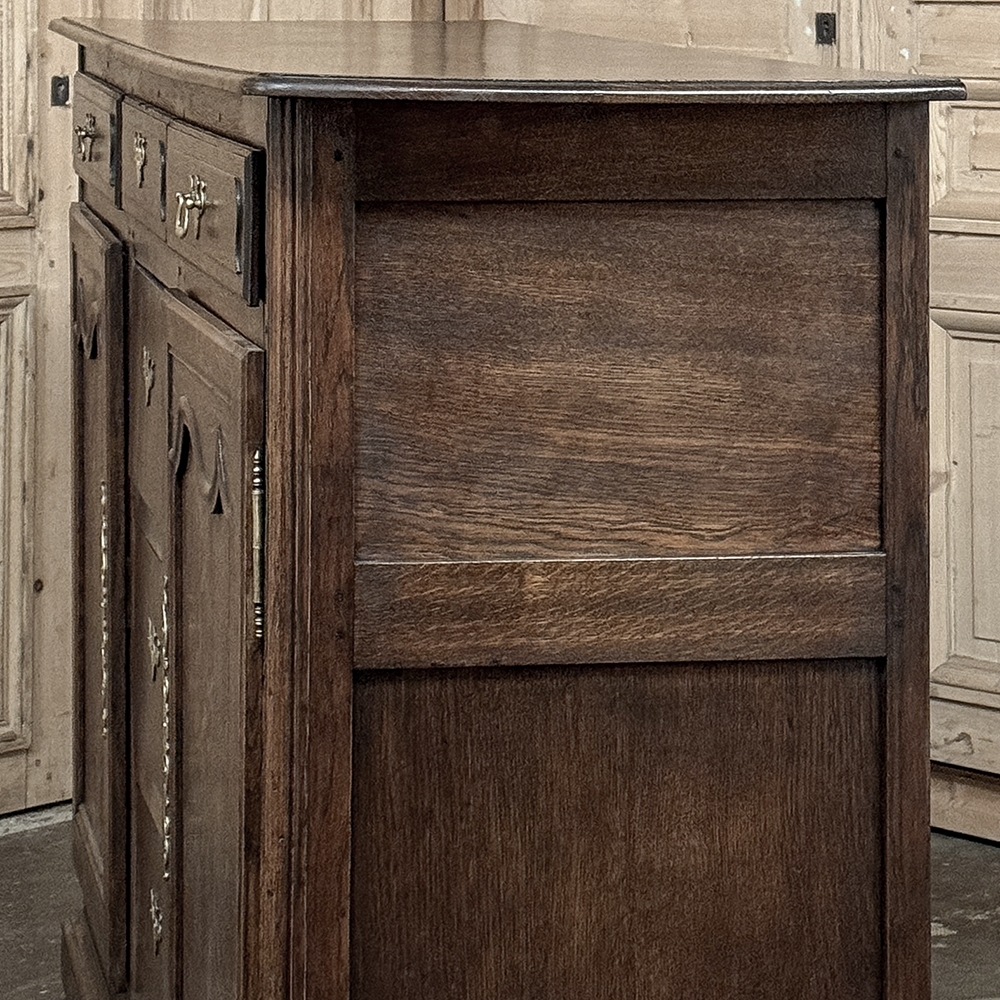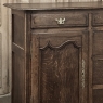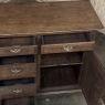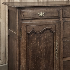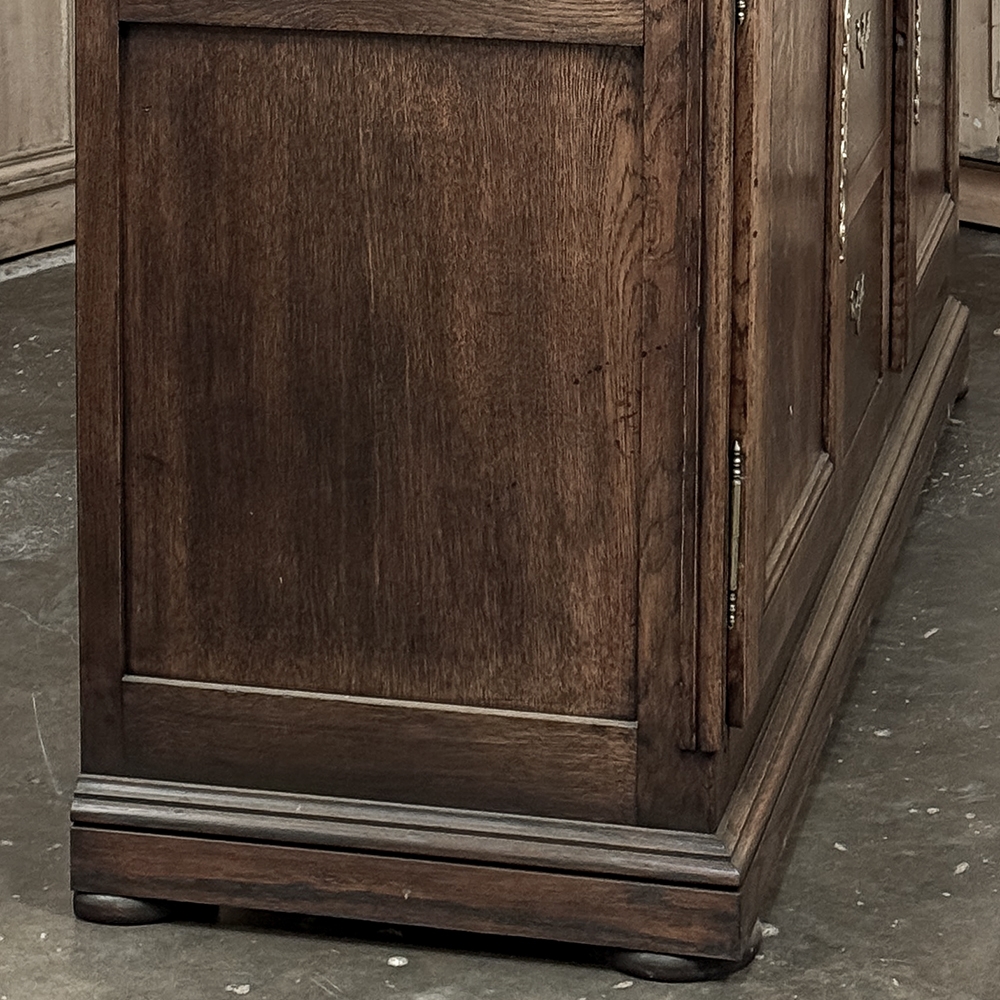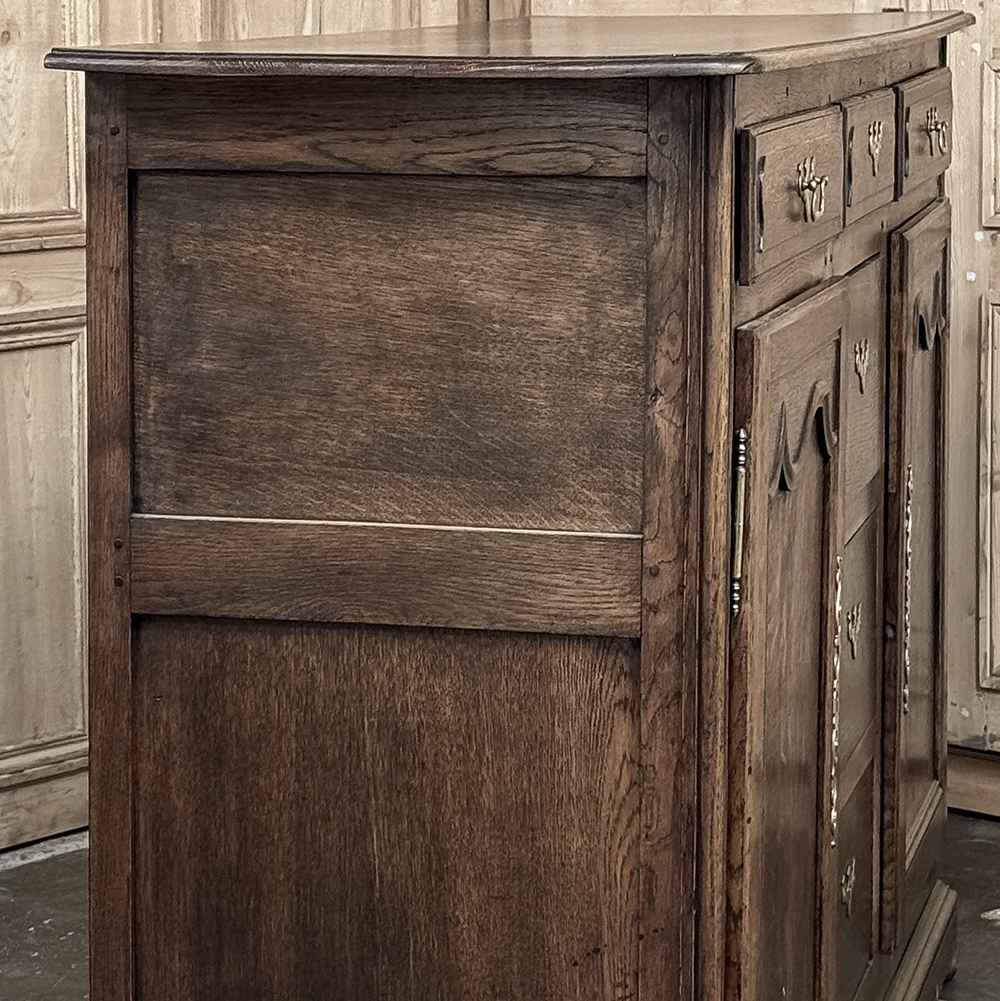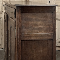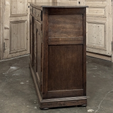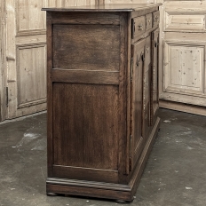 19th Century Country French Buffet ~ Linen Press was designed to provide all the storage space needed by a large family for all their linens and flatware needed for setting a grand table! Hand-crafted entirely from quarter-sawn oak and cast brass, it features a solid plank beveled surface for display and serving, with no less than three top drawers and three bin-size drawers all of which are fitted with cast brass key guards or bale pulls with guards. Those with key guards, like the cabinet doors, require a key (supplied) to use as a pull. Such a design creates a clean look so favored by the French. The cabinet doors are hung with brass barrel hinges, and feature the only fancy molding with a bold scrollwork in the upper frame. A straight baseboard and bun feet complete the exterior visual appointments. Open the drawers and doors to reveal a voluminous storage capacity which you'll really come to appreciate. Nobody can have TOO much storage, right? Note the hand-hewn chamfered solid planks on the back side.