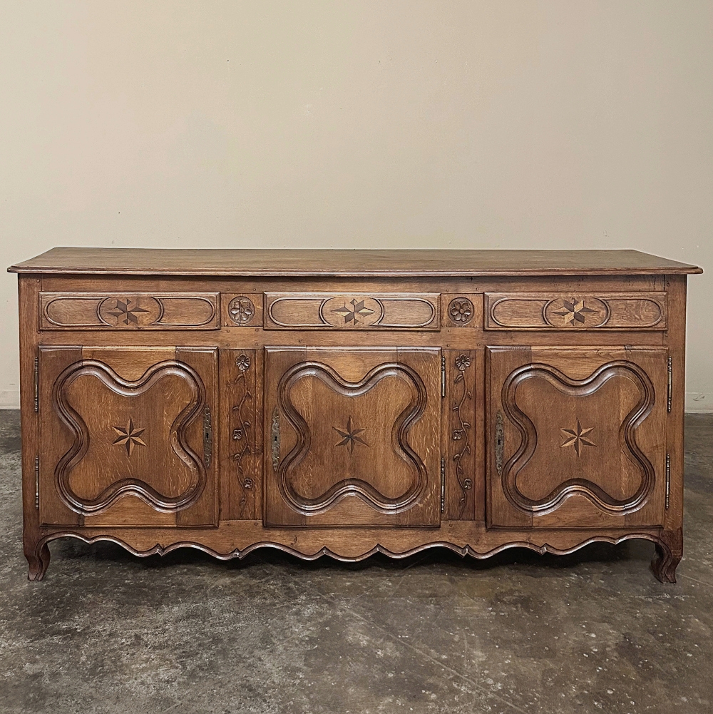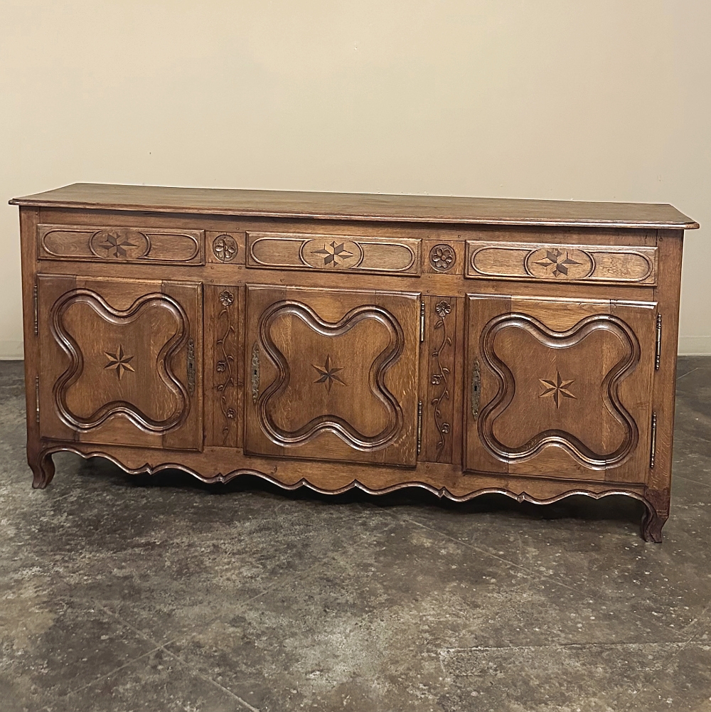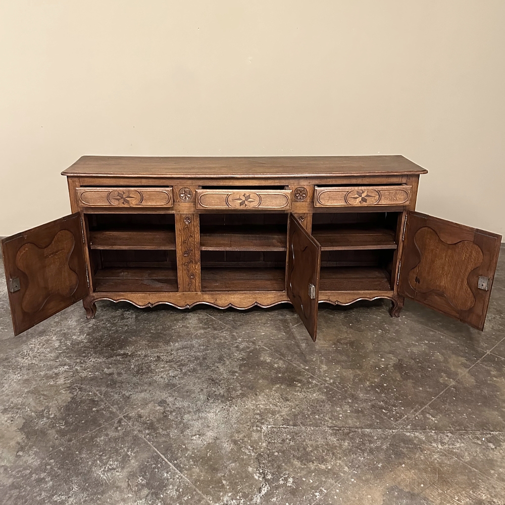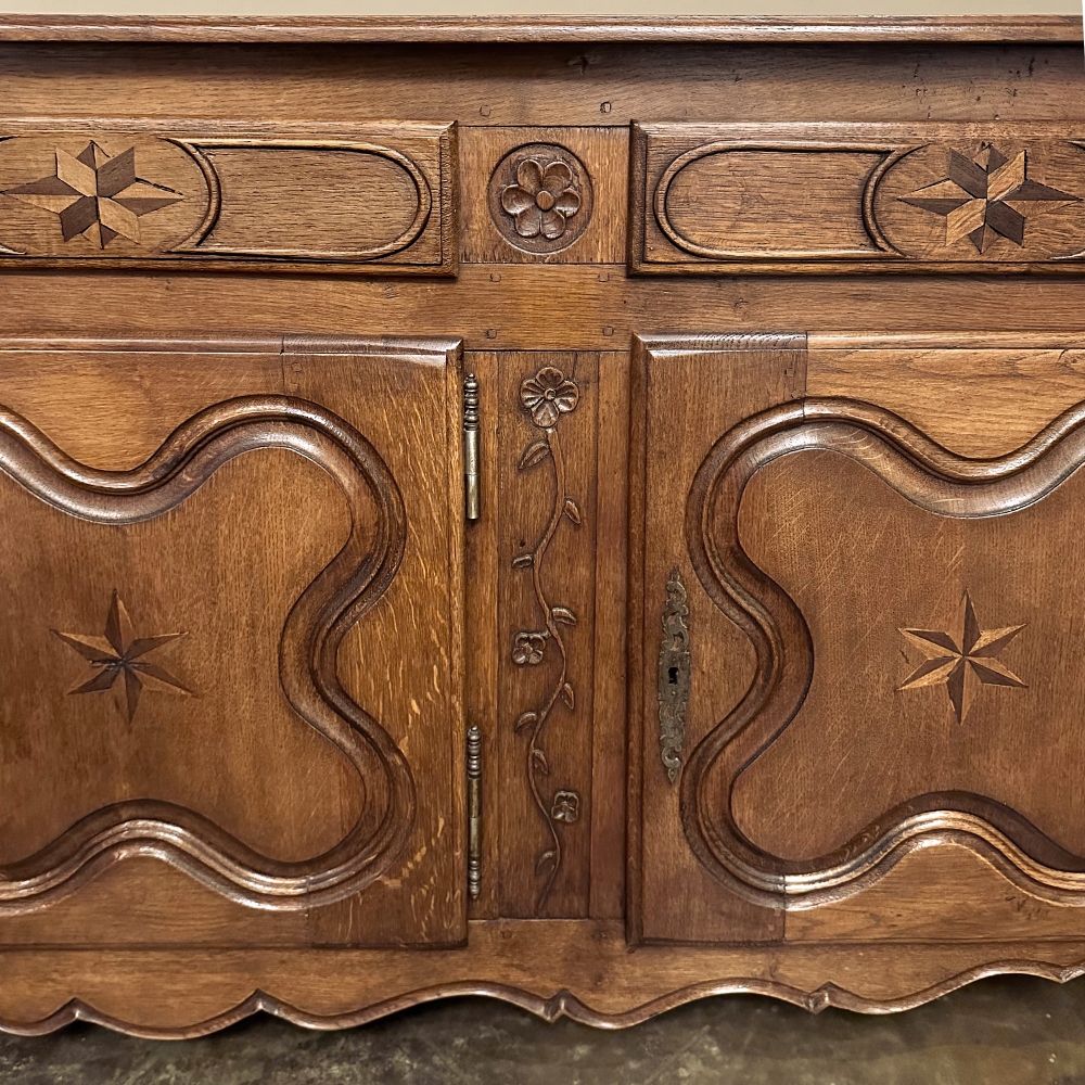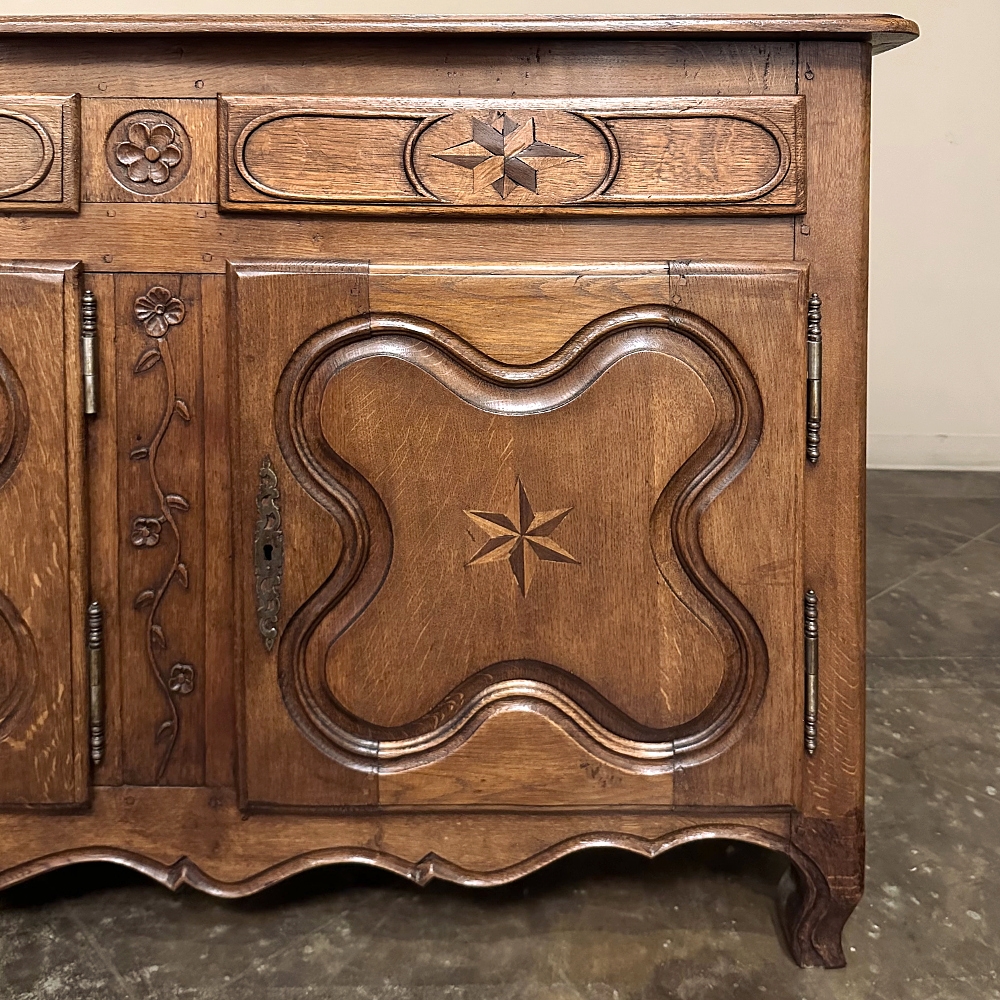 19th Century Country French Inlaid Buffet is a charming example of the genre, styled with tailored lines compared to most French furnishings, yet still a design executed with flair! Hand-crafted from select, dense, old-growth oak, it features a solid plank top overlooking three drawers and three cabinets, all of which open to reveal cavernous storage, with no partitions and a full width shelf inside. Each drawer and cabinet facade is defined by fine molding detail and the cabinets, with raised panels, and all six faces are enhanced with compass rose motifs inlaid from walnut and cherry wood to create classic visual appeal with a nautical touch. Between the cabinet doors wildflowers are carved into the stiles, leading the eye to the undulating apron below. Raised panels on the sides ensure visual appeal from all angles. Note the hand-cut solid oak panels on the back side, an important indicator that this piece will provide enjoyment for generations to come!