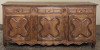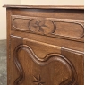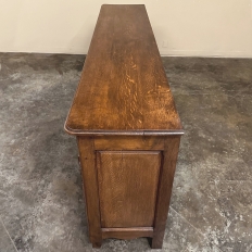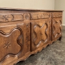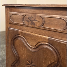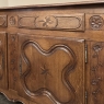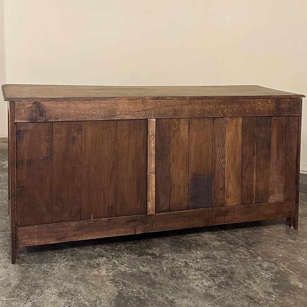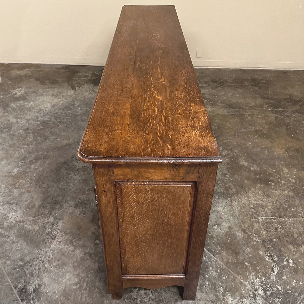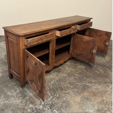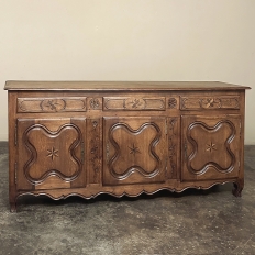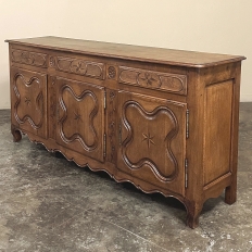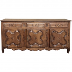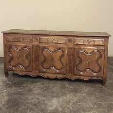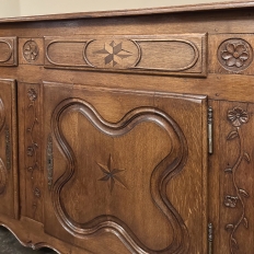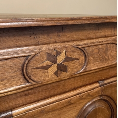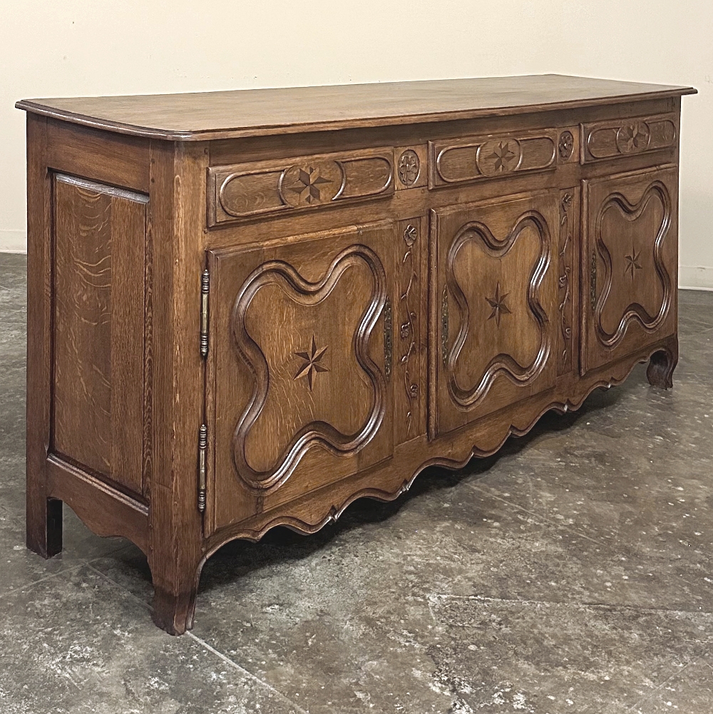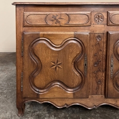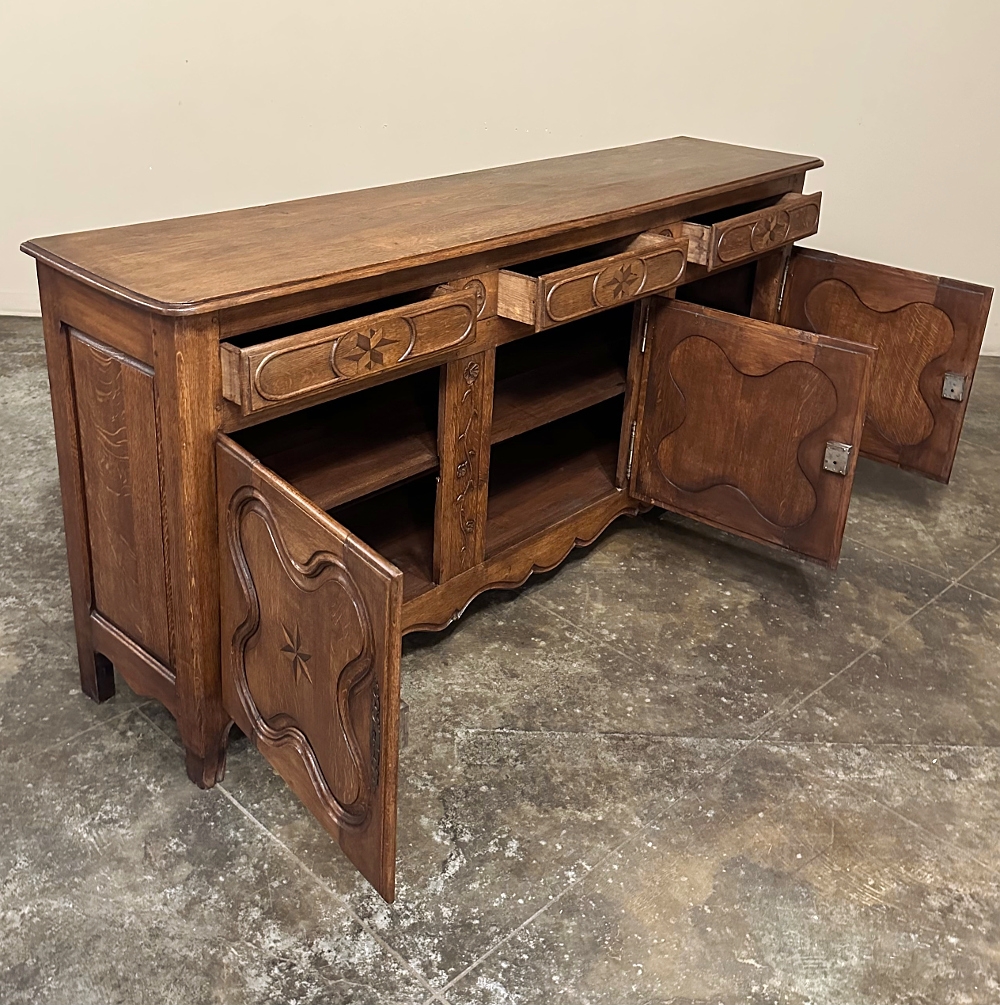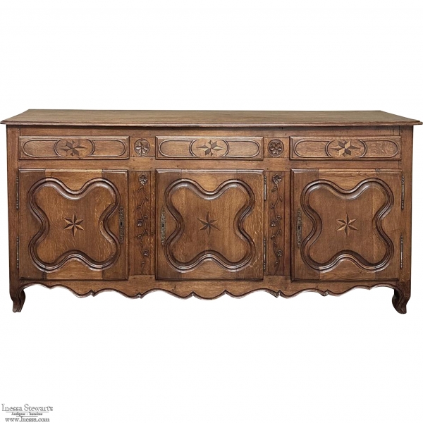 19th Century Country French Inlaid Buffet is a charming example of the genre, styled with tailored lines compared to most French furnishings, yet still a design executed with flair! Hand-crafted from select, dense, old-growth oak, it features a solid plank top overlooking three drawers and three cabinets, all of which open to reveal cavernous storage, with no partitions and a full width shelf inside. Each drawer and cabinet facade is defined by fine molding detail and the cabinets, with raised panels, and all six faces are enhanced with compass rose motifs inlaid from walnut and cherry wood to create classic visual appeal with a nautical touch. Between the cabinet doors wildflowers are carved into the stiles, leading the eye to the undulating apron below. Raised panels on the sides ensure visual appeal from all angles. Note the hand-cut solid oak panels on the back side, an important indicator that this piece will provide enjoyment for generations to come!