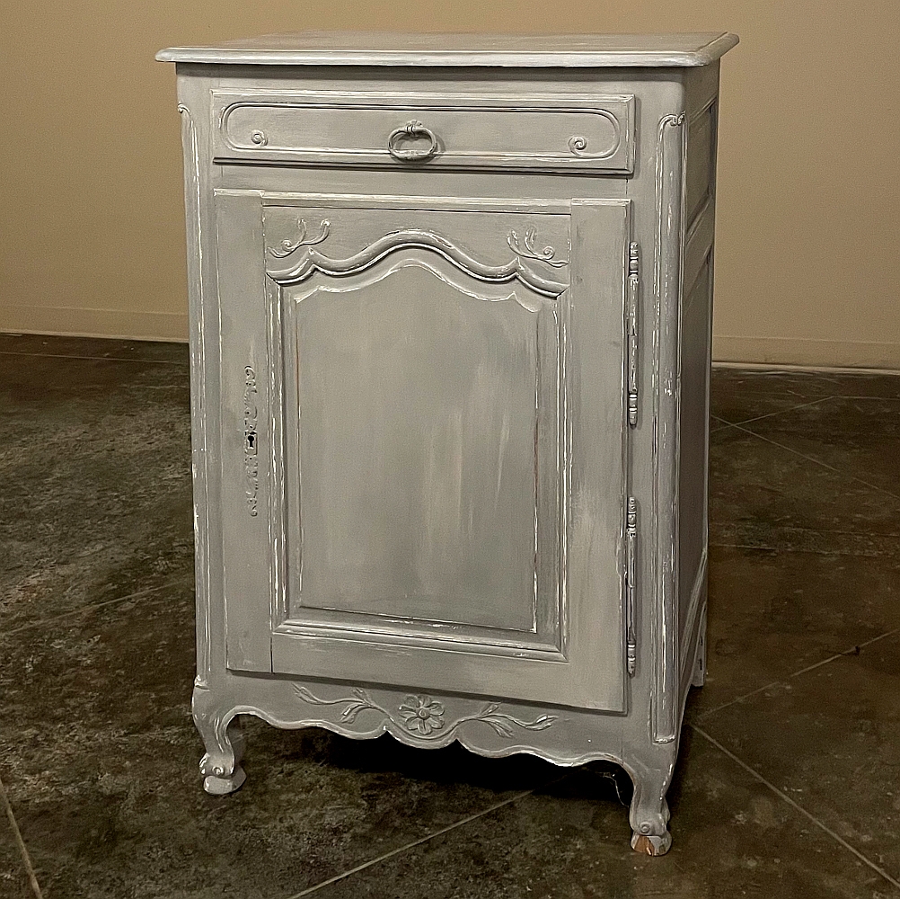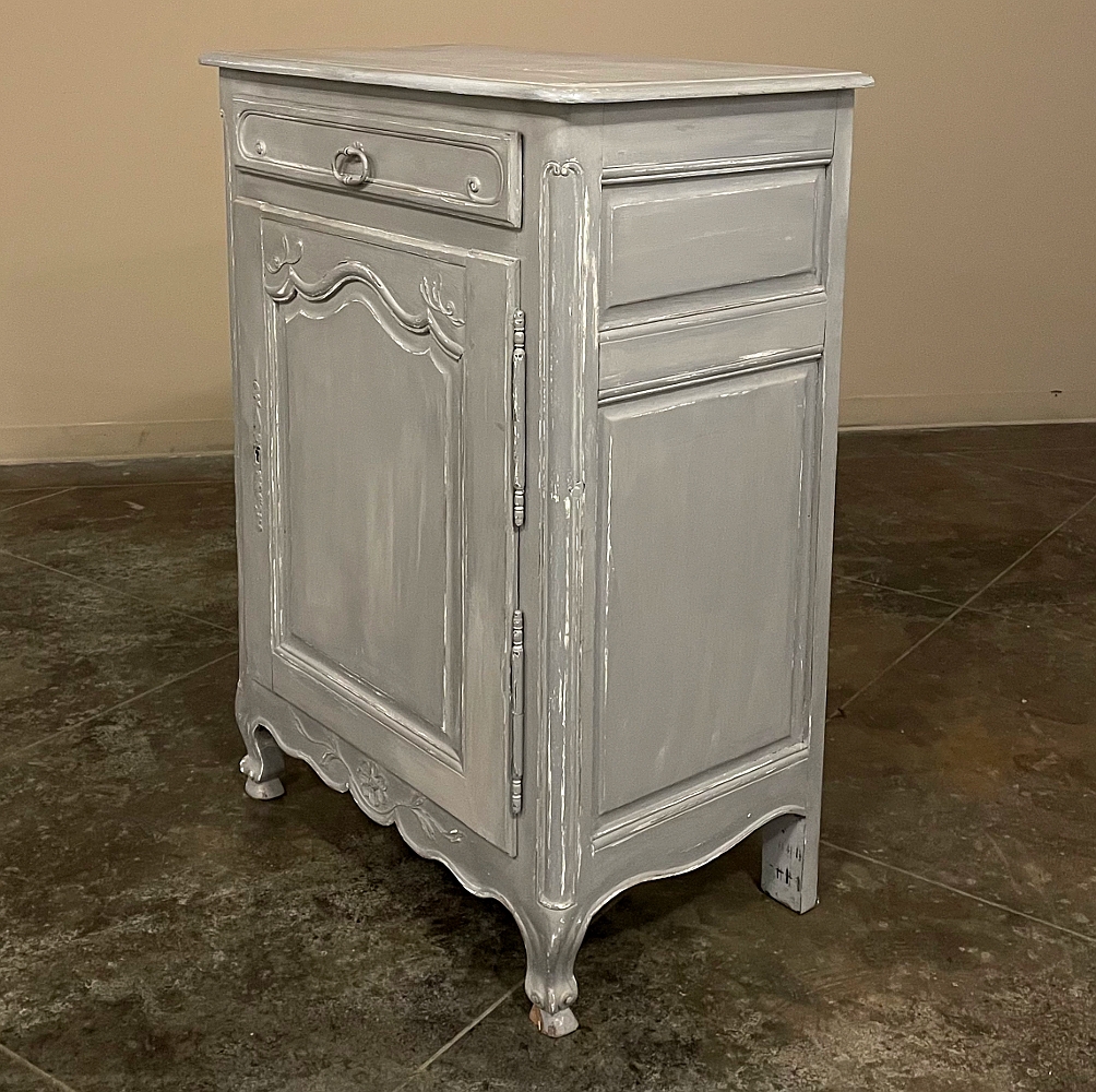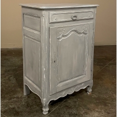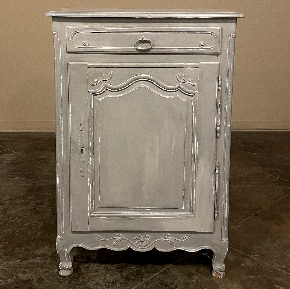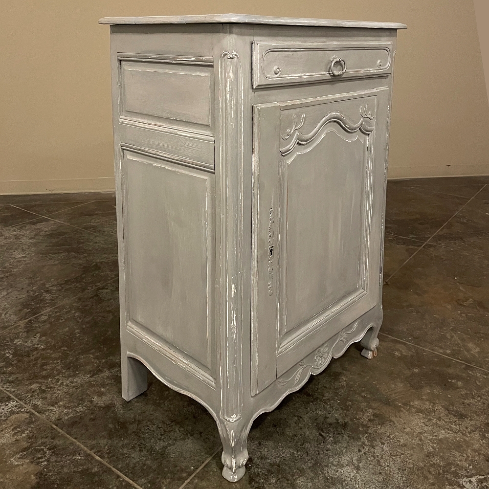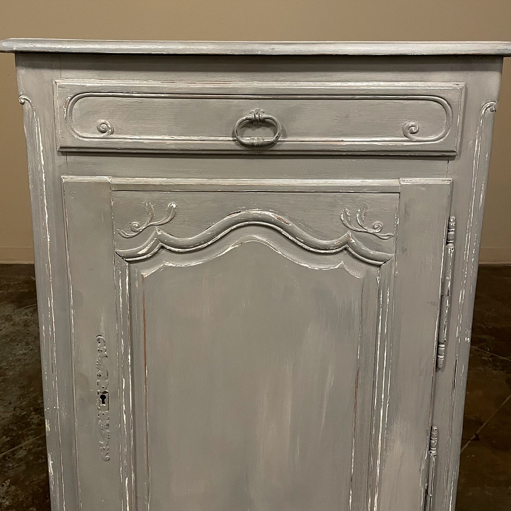 19th Century Country French Painted Confiturier ~ Cabinet is a charming ode to the rural life in France, but with typical French flair! The beveled top is only 18 inches deep, making it very traffic friendly. A full width drawer with just a modicum of bordering appears at the top, accessed with a steel bale pull. Steel hinges mount the finely detailed door below, fitted with an arched chamfered panel and carved with just a touch of foliate flourishes. A steel key guard stands sentinel over the keyhole, and the door opens wide to reveal surprising storage with a shelf inside. The apron is traditionally scrolled and carved with a single flower flanked by foliate sprays, which in turn are flanked by the scrolled legs. A multi-coated painted finish completes the look, having achieved a lovely patina over the decades!