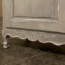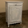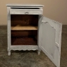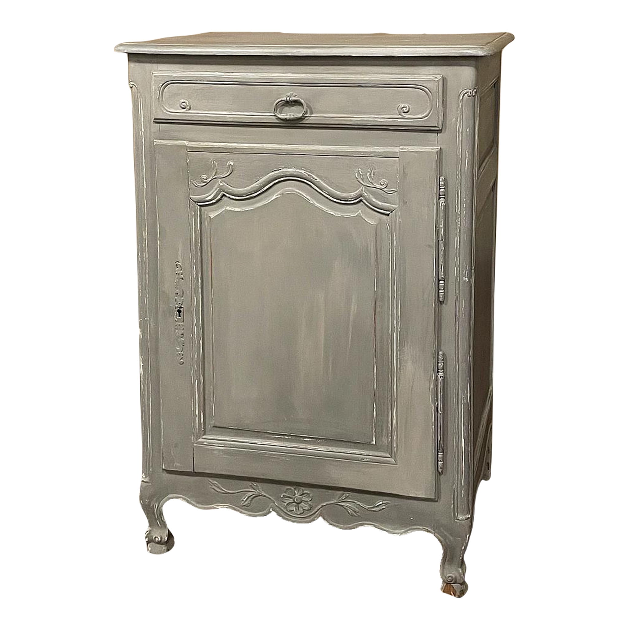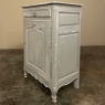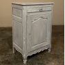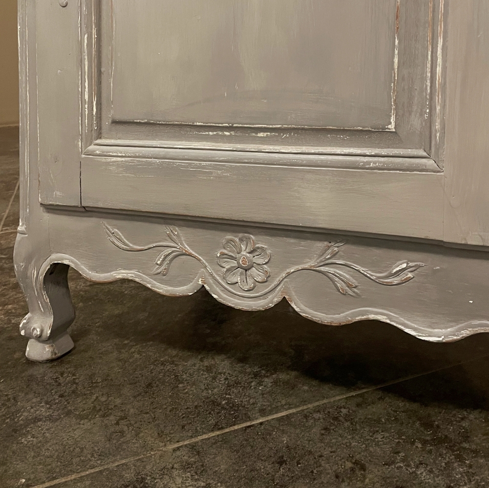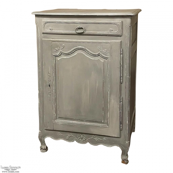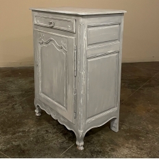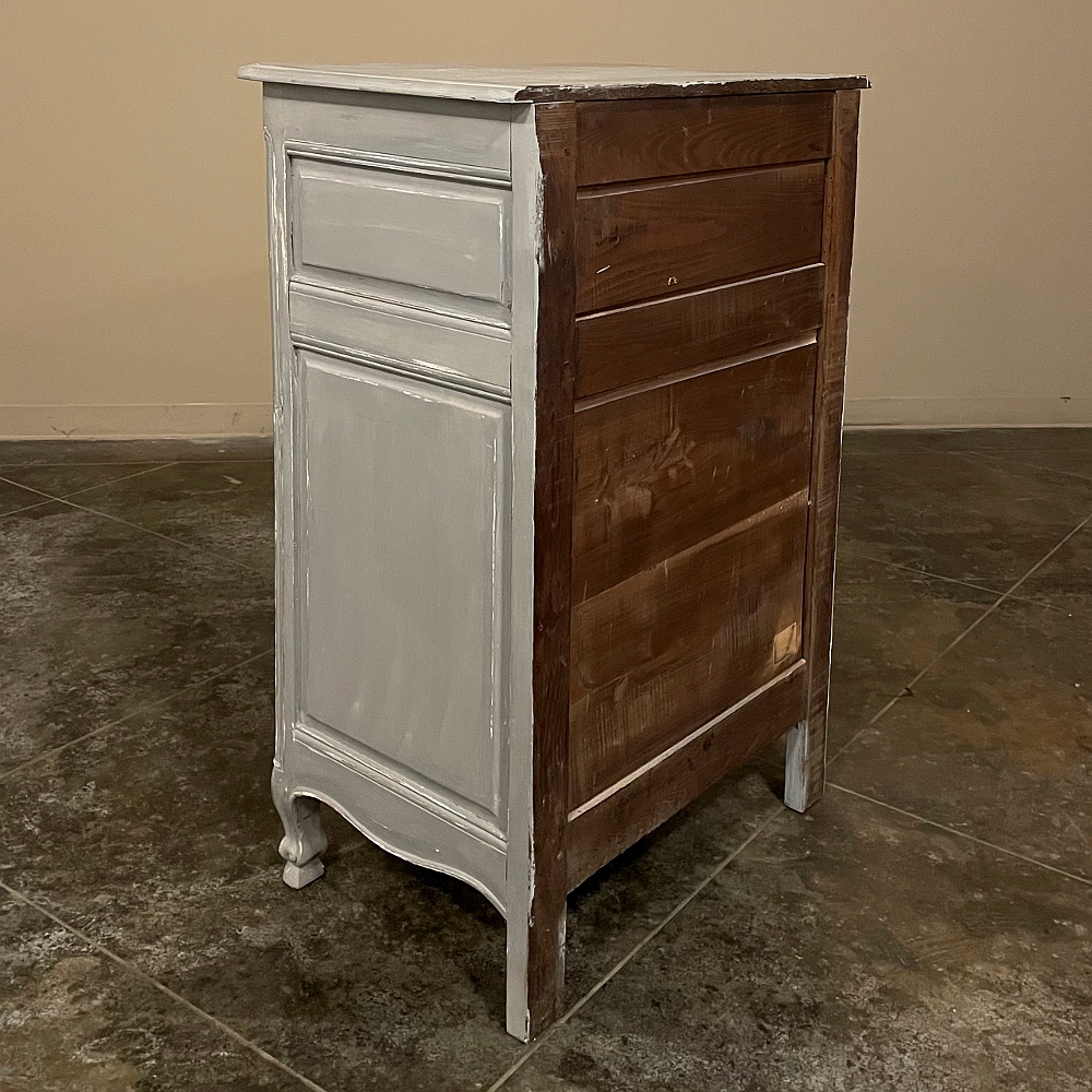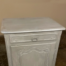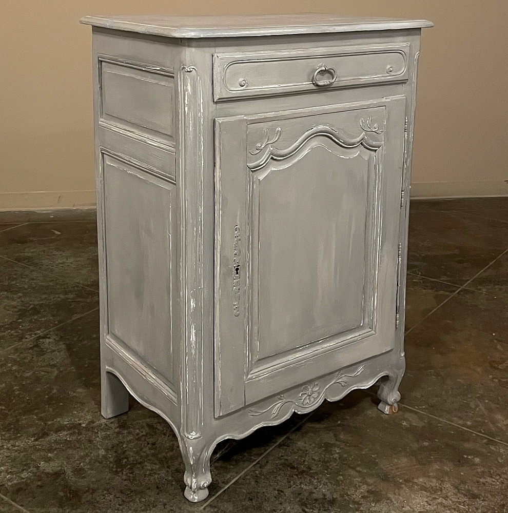 19th Century Country French Painted Confiturier ~ Cabinet is a charming ode to the rural life in France, but with typical French flair! The beveled top is only 18 inches deep, making it very traffic friendly. A full width drawer with just a modicum of bordering appears at the top, accessed with a steel bale pull. Steel hinges mount the finely detailed door below, fitted with an arched chamfered panel and carved with just a touch of foliate flourishes. A steel key guard stands sentinel over the keyhole, and the door opens wide to reveal surprising storage with a shelf inside. The apron is traditionally scrolled and carved with a single flower flanked by foliate sprays, which in turn are flanked by the scrolled legs. A multi-coated painted finish completes the look, having achieved a lovely patina over the decades!
