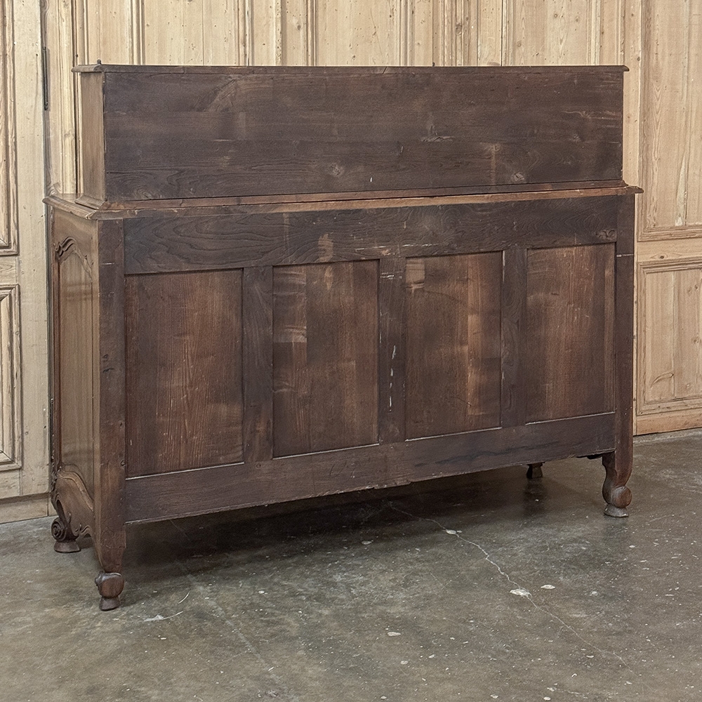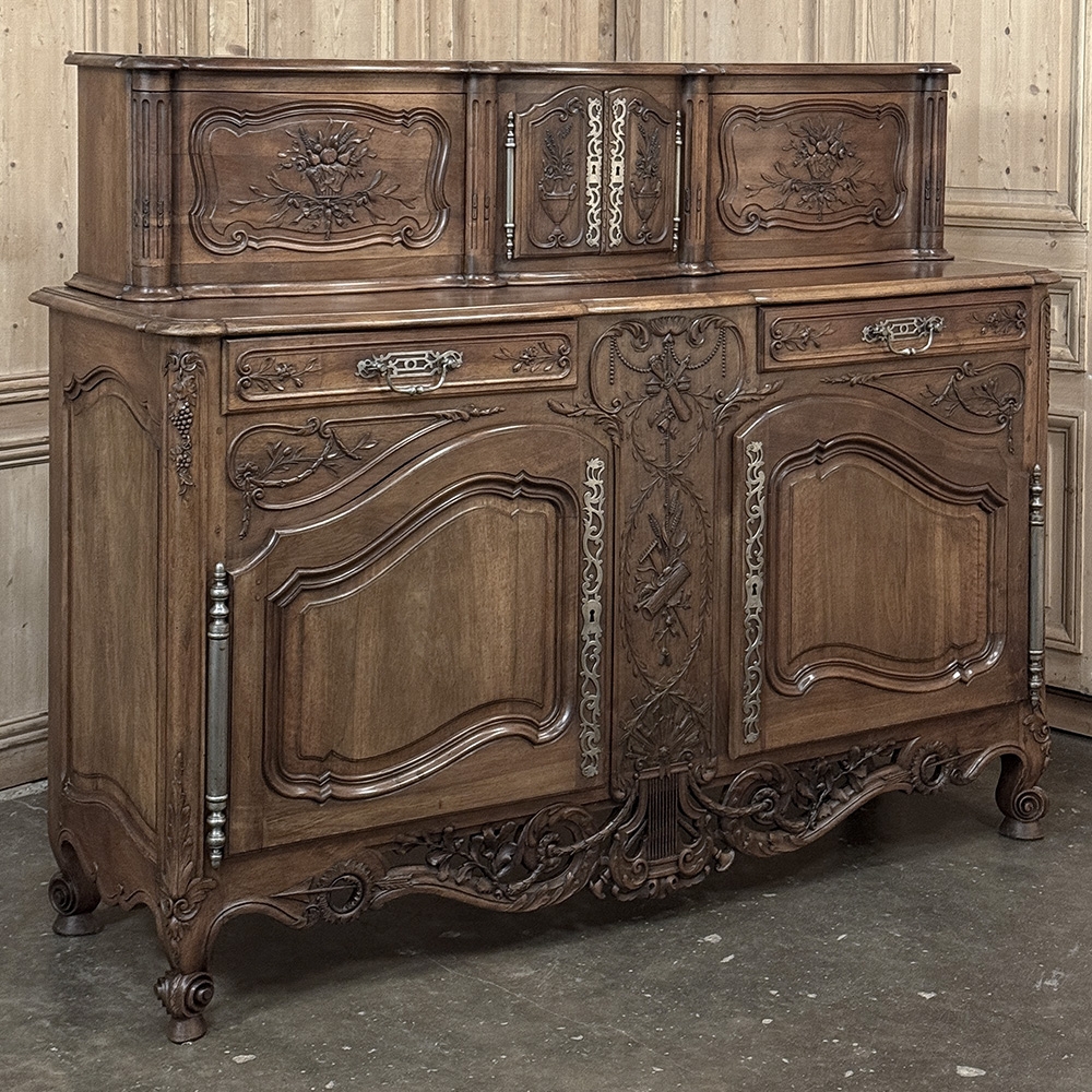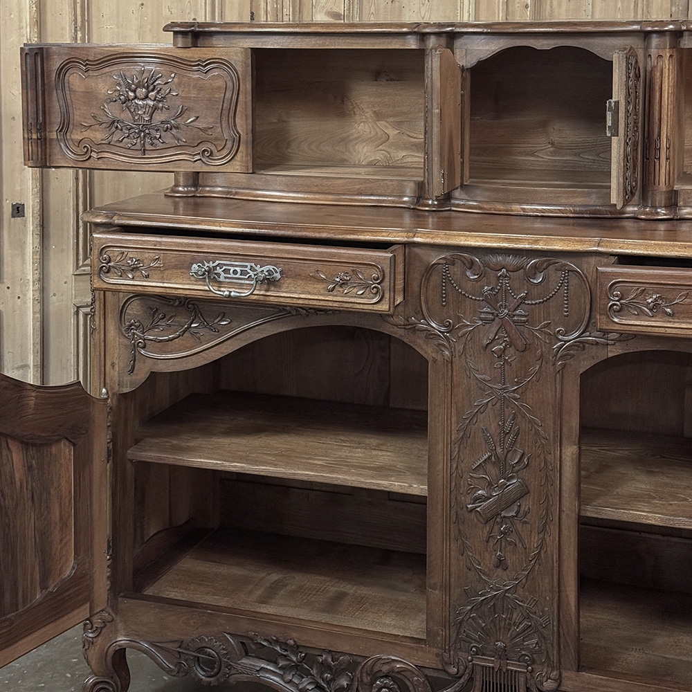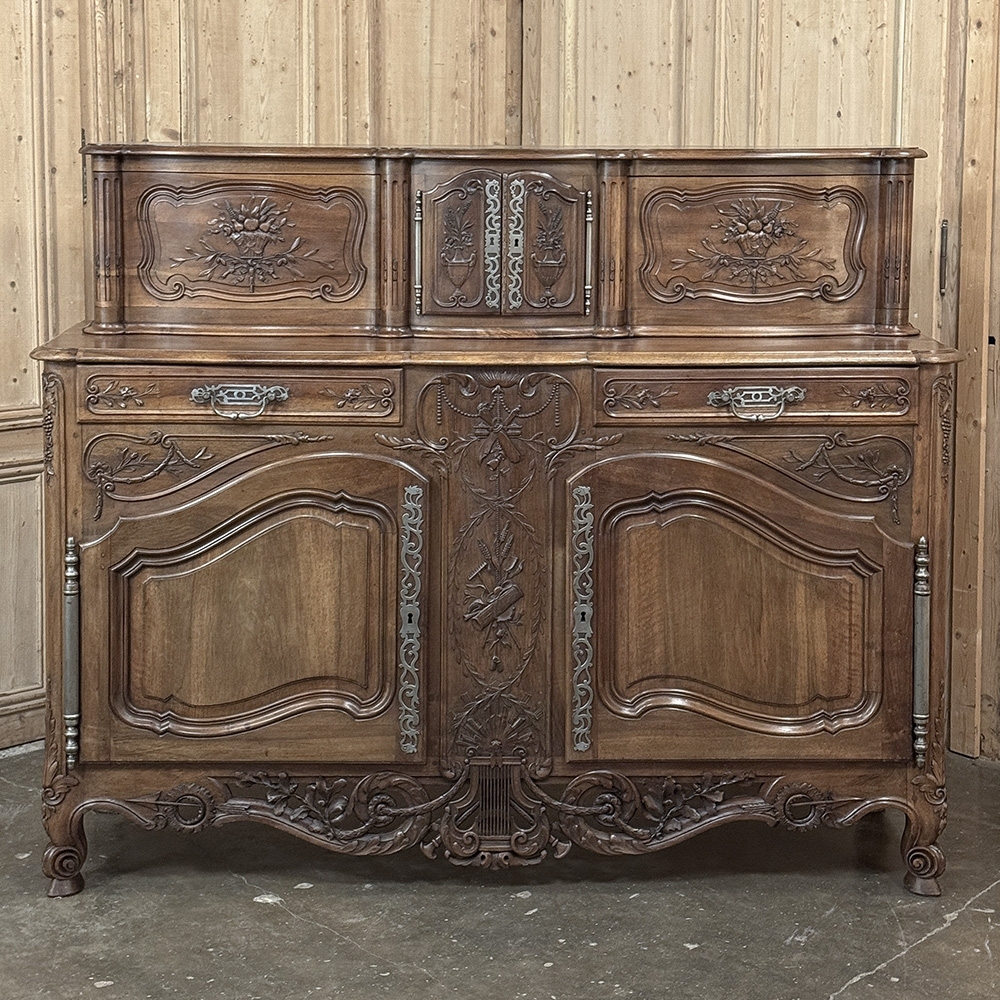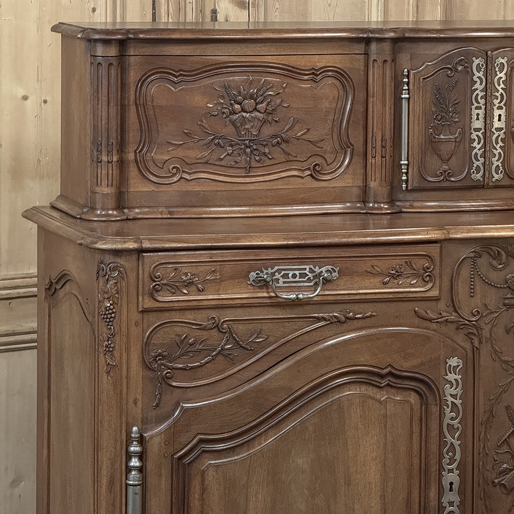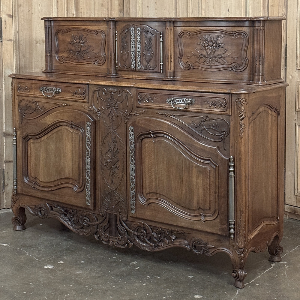 19th Century Country French Walnut Buffet a Glissant is a uniquely French design, with a recessed top cabinet whose side doors slide outwards for access, hence the name. The two center upper doors, each carved from a single piece of luxurious French walnut, are exquisitely arched and carved with Grecian vases with floral and foliate arrangements, surrounded by hand-carved molding detail. The sliding doors feature baskets of fruit and foliates atop olive branches with ribbon. And we've not even begun to describe the amazing main buffet below! The buffet also features arched cabinet doors with bold molding detail, but the carving between and below the doors is amazingly artistic and eye-catching. All doors and drawers are fitted with their original finely forged steel key guards and bale pulls with heavy full size barrel hinges for an amazing visual effect, but the real show stopper is the incredible natural beauty of the sumptuous French walnut in all its glory!