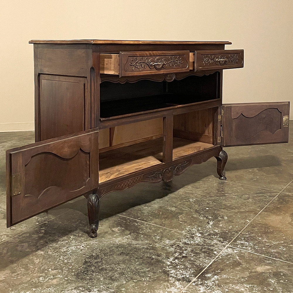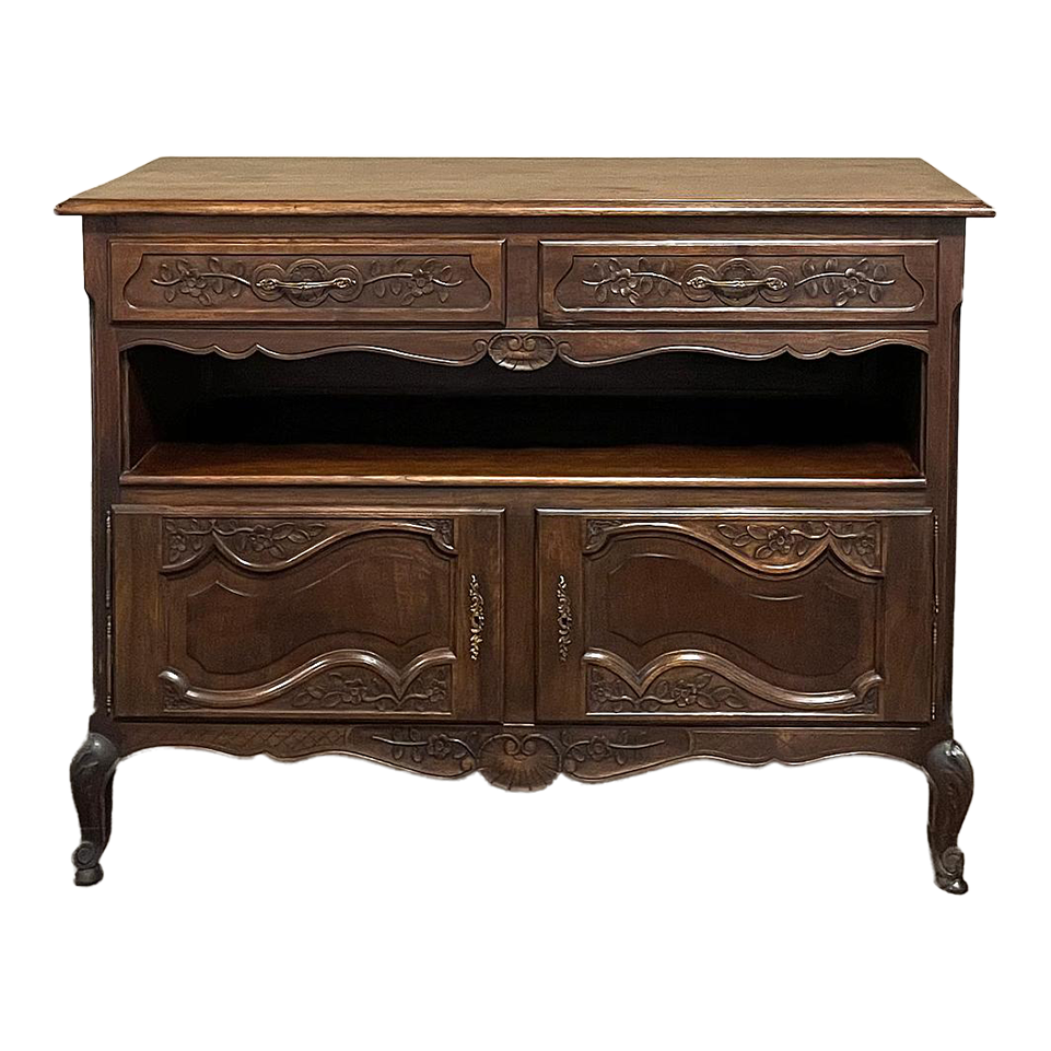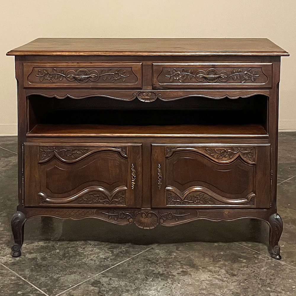 Sale19th Century Country French Walnut Dessert Buffet provides three functions in one! A full width, generous serving surface rests atop a pair of spacious drawers with brass pulls. Below the drawers is a full width display shelf which provides a blank canvas for your seasonal artistic displays. Below that, two cabinets are ready to house your essentials in style behind elegantly scrolled and hand-carved walnut. Finely cast brass drawer pulls and key guards combine with the external brass hinges for the perfect accompaniments to the carved detail, which emphasizes shell, floral and foliate designs. Ideal for use as a credenza, or as a platform for a Flat Panel TV!