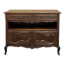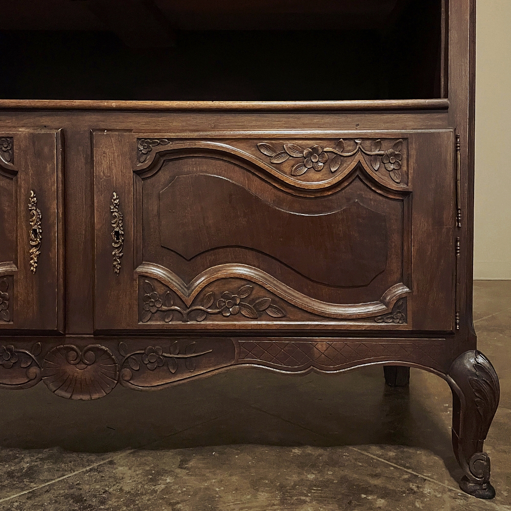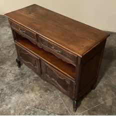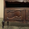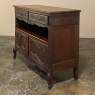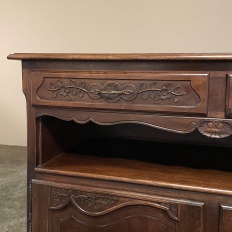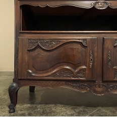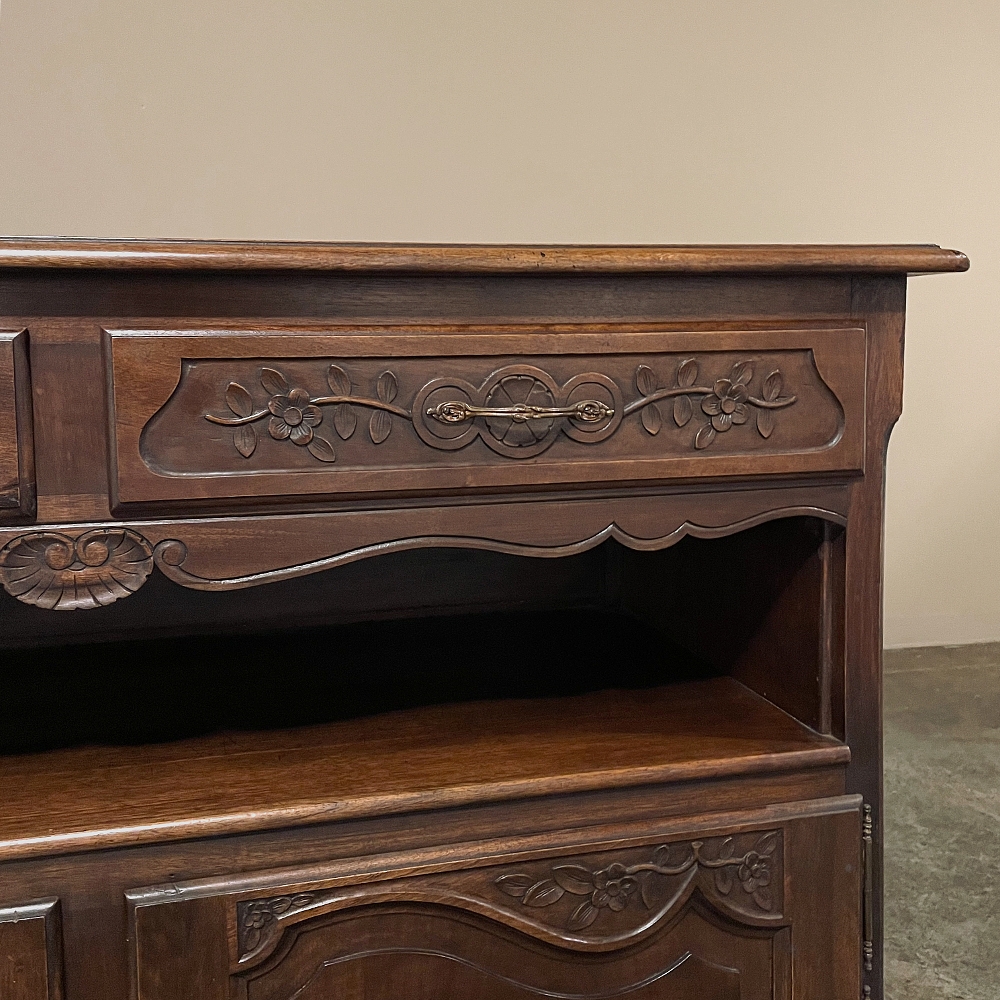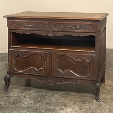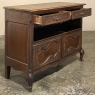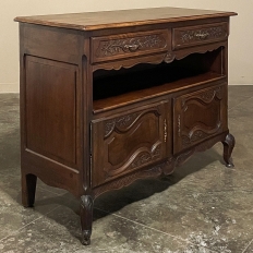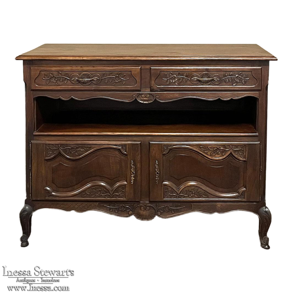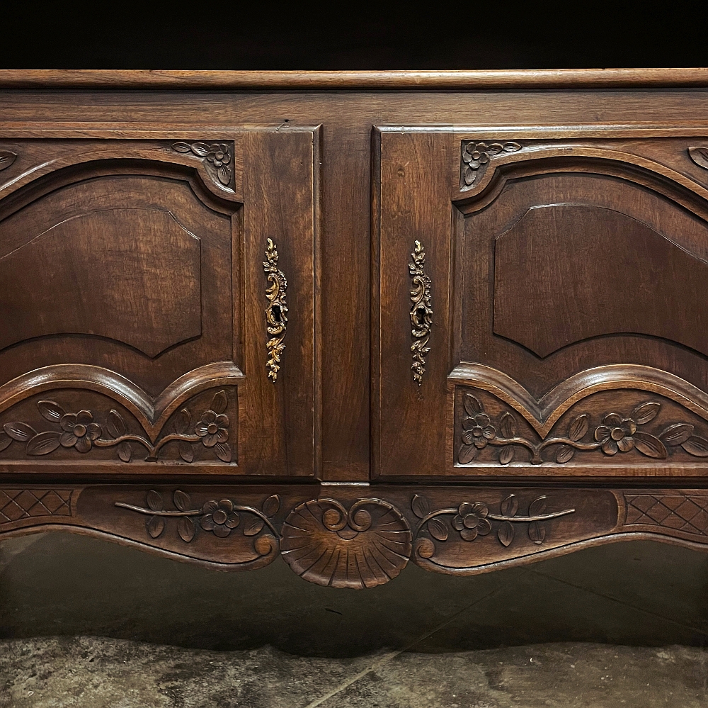 Sale19th Century Country French Walnut Dessert Buffet provides three functions in one! A full width, generous serving surface rests atop a pair of spacious drawers with brass pulls. Below the drawers is a full width display shelf which provides a blank canvas for your seasonal artistic displays. Below that, two cabinets are ready to house your essentials in style behind elegantly scrolled and hand-carved walnut. Finely cast brass drawer pulls and key guards combine with the external brass hinges for the perfect accompaniments to the carved detail, which emphasizes shell, floral and foliate designs. Ideal for use as a credenza, or as a platform for a Flat Panel TV!