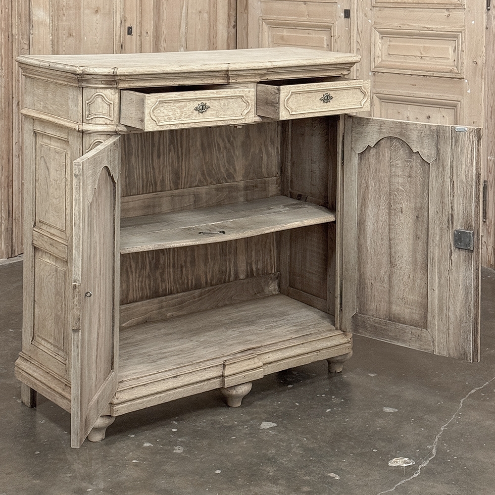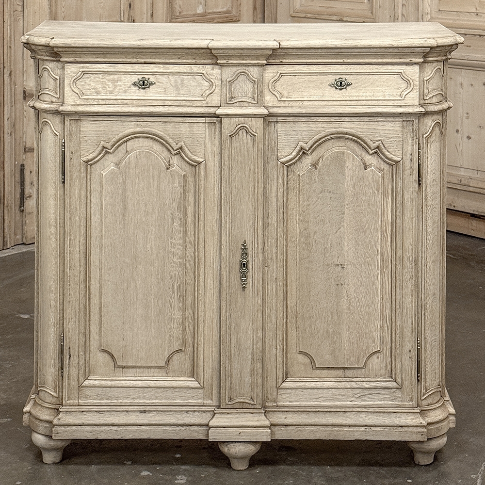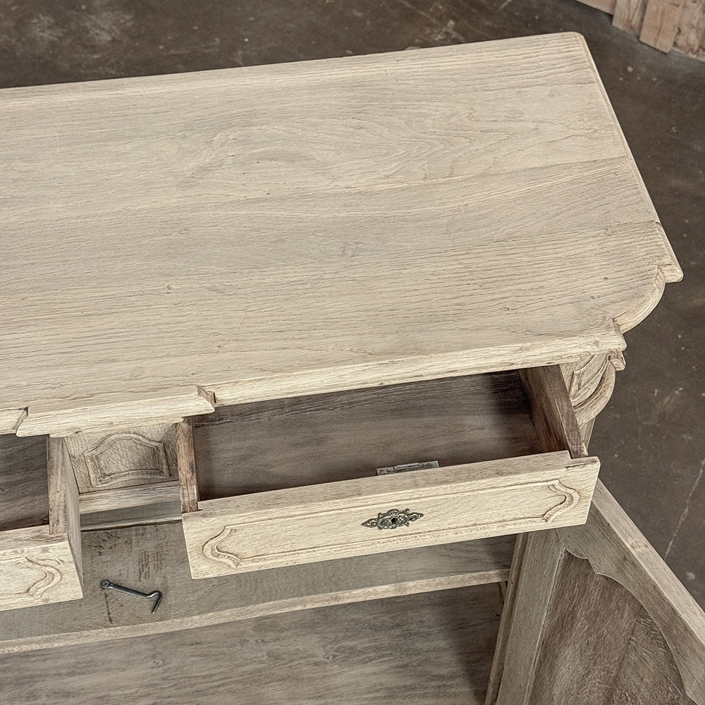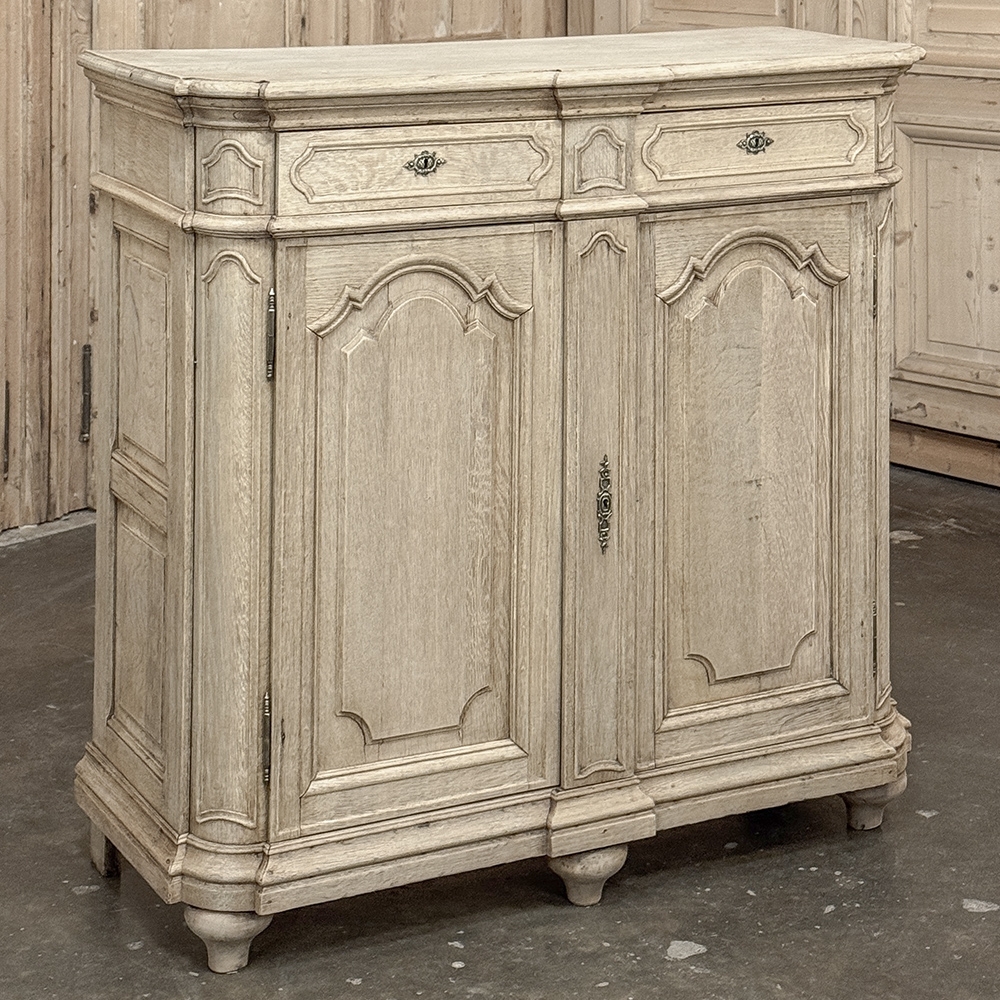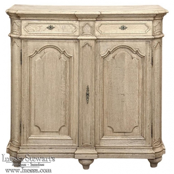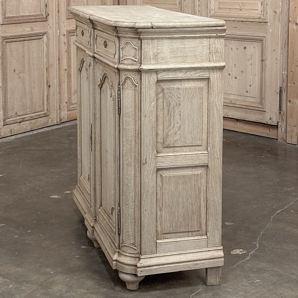 19th Century French Louis XIV 2-Door Buffet in Stripped Oak represents the essence of understated elegance! The refined architecture includes an almost square shape and shallow depth creating a piece that is well suited to cozy rooms, niches, or special spots on the wall. Note the attention to detail on the molding just under the solid plank top. Corners are rounded and mitered for a regal look, yet there exists no carved detail with the exception of the superlative molding on all sides, creating a stately yet restrained look. Add that to the subtle warmth of the old-growth oak revealed by our proprietary stripping process performed in house by our expert professionals. Cast brass key guards and brass barrel hinges complete the look, while on the inside of the drawers and cabinet doors there exists a surprising amount of storage for a piece not even a foot and a half deep!