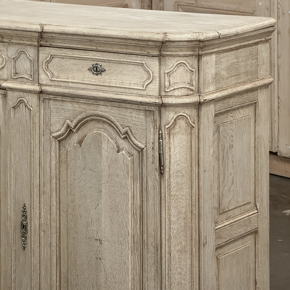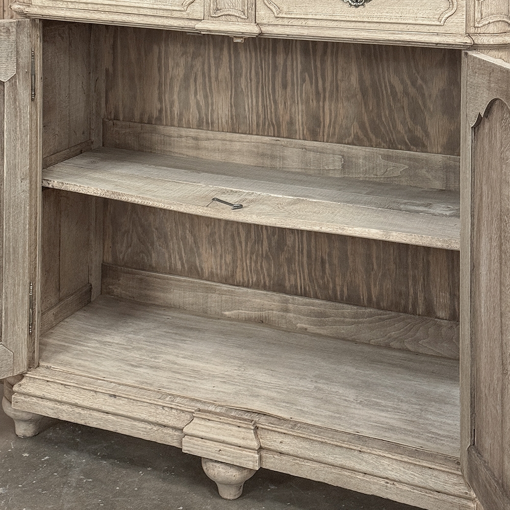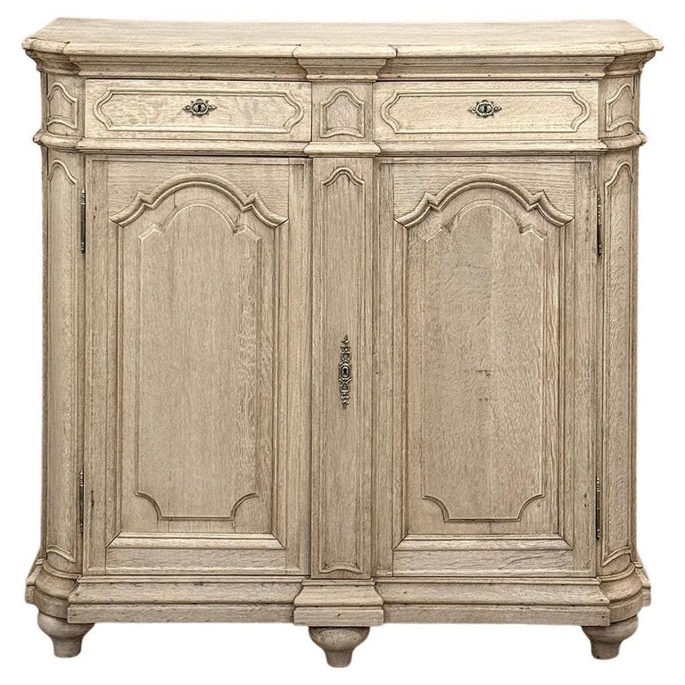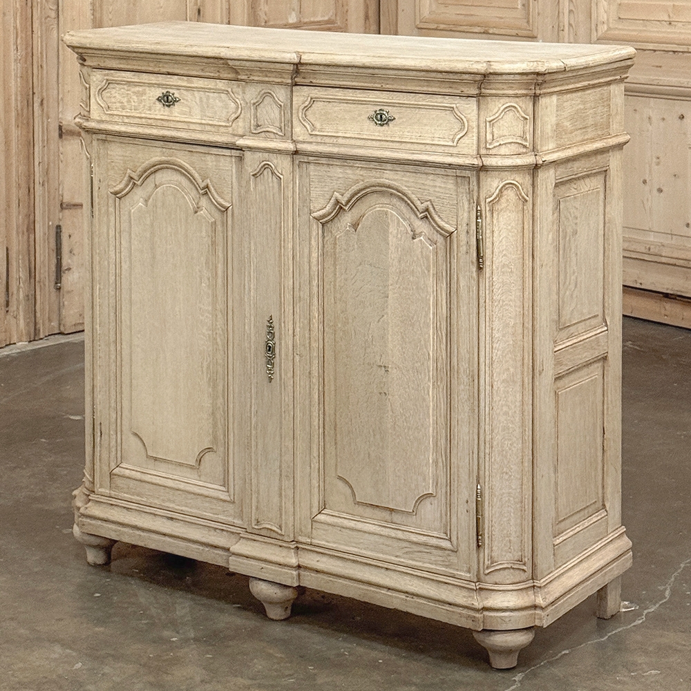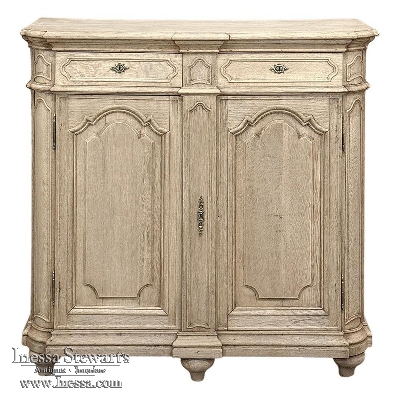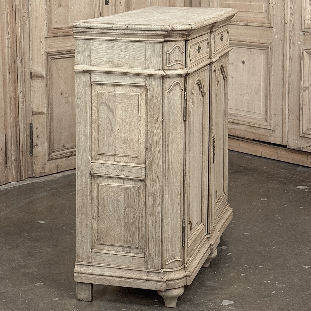 19th Century French Louis XIV 2-Door Buffet in Stripped Oak represents the essence of understated elegance! The refined architecture includes an almost square shape and shallow depth creating a piece that is well suited to cozy rooms, niches, or special spots on the wall. Note the attention to detail on the molding just under the solid plank top. Corners are rounded and mitered for a regal look, yet there exists no carved detail with the exception of the superlative molding on all sides, creating a stately yet restrained look. Add that to the subtle warmth of the old-growth oak revealed by our proprietary stripping process performed in house by our expert professionals. Cast brass key guards and brass barrel hinges complete the look, while on the inside of the drawers and cabinet doors there exists a surprising amount of storage for a piece not even a foot and a half deep!