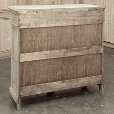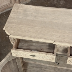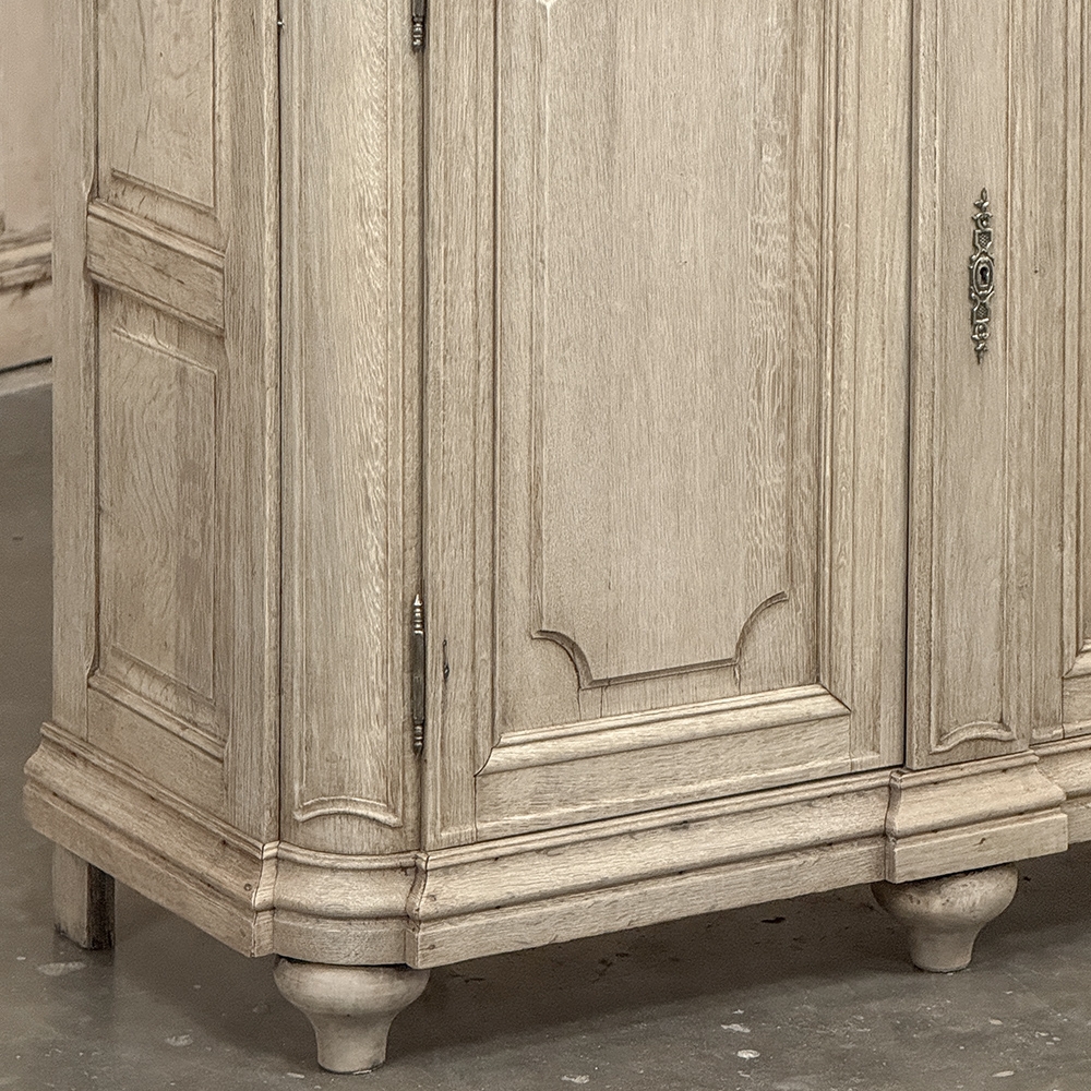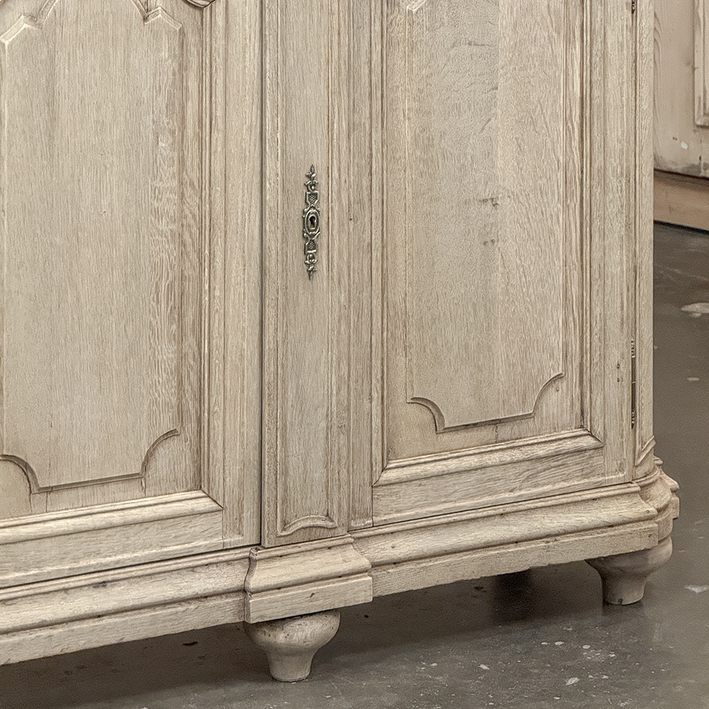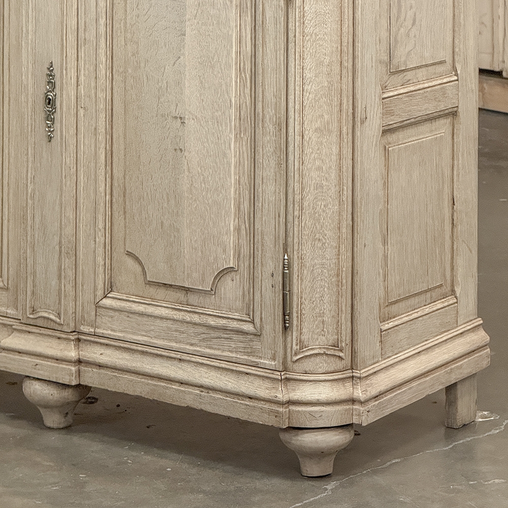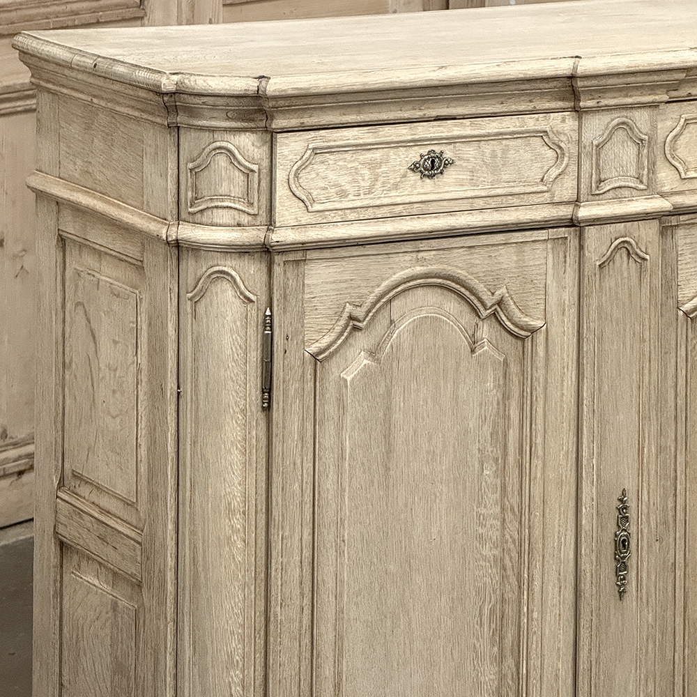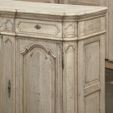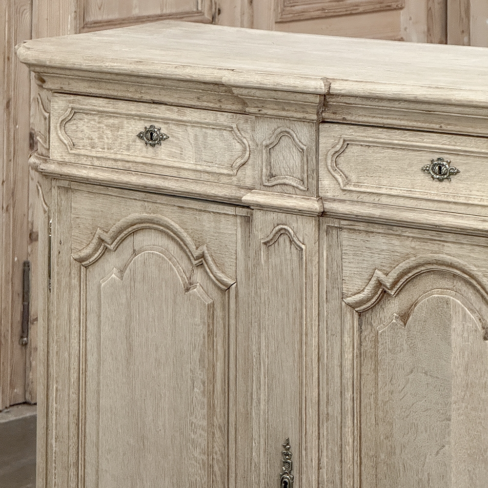 19th Century French Louis XIV 2-Door Buffet in Stripped Oak represents the essence of understated elegance! The refined architecture includes an almost square shape and shallow depth creating a piece that is well suited to cozy rooms, niches, or special spots on the wall. Note the attention to detail on the molding just under the solid plank top. Corners are rounded and mitered for a regal look, yet there exists no carved detail with the exception of the superlative molding on all sides, creating a stately yet restrained look. Add that to the subtle warmth of the old-growth oak revealed by our proprietary stripping process performed in house by our expert professionals. Cast brass key guards and brass barrel hinges complete the look, while on the inside of the drawers and cabinet doors there exists a surprising amount of storage for a piece not even a foot and a half deep!