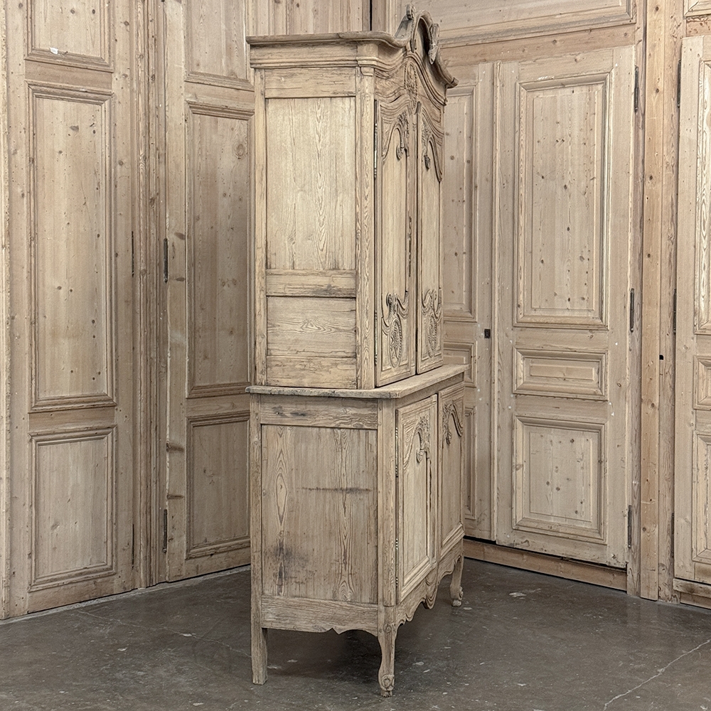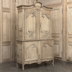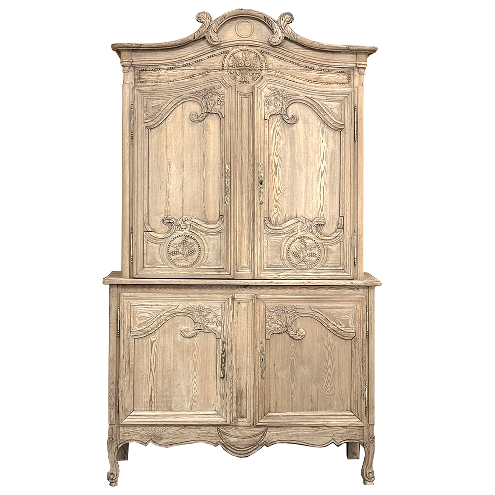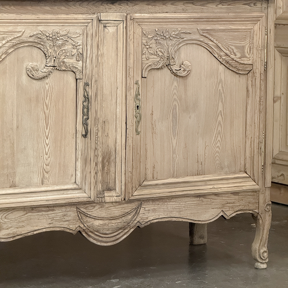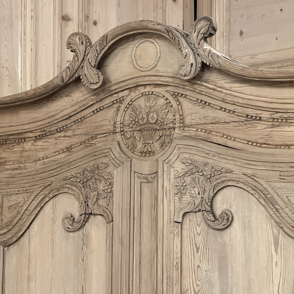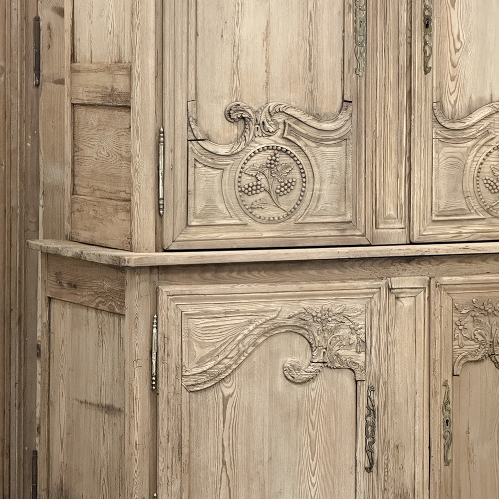 19th Century French Normandie Buffet a Deux Corps in Stripped Pine represents the essence of the rural masterpieces that emerged from this storied region of France over the past millennium. The style features a boldly arched crown in three parts connected by scrollwork carved with acanthus leaf motif. The bonnet below follows the same arched contour and is defined with beaded trim and centered with a signature bouquet of flowers in a basket. The arched upper tier doors are notched at the center to accommodate the roundel with the floral basket, and are themselves adorned with similar molding detail and complementary floral and foliate embellishments. The lower part of the doors boast yet another roundel with clusters of grapes on the vine. The lower cabinet features foreshortened versions of the upper doors without the lower embellishment, and all four doors are hung with brass barrel hinges and fitted with fancy brass key guards. The contoured apron is centered with a crescent moon blending into the scrolled legs with escargot feet. Doors open wide to reveal capacious storage, making this gem as functional as it is attractive. Completely hand-crafted from old-growth indigenous yellow pine, it has been stripped to reveal the character and warmth of the wood for a casual yet impressive visual statement!