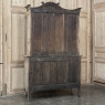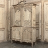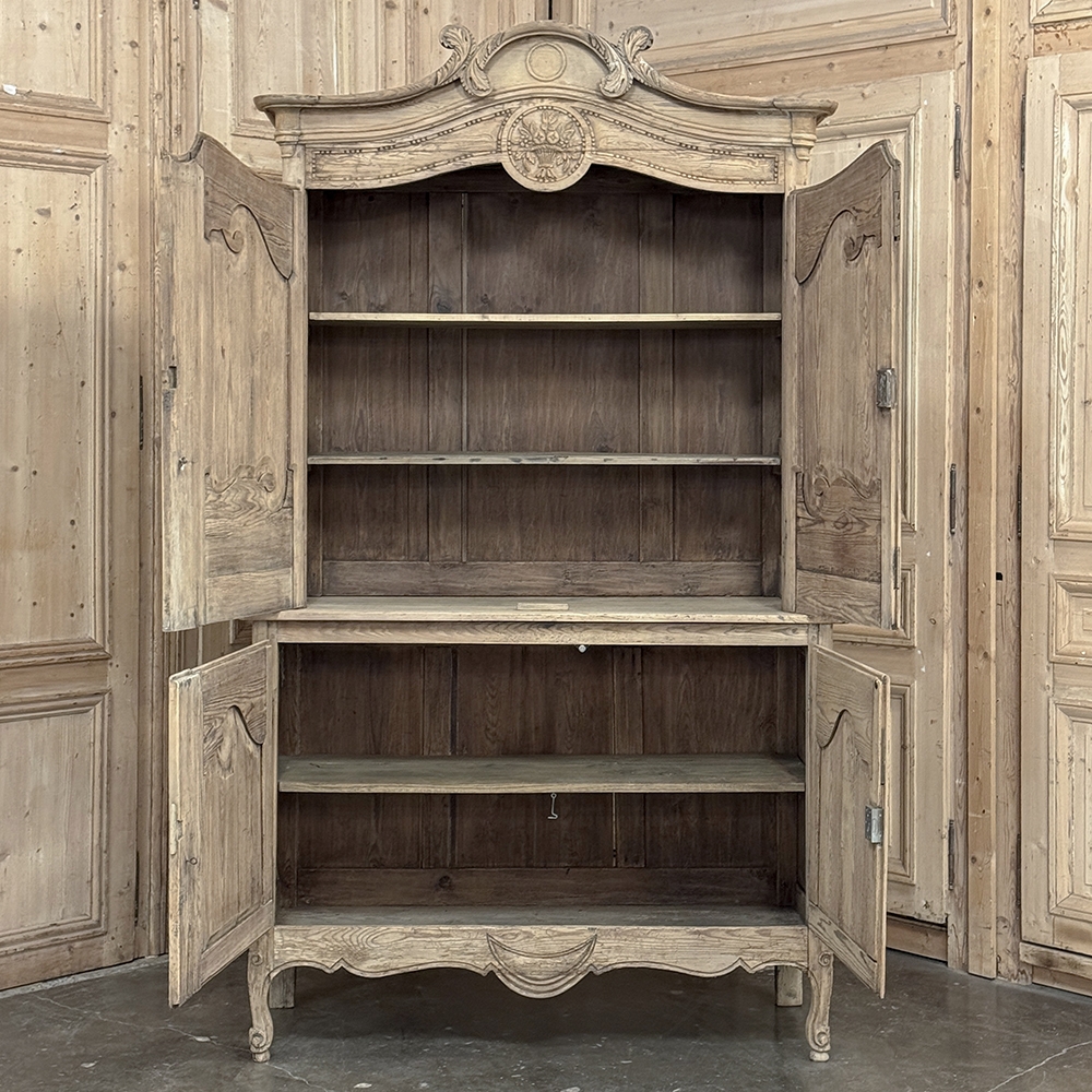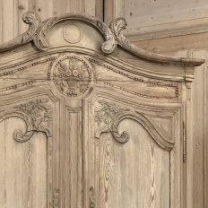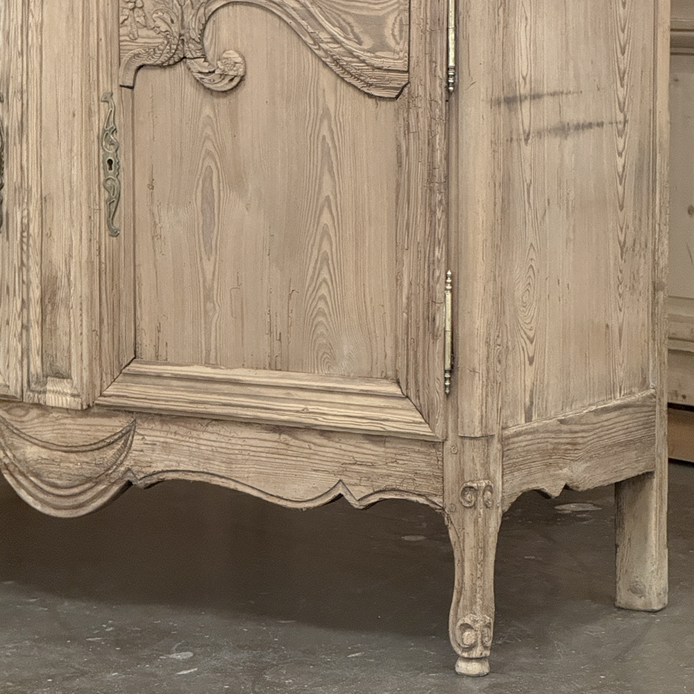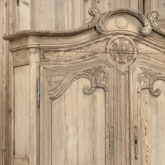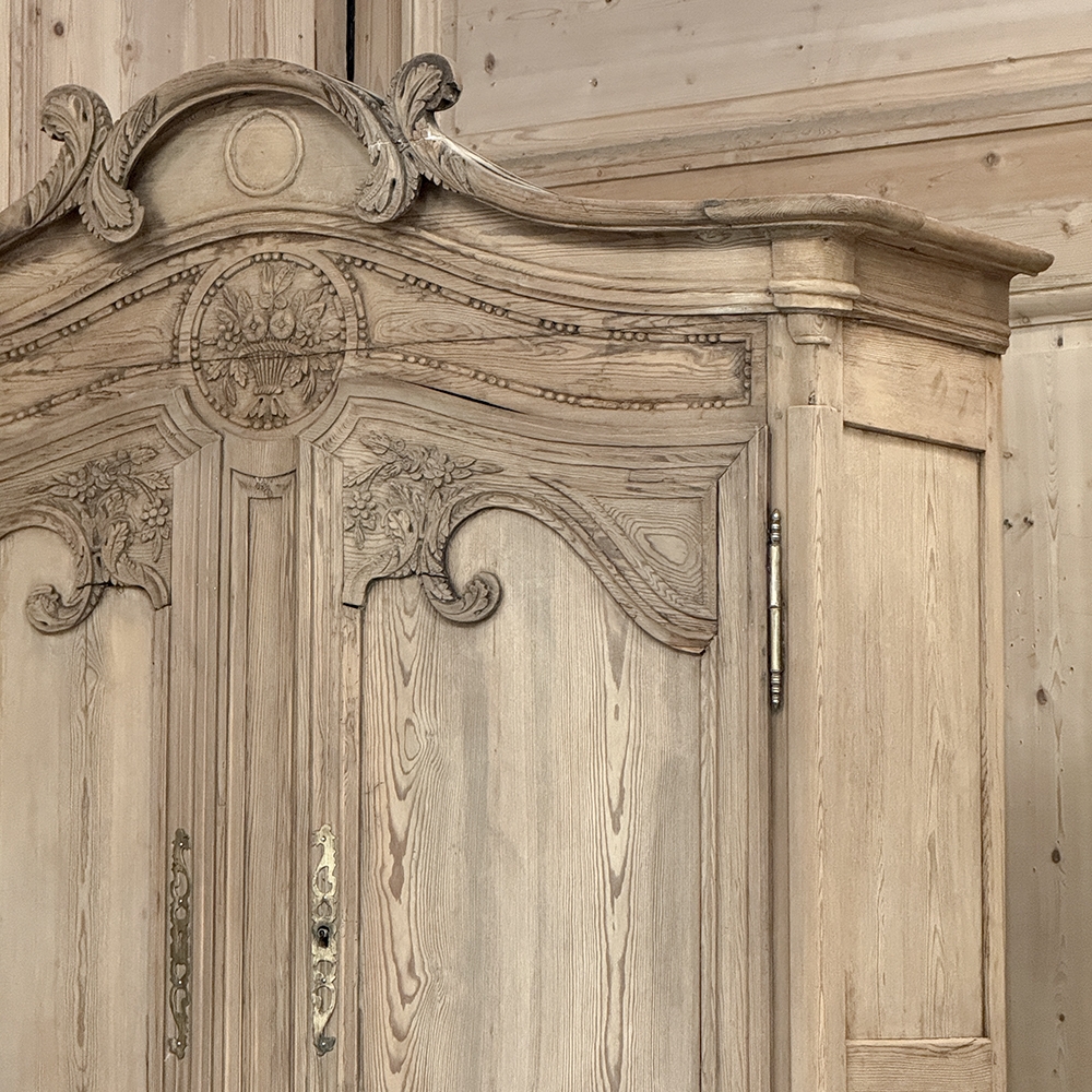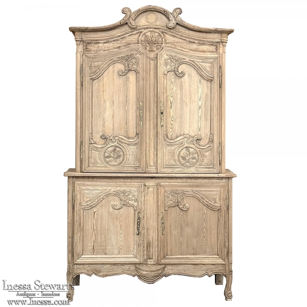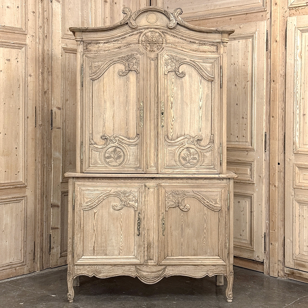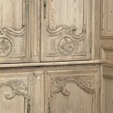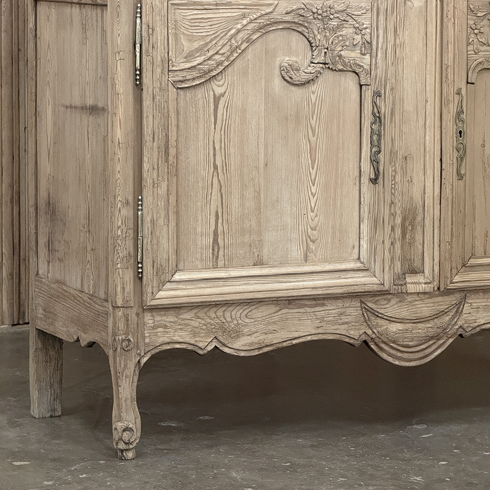 19th Century French Normandie Buffet a Deux Corps in Stripped Pine represents the essence of the rural masterpieces that emerged from this storied region of France over the past millennium. The style features a boldly arched crown in three parts connected by scrollwork carved with acanthus leaf motif. The bonnet below follows the same arched contour and is defined with beaded trim and centered with a signature bouquet of flowers in a basket. The arched upper tier doors are notched at the center to accommodate the roundel with the floral basket, and are themselves adorned with similar molding detail and complementary floral and foliate embellishments. The lower part of the doors boast yet another roundel with clusters of grapes on the vine. The lower cabinet features foreshortened versions of the upper doors without the lower embellishment, and all four doors are hung with brass barrel hinges and fitted with fancy brass key guards. The contoured apron is centered with a crescent moon blending into the scrolled legs with escargot feet. Doors open wide to reveal capacious storage, making this gem as functional as it is attractive. Completely hand-crafted from old-growth indigenous yellow pine, it has been stripped to reveal the character and warmth of the wood for a casual yet impressive visual statement!