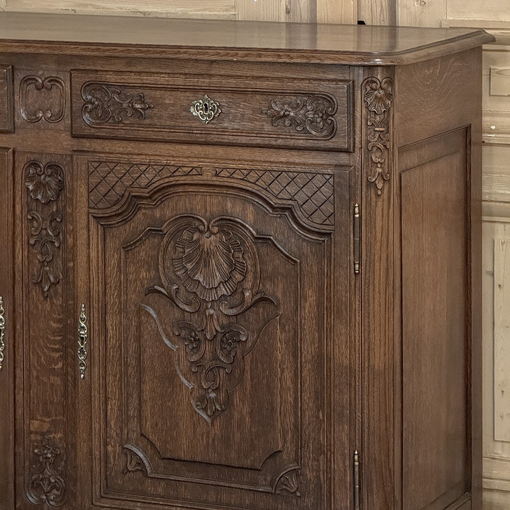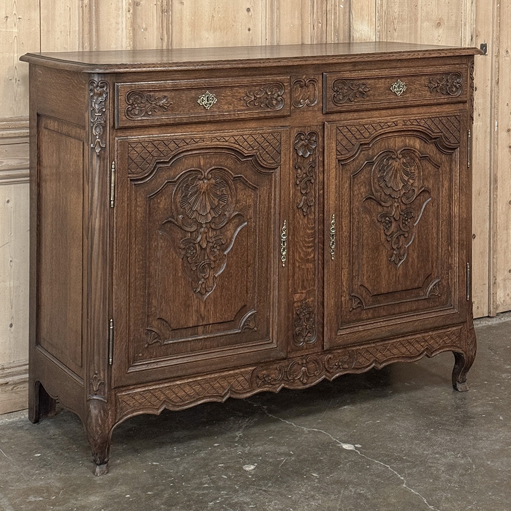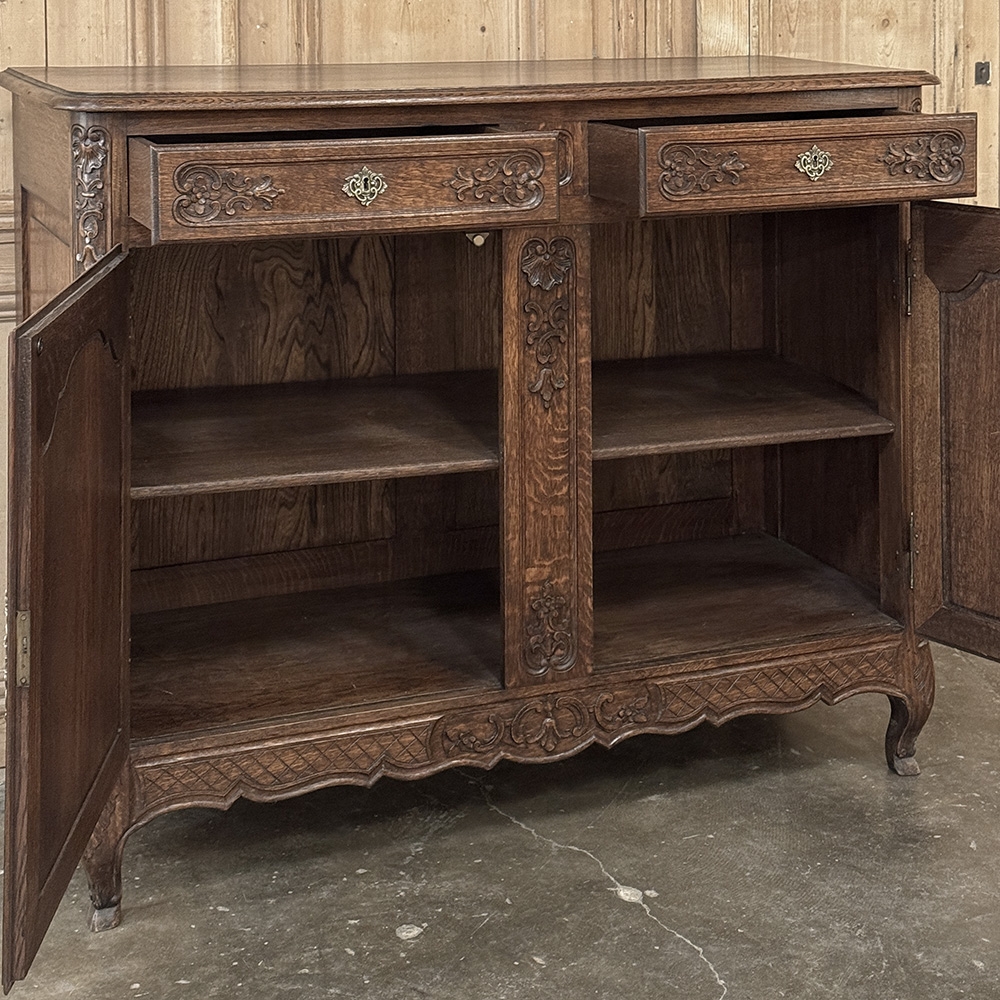 Antique Country French Louis XIV Oak Buffet is a combination of timeless styling and superb craftsmanship that you and your family will enjoy for generations! Hand-crafted from solid oak, its design includes two spacious drawers and a cavernous cabinet with shelf accessible by two doors. Carved detail includes shell, floral and foliate motifs with fine moldings and cross hatching for accent. Brass hinges and cast brass key guards add a nice touch. The finely contoured and carved apron below is supported by scrolled legs with hoof feet as a finishing touch.