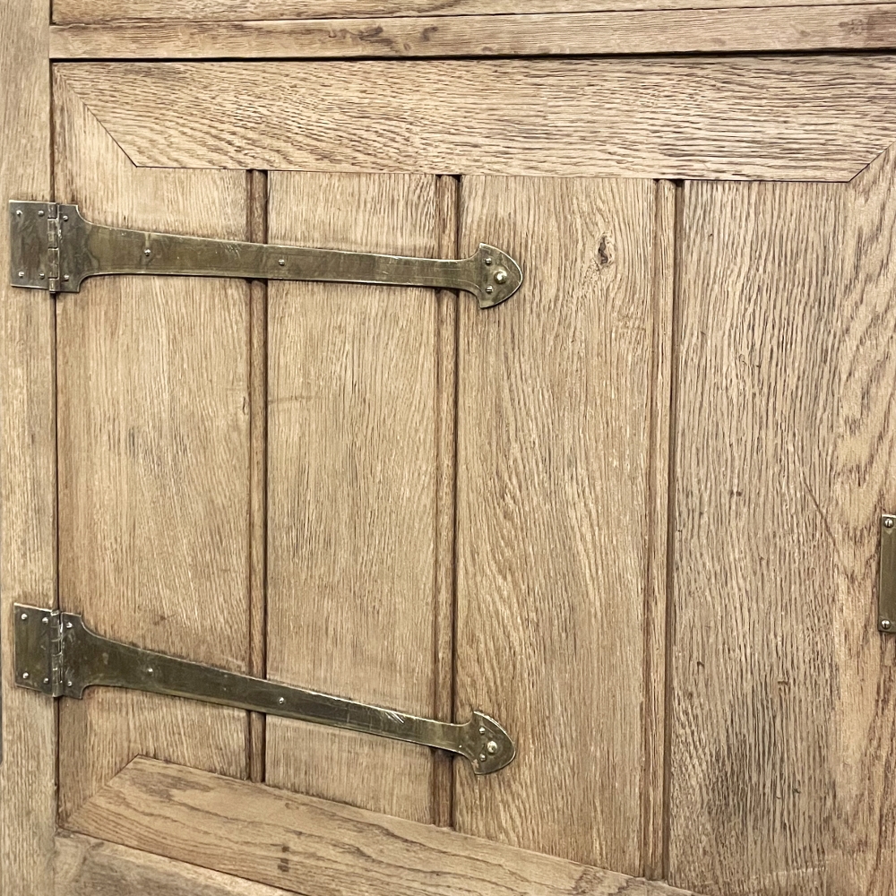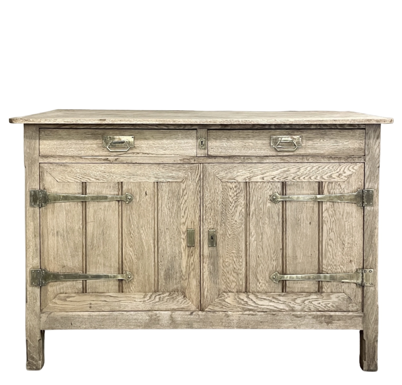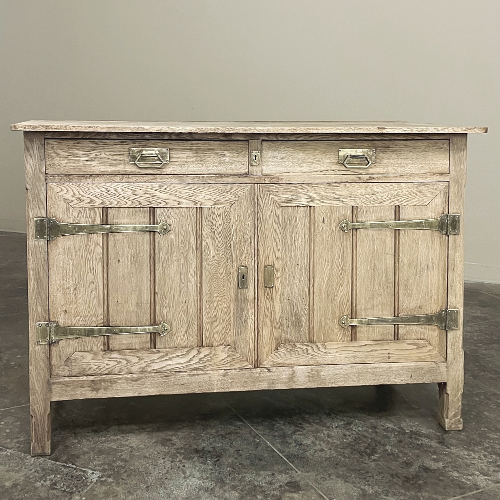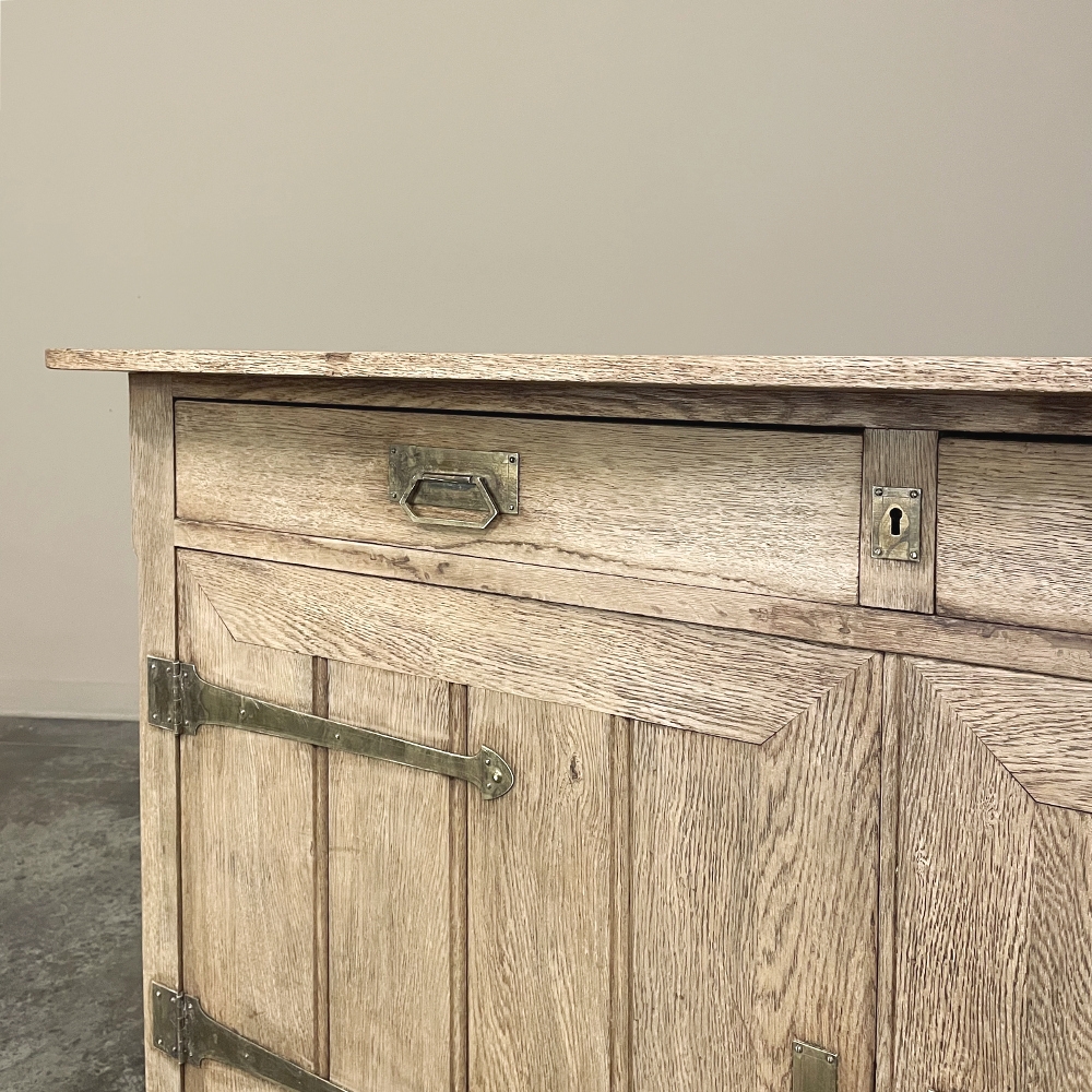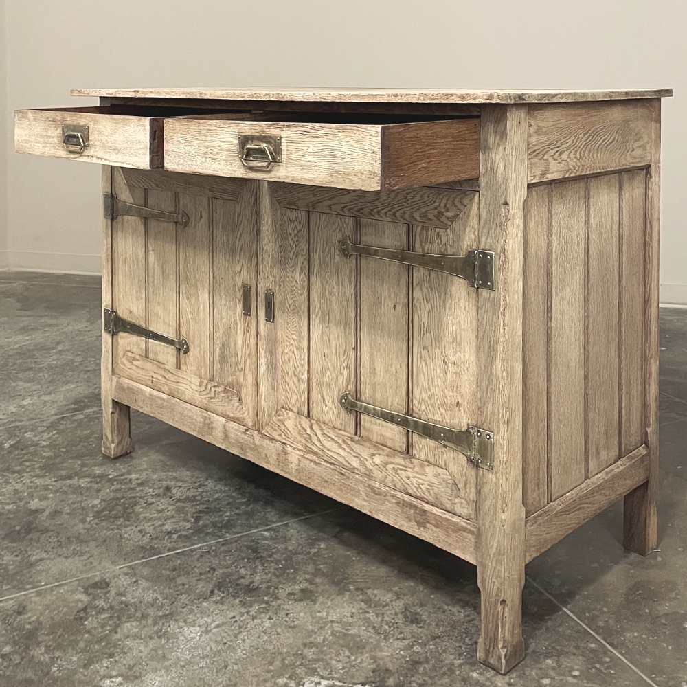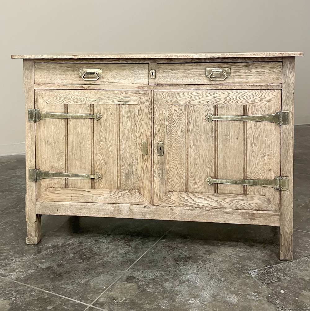 SaleAntique Gothic Arts & Crafts Period Stripped Oak Buffet ~ Credenza is a wonderful example of the period, wherein tailored lines and sturdy construction ruled the day, with sensible designs that were meant to be charmingly attractive yet exceptionally functional and very, very long lasting! Made from solid planks of quarter-sawn oak, it features a plank top and framework, with cabinet doors made from tongue & groove vertical planks crossed by the extended heart-pointed brass strap hinges that, when combined with the brass key guards and drawer pulls, create just the right amount of visual accent while performing yeoman's duty. Drawers are very roomy, and the cabinets open to reveal a large storage space that is very easy to access. Our proprietary stripping process has revealed the natural beauty of the wood while retaining the patina that has enhanced it over the course of the last century!