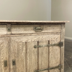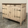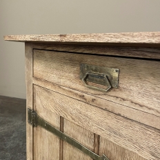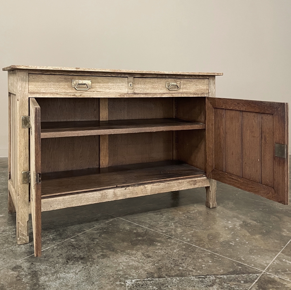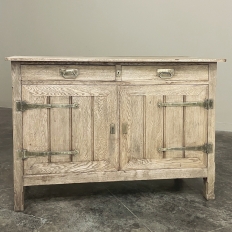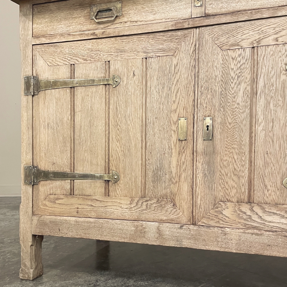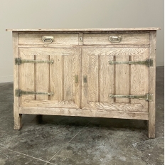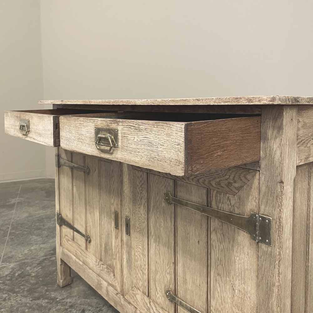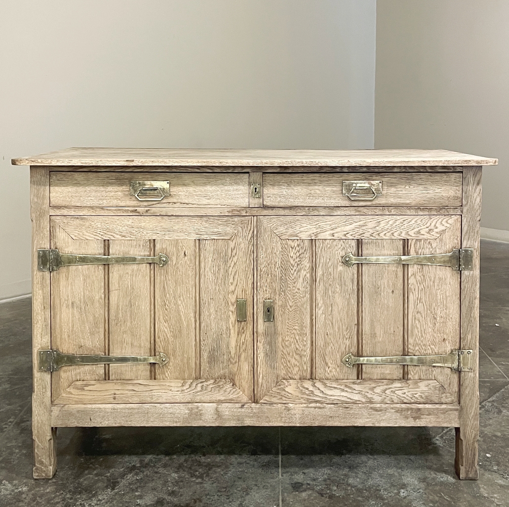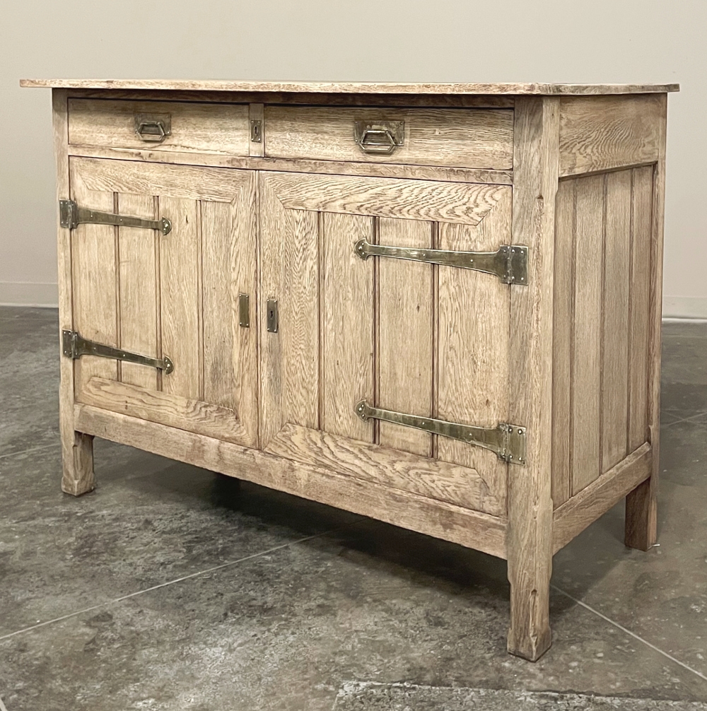 SaleAntique Gothic Arts & Crafts Period Stripped Oak Buffet ~ Credenza is a wonderful example of the period, wherein tailored lines and sturdy construction ruled the day, with sensible designs that were meant to be charmingly attractive yet exceptionally functional and very, very long lasting! Made from solid planks of quarter-sawn oak, it features a plank top and framework, with cabinet doors made from tongue & groove vertical planks crossed by the extended heart-pointed brass strap hinges that, when combined with the brass key guards and drawer pulls, create just the right amount of visual accent while performing yeoman's duty. Drawers are very roomy, and the cabinets open to reveal a large storage space that is very easy to access. Our proprietary stripping process has revealed the natural beauty of the wood while retaining the patina that has enhanced it over the course of the last century!