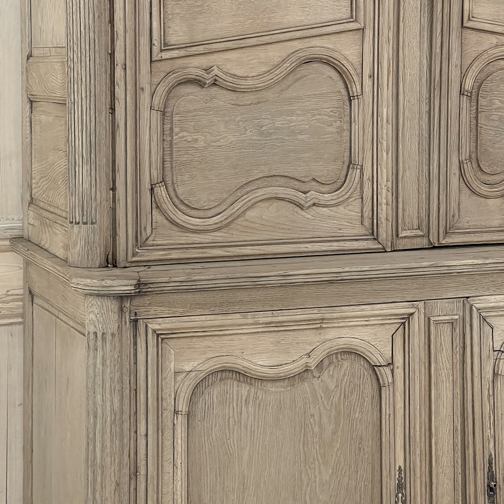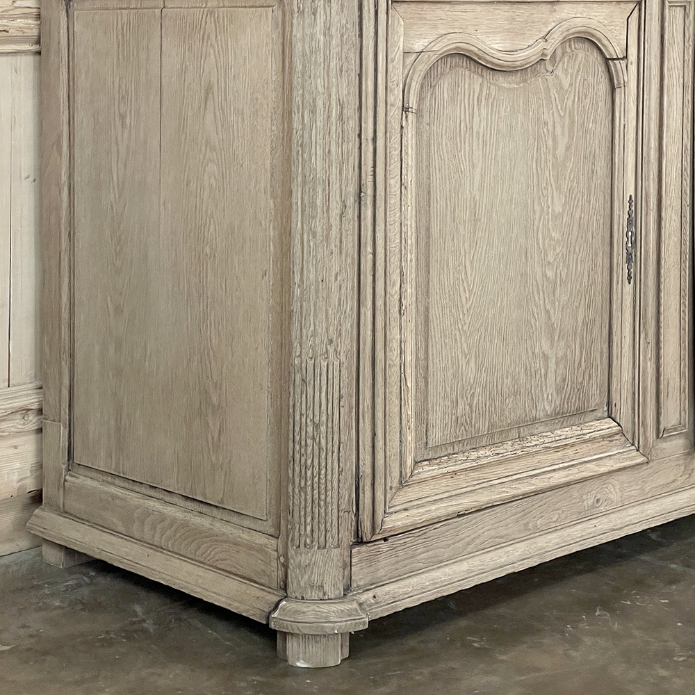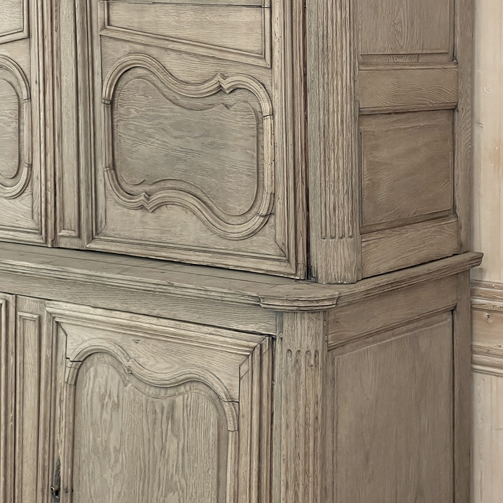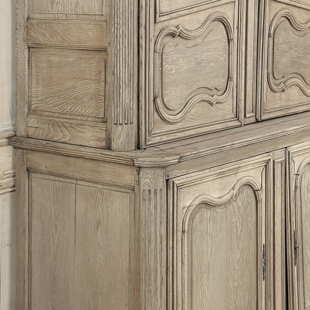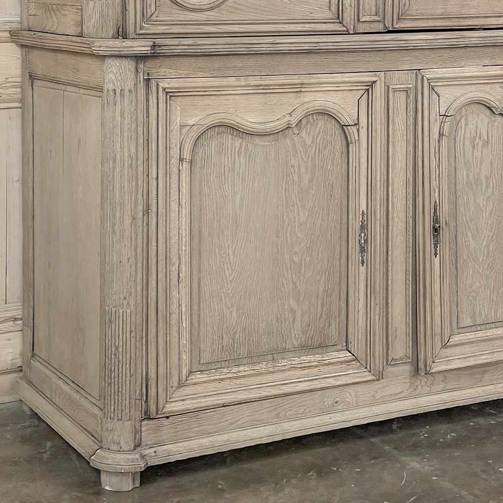 SaleGrand 18th Century Country French Buffet a Deux Corps in Stripped Oak was rendered from dense, old-growth oak, and features a stately presence with a staid architectural form that emphasizes tailored frameworks around oriented panels for an understated elegance. The upper tier is removable for transport. Both upper and lower cabinet doors open to reveal a capacious interior free of center stiles, to create the perfect place for storage galore. Rounded cornerposts are fluted and reeded for a nice touch. Exquisitely executed hand-sculpted molding detail throughout the design are unmistakably French, as well as of the highest quality and craftsmanship. Bold crown molding above and chamfered panels on the sides complete the look.