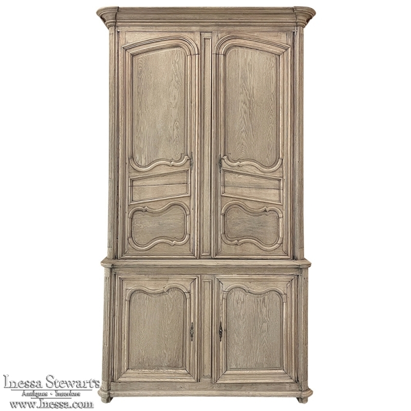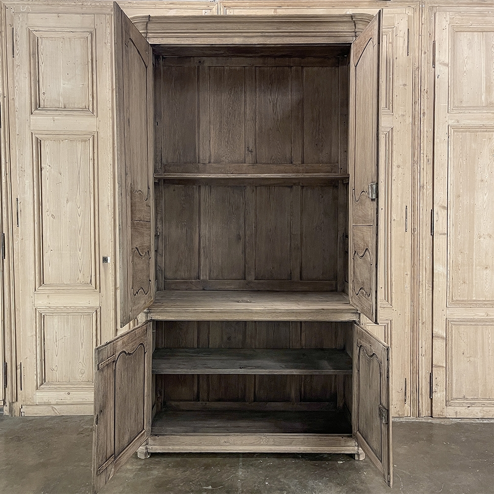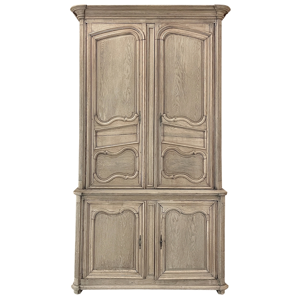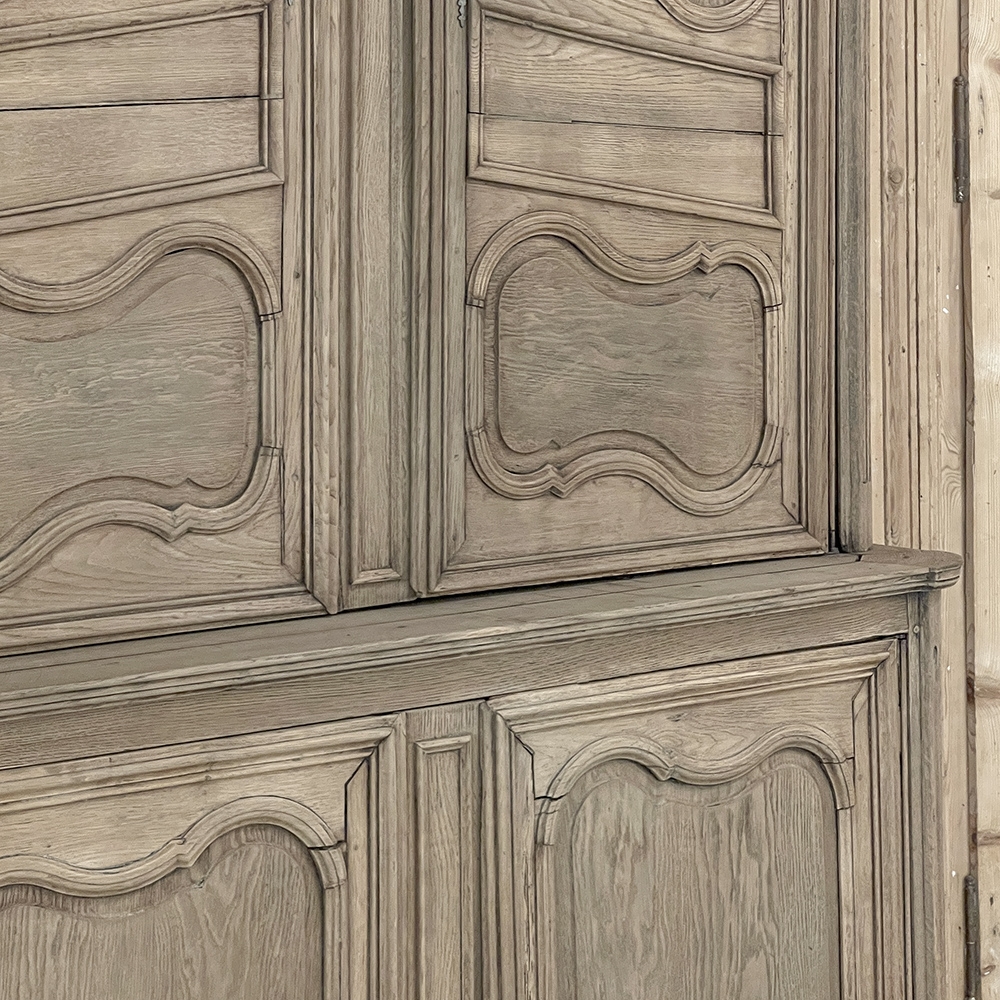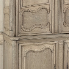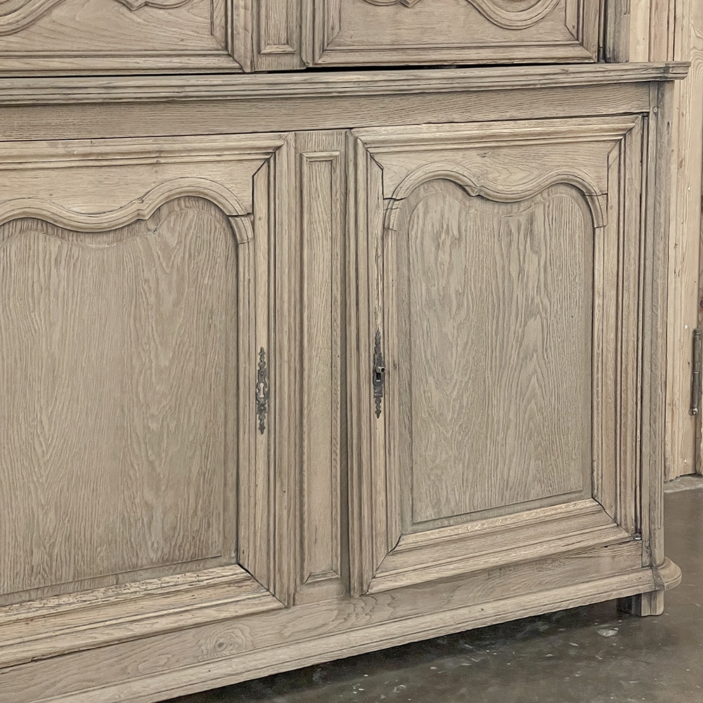 SaleGrand 18th Century Country French Buffet a Deux Corps in Stripped Oak was rendered from dense, old-growth oak, and features a stately presence with a staid architectural form that emphasizes tailored frameworks around oriented panels for an understated elegance. The upper tier is removable for transport. Both upper and lower cabinet doors open to reveal a capacious interior free of center stiles, to create the perfect place for storage galore. Rounded cornerposts are fluted and reeded for a nice touch. Exquisitely executed hand-sculpted molding detail throughout the design are unmistakably French, as well as of the highest quality and craftsmanship. Bold crown molding above and chamfered panels on the sides complete the look.