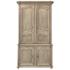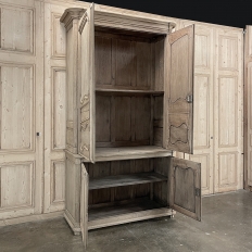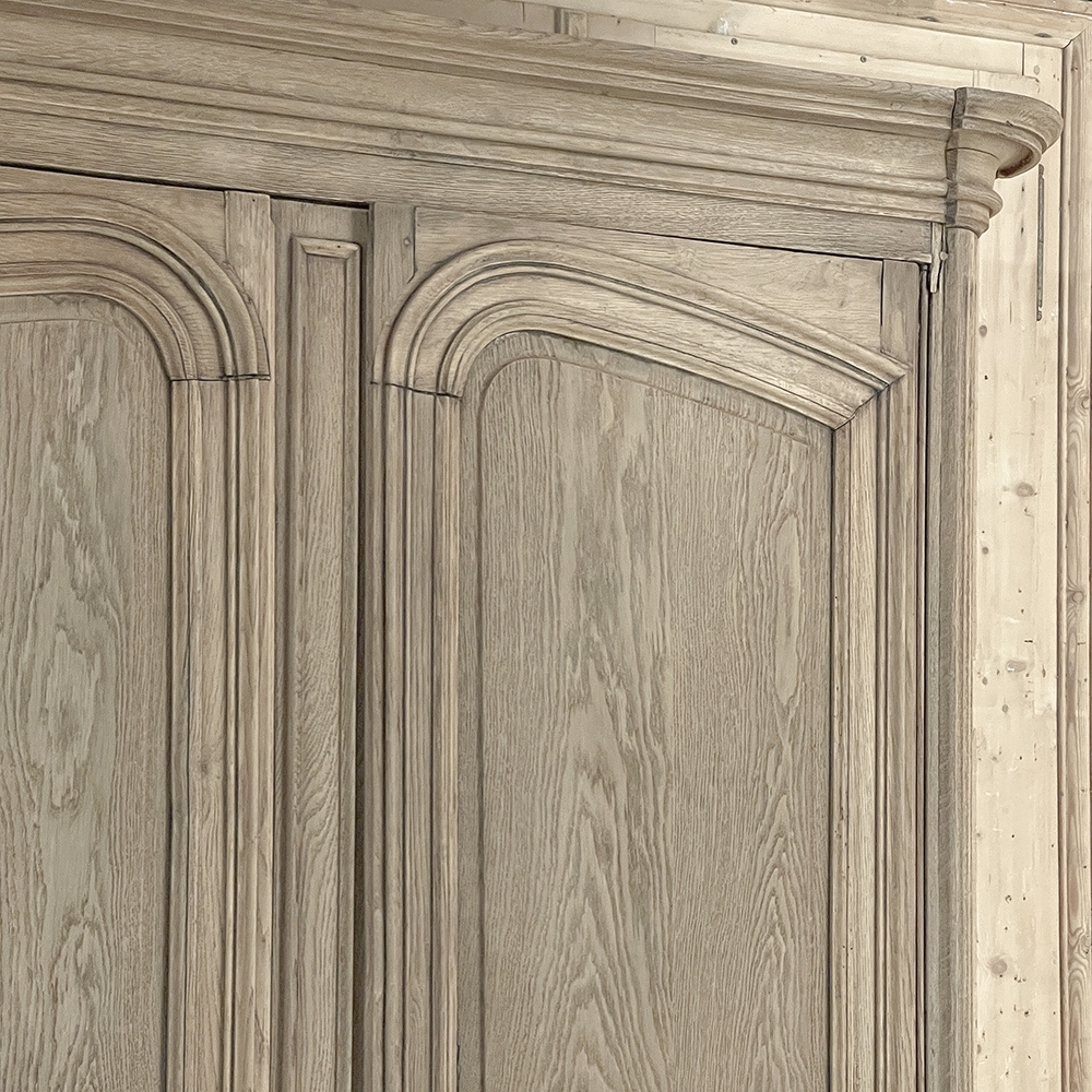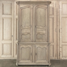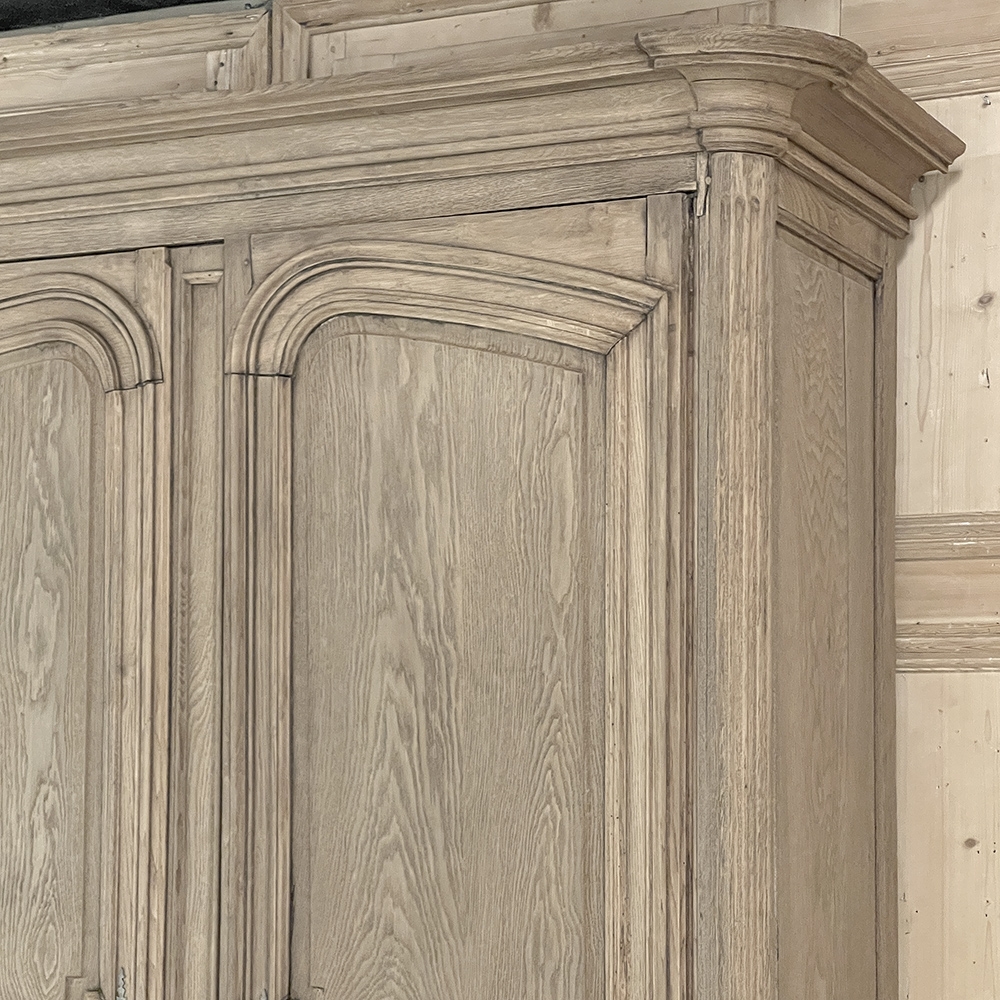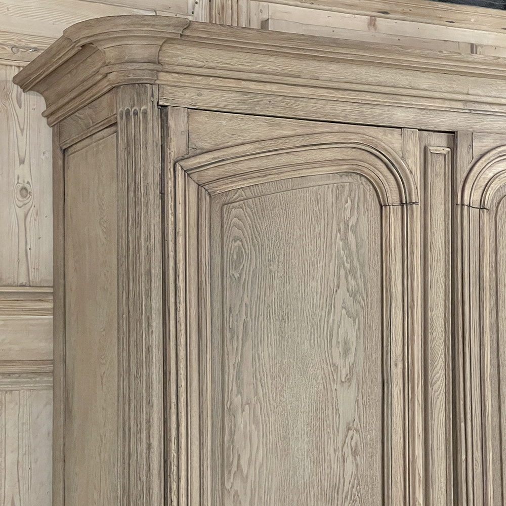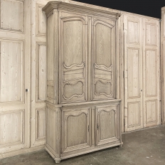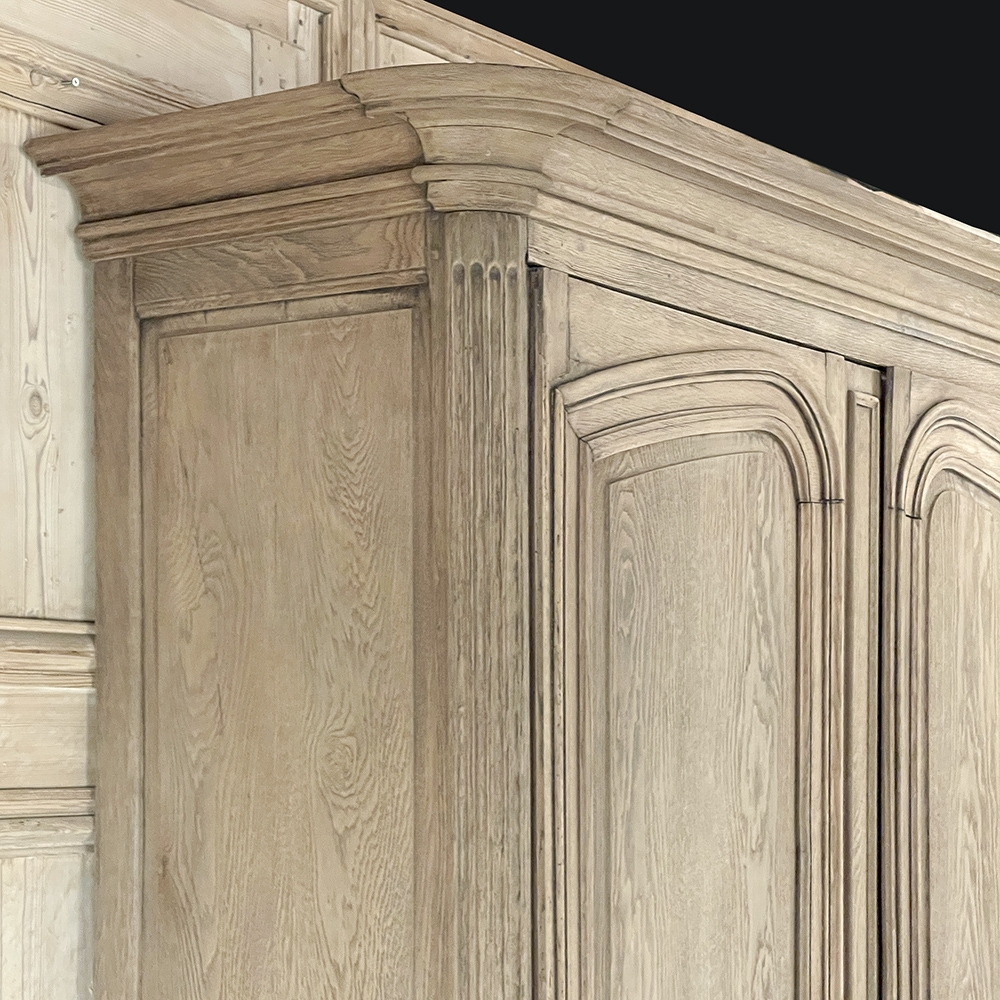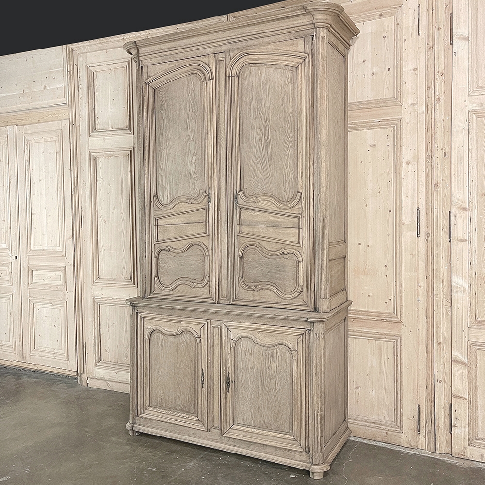 SaleGrand 18th Century Country French Buffet a Deux Corps in Stripped Oak was rendered from dense, old-growth oak, and features a stately presence with a staid architectural form that emphasizes tailored frameworks around oriented panels for an understated elegance. The upper tier is removable for transport. Both upper and lower cabinet doors open to reveal a capacious interior free of center stiles, to create the perfect place for storage galore. Rounded cornerposts are fluted and reeded for a nice touch. Exquisitely executed hand-sculpted molding detail throughout the design are unmistakably French, as well as of the highest quality and craftsmanship. Bold crown molding above and chamfered panels on the sides complete the look.