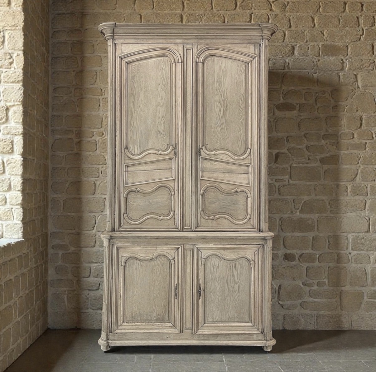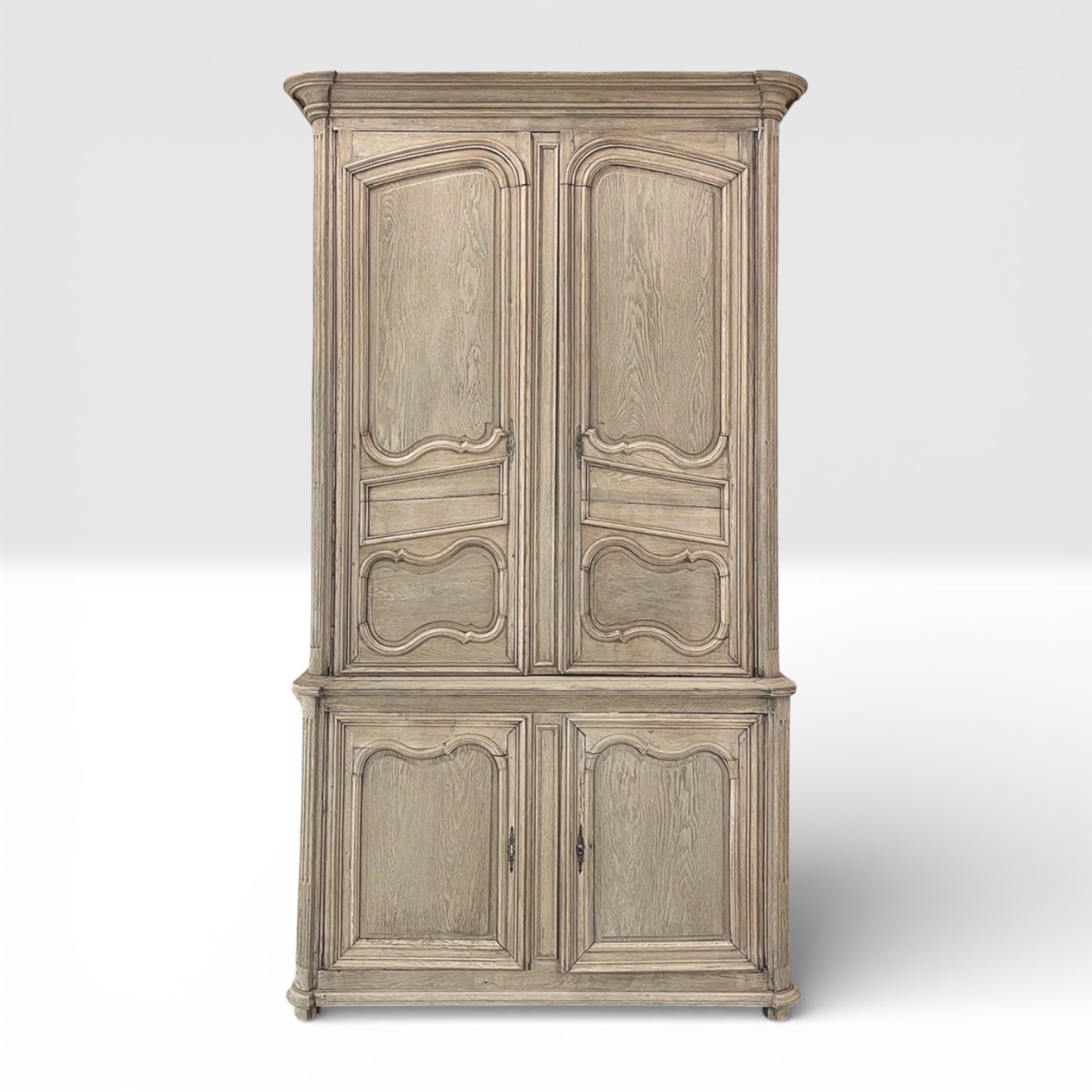 Rendered from dense, old-growth oak and presented in a beautifully stripped finish, the wood reveals its natural character and soft tonal variation. The disciplined symmetry of the paneling, the gently contoured door frames, and the refined molding details embody the measured grace of 18th century French design. Fluted and reeded cornerposts introduce a subtle classical influence, reinforcing the heritage of the period.