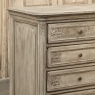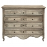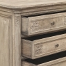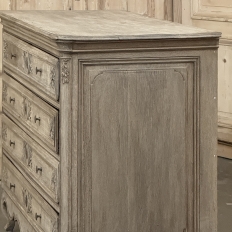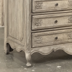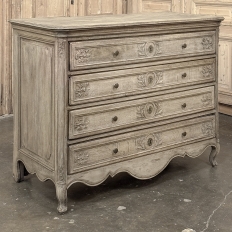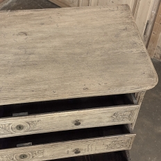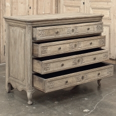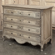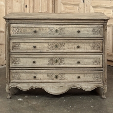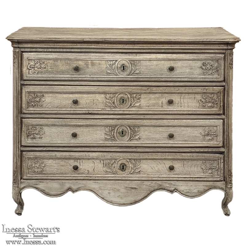 18th Century Country French Louis XVI Commode ~ Chest of Drawers in Stripped Oak was designed to store all the foldable clothes for the master or mistress of the home! Hand-crafted from old-growth oak, it features a neoclassical style popular during the period in keeping with the tastes of the court of Louis XVI. Carved embellishment consists of wildflower and foliate themes accented by cast brass knobs and key guards, with complementary carvings on the rounded corner posts. As a transitional gesture, a tailored scrolled apron appears at the front and each side with scrolled, unadorned legs. Painstakingly stripped using our proprietary process that retains the patina and sheer natural beauty of the old wood, all performed by our expert in-house staff.