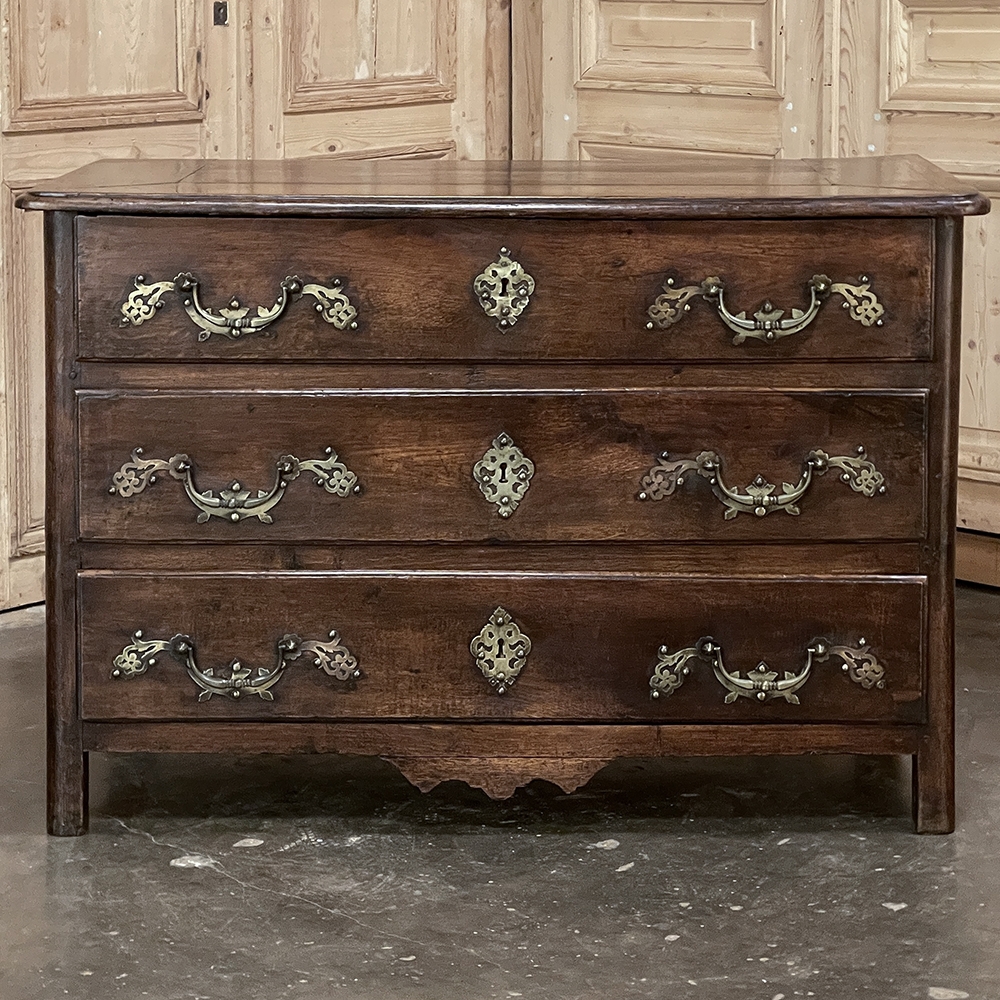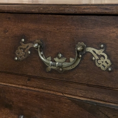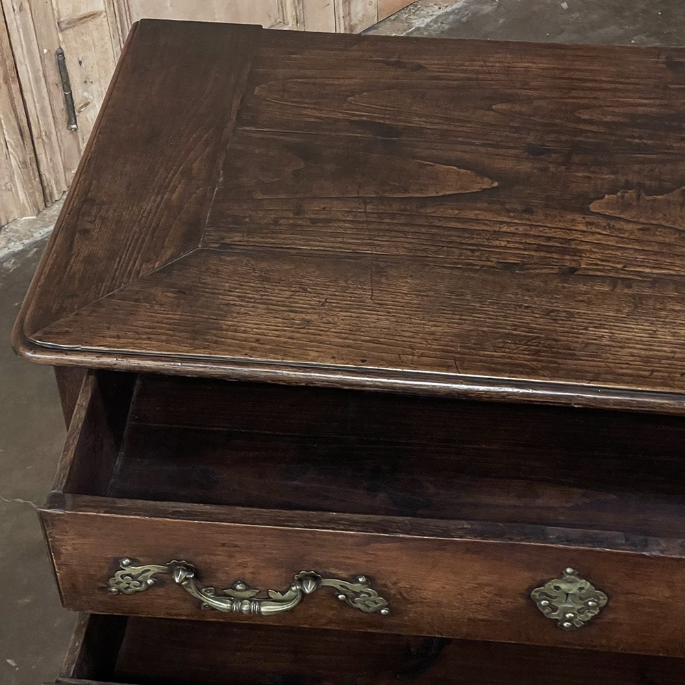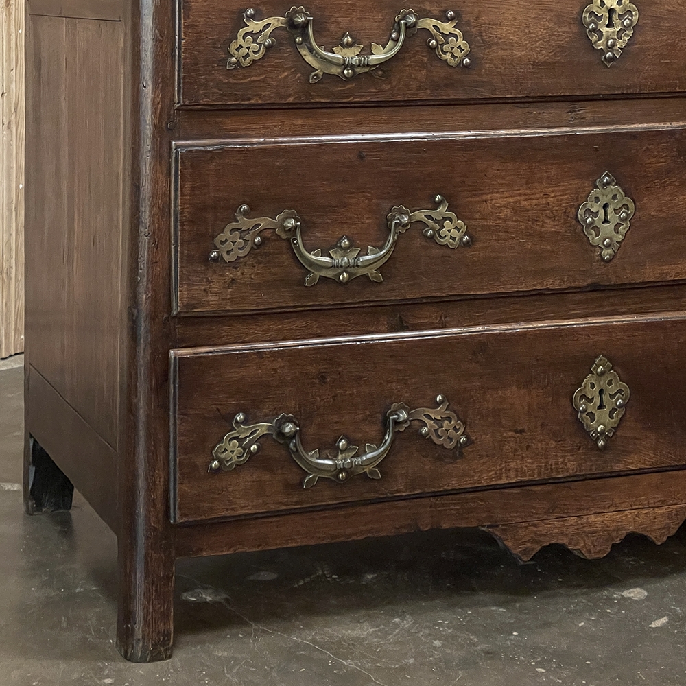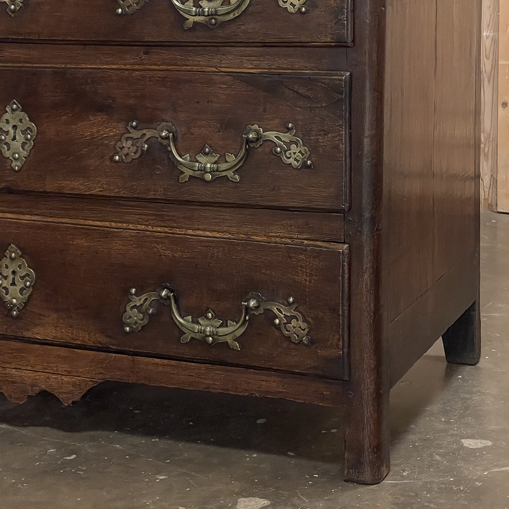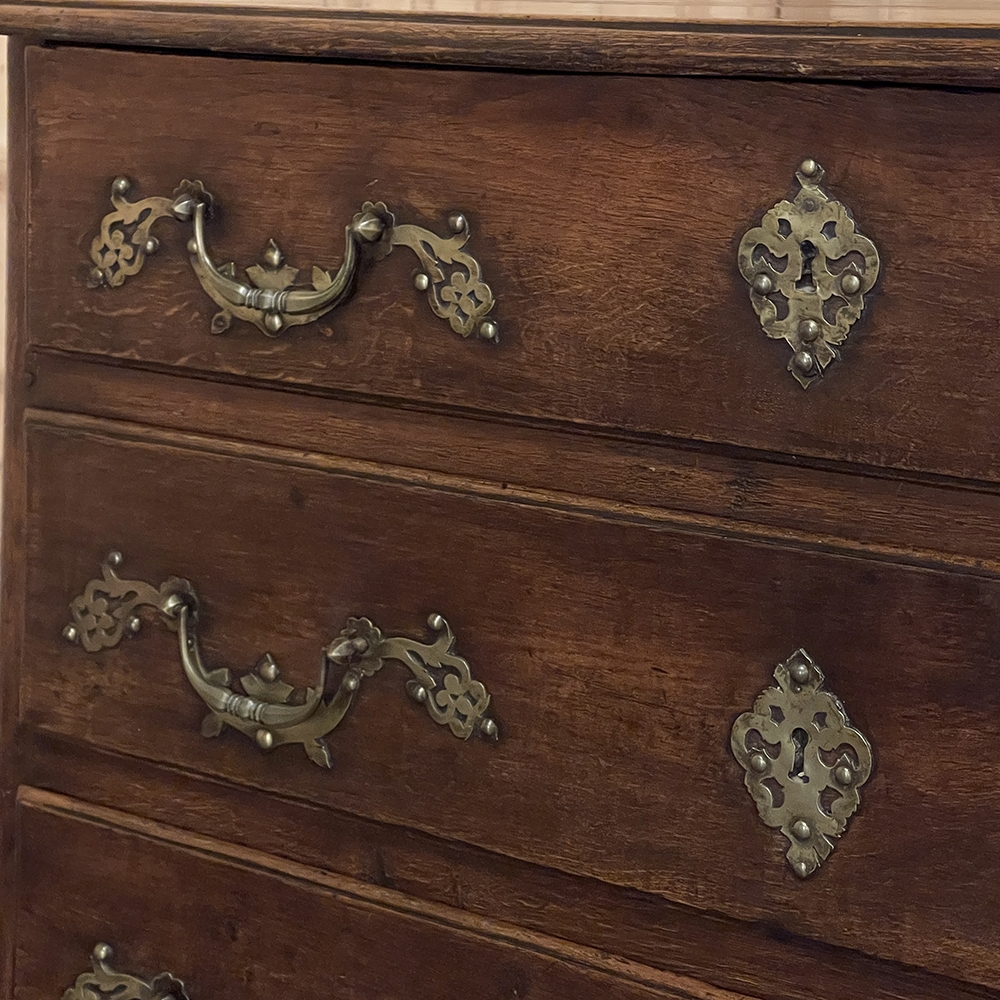 Sale18th Century Country French Style Dutch Chest of Drawers is a masterpiece of form over function! Hand-crafted from thick planks of old-growth oak and fruitwoods, it features deep, spacious drawers for lots of storage opportunities. The solid plank top is framed by deep planks with a beveled edge all around, and four solid posts form the corners and provide a framework for the design. Solid panels on each side and even the back are connected with double-pegged mortise & tenon joinery. The facade is adorned with a modest carving on the apron below, and lavish, elegant cast brass bale pulls with distinctive guards coupled with finely crafted pierced key guards for a regal touch. Literally designed to last for generations!