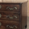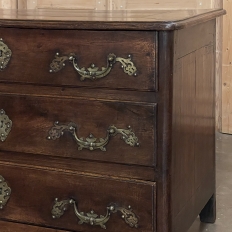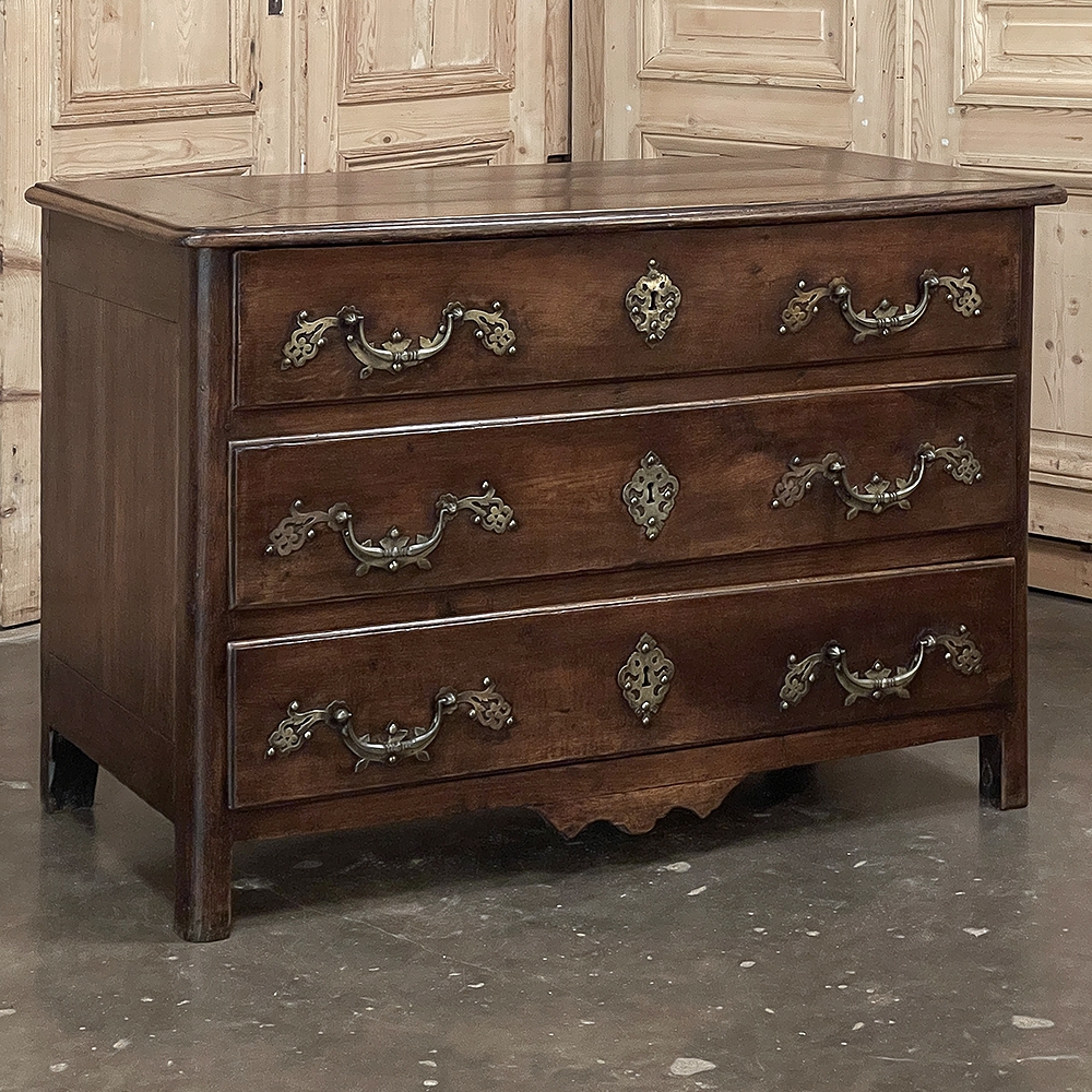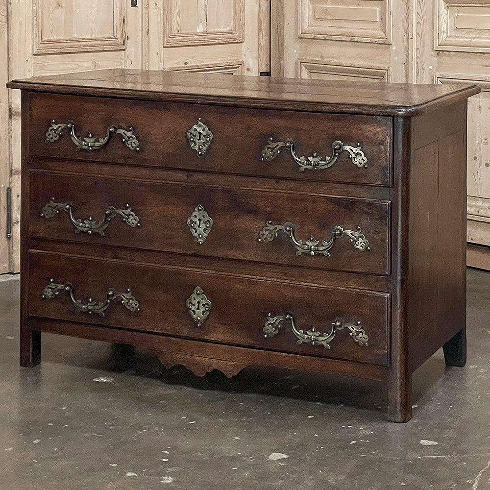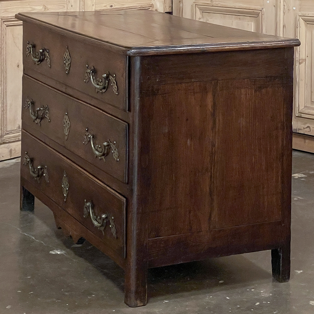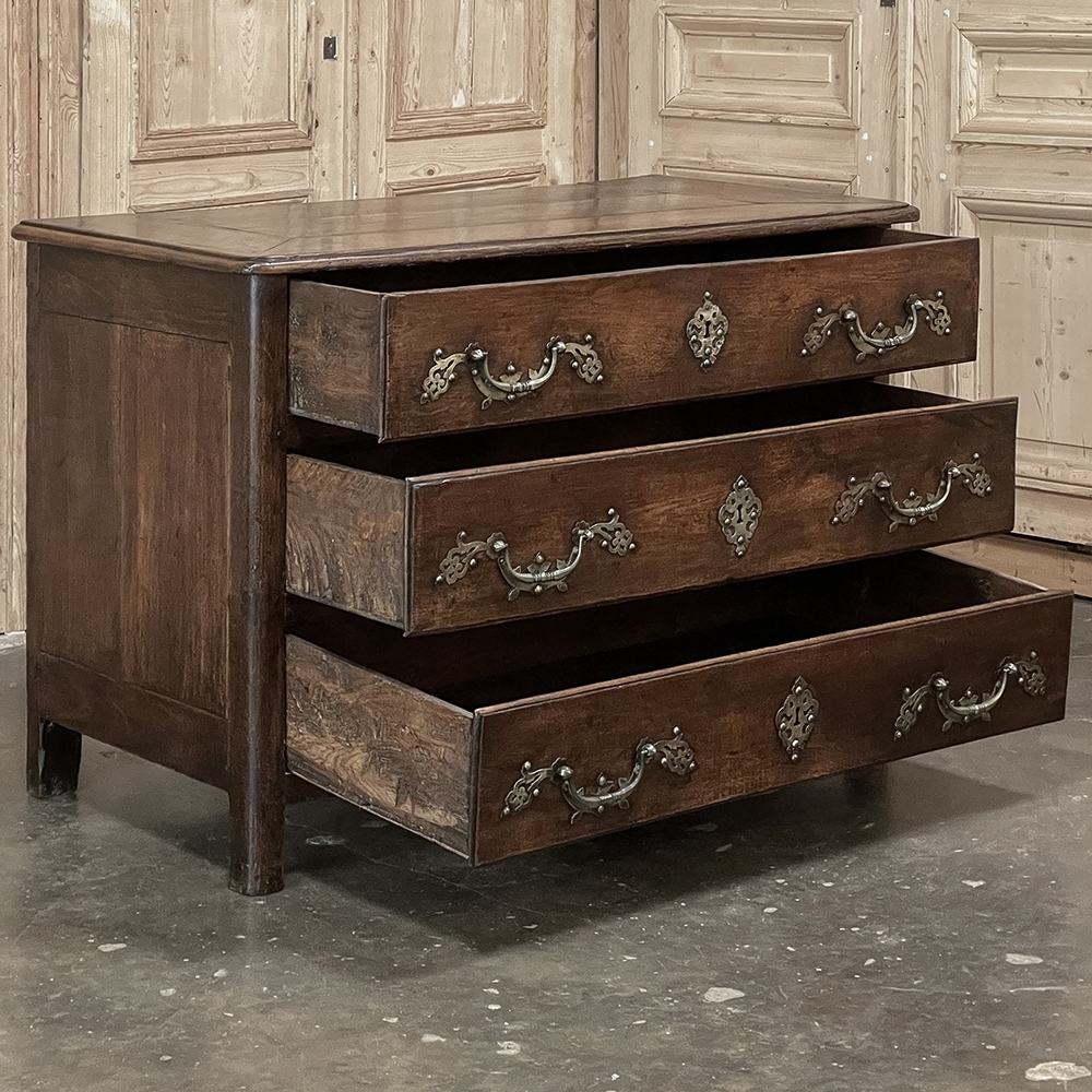 Sale18th Century Country French Style Dutch Chest of Drawers is a masterpiece of form over function! Hand-crafted from thick planks of old-growth oak and fruitwoods, it features deep, spacious drawers for lots of storage opportunities. The solid plank top is framed by deep planks with a beveled edge all around, and four solid posts form the corners and provide a framework for the design. Solid panels on each side and even the back are connected with double-pegged mortise & tenon joinery. The facade is adorned with a modest carving on the apron below, and lavish, elegant cast brass bale pulls with distinctive guards coupled with finely crafted pierced key guards for a regal touch. Literally designed to last for generations!