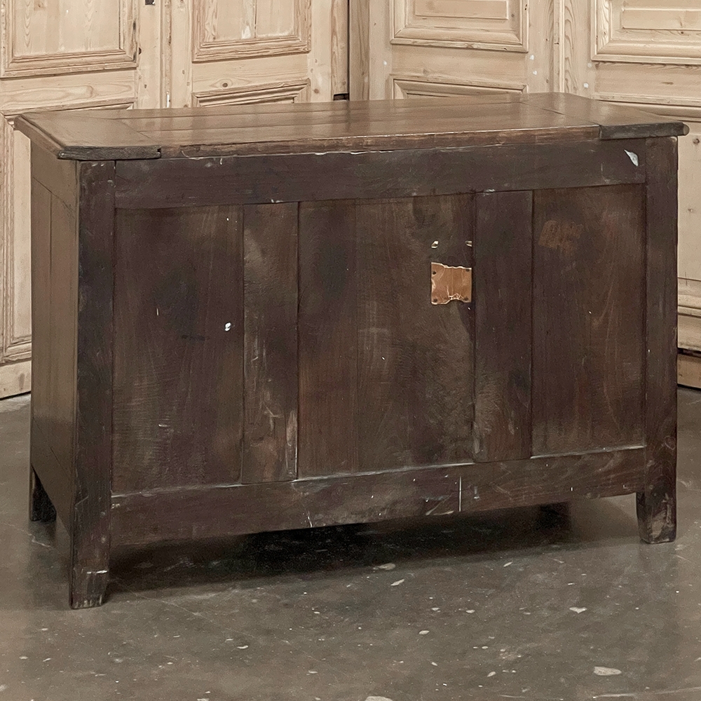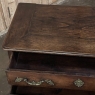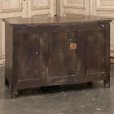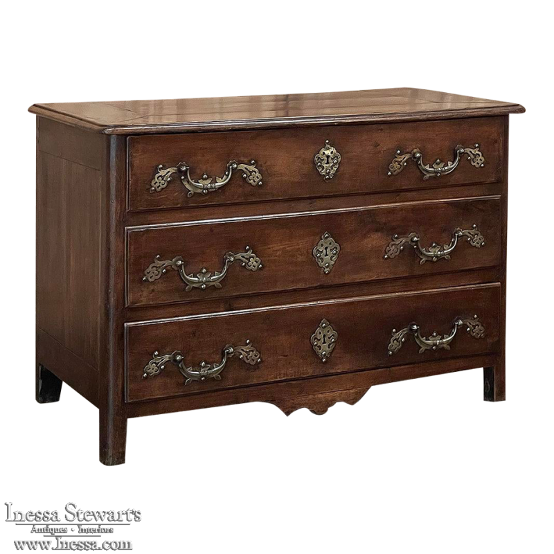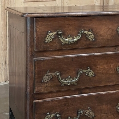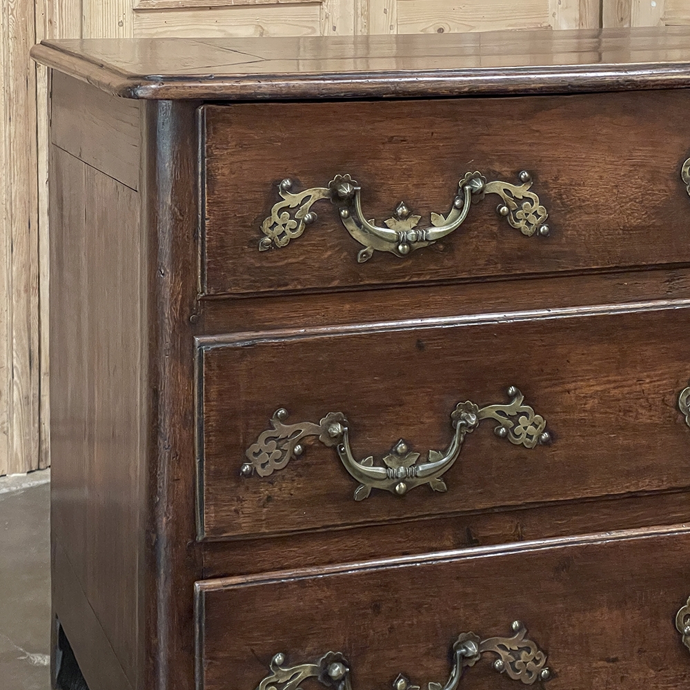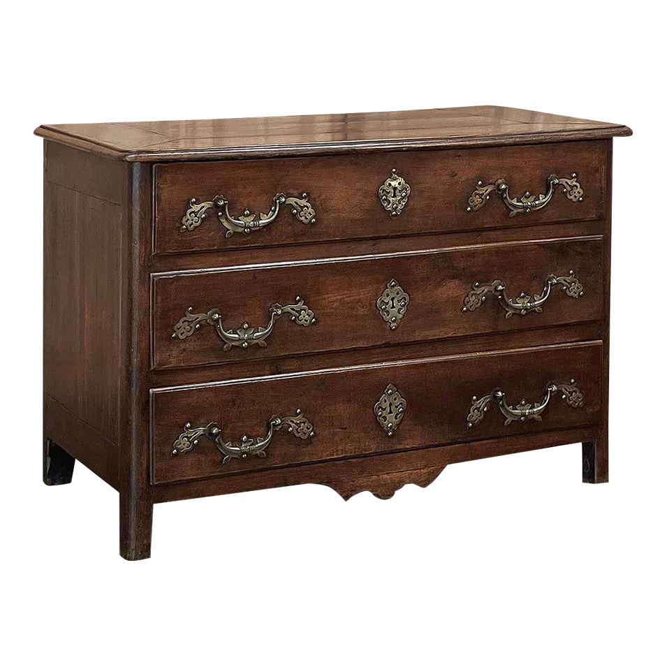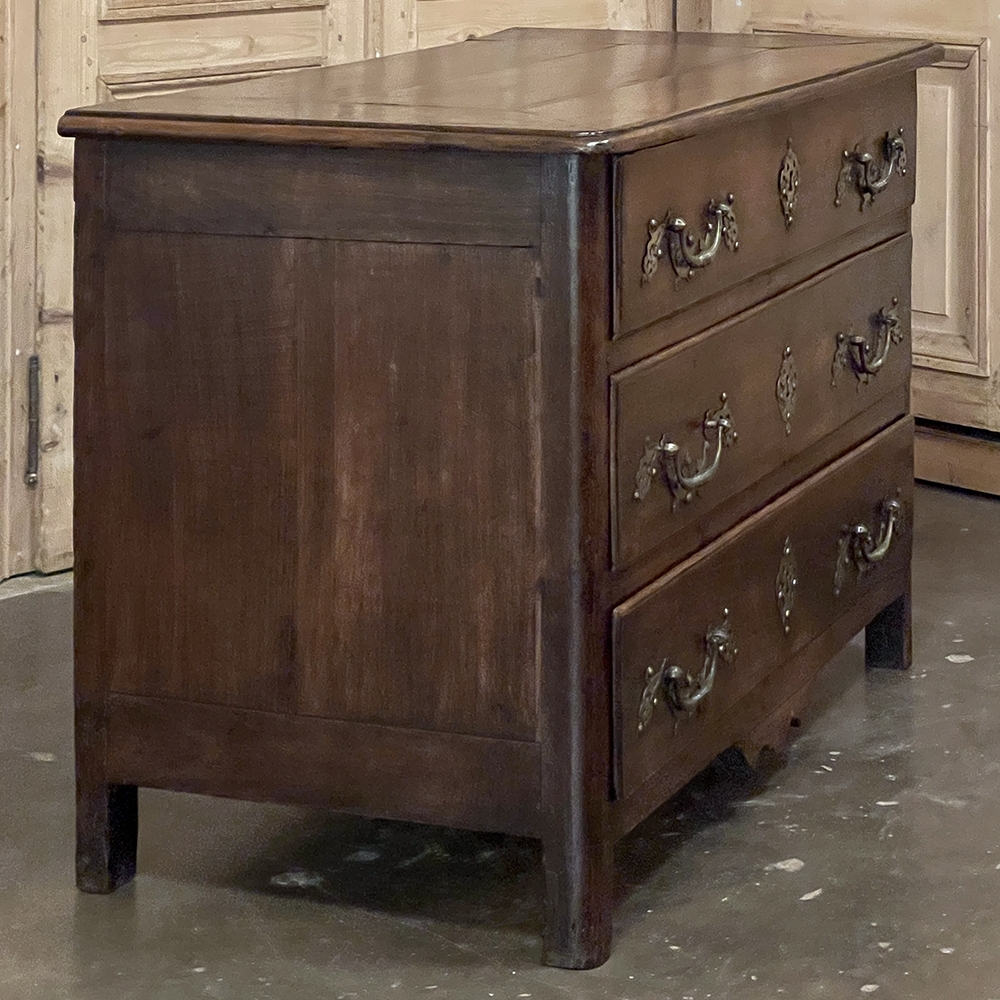 Sale18th Century Country French Style Dutch Chest of Drawers is a masterpiece of form over function! Hand-crafted from thick planks of old-growth oak and fruitwoods, it features deep, spacious drawers for lots of storage opportunities. The solid plank top is framed by deep planks with a beveled edge all around, and four solid posts form the corners and provide a framework for the design. Solid panels on each side and even the back are connected with double-pegged mortise & tenon joinery. The facade is adorned with a modest carving on the apron below, and lavish, elegant cast brass bale pulls with distinctive guards coupled with finely crafted pierced key guards for a regal touch. Literally designed to last for generations!