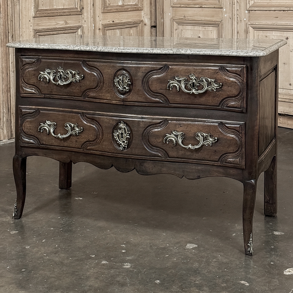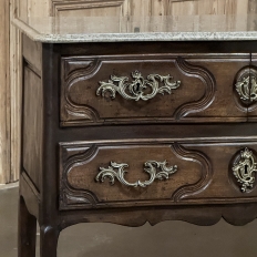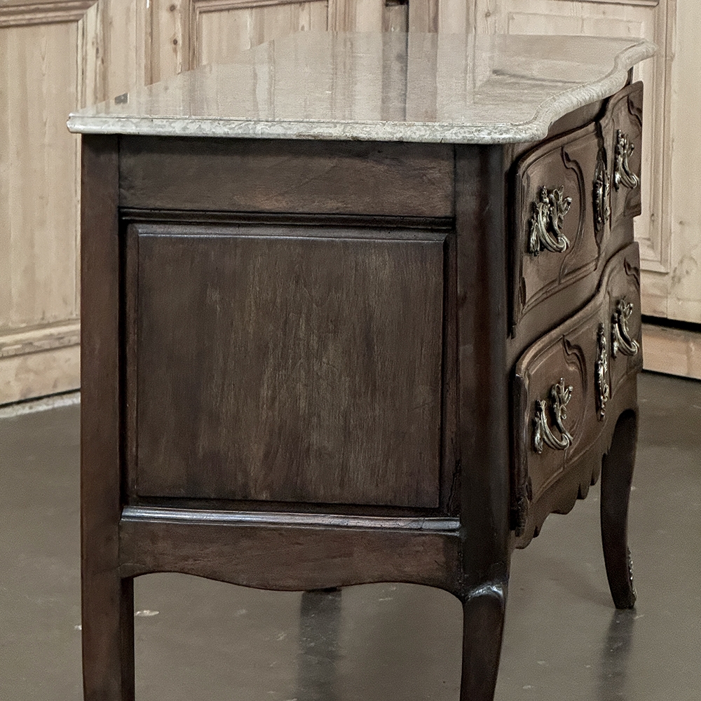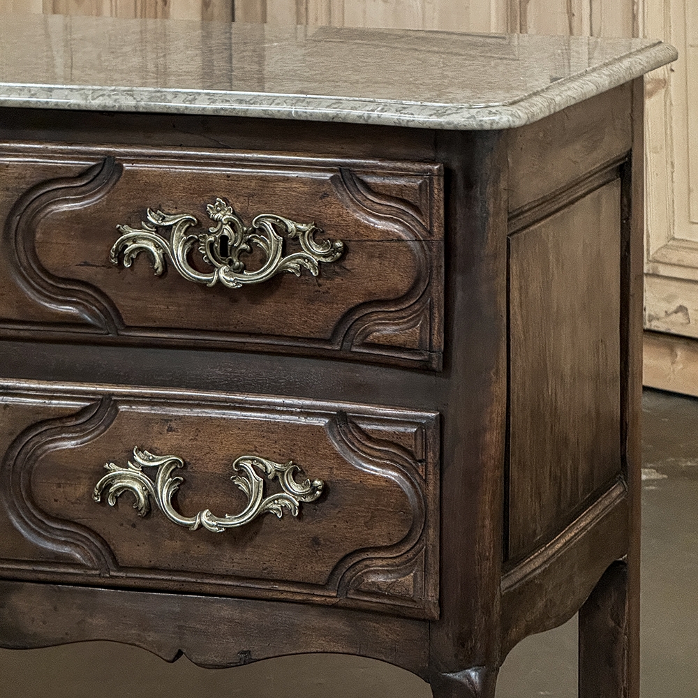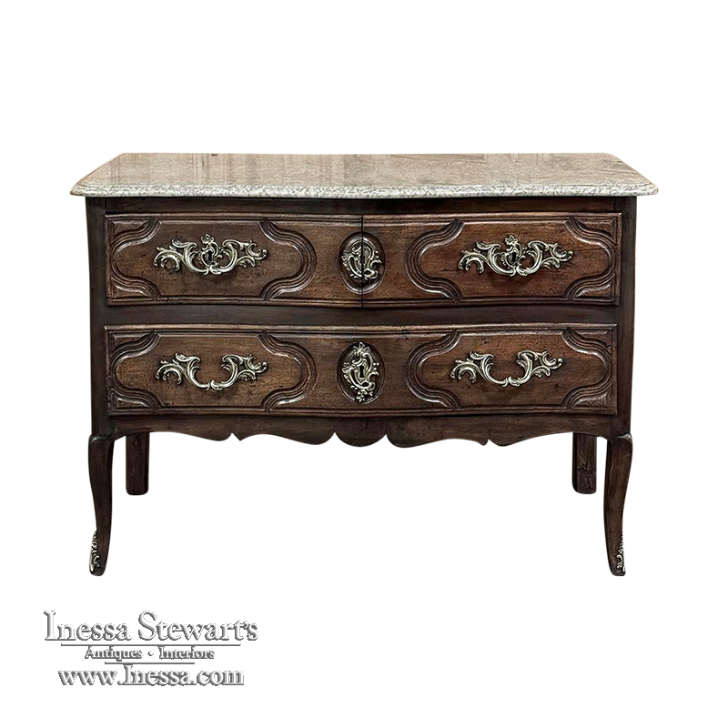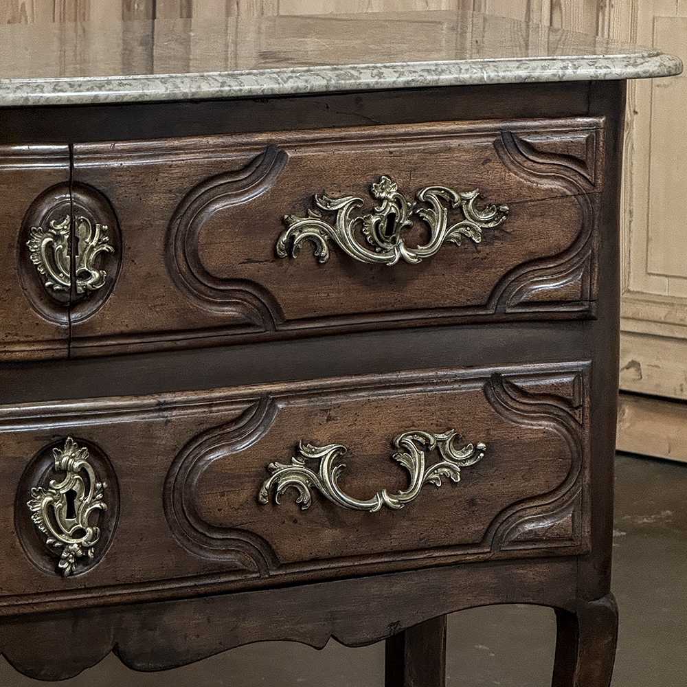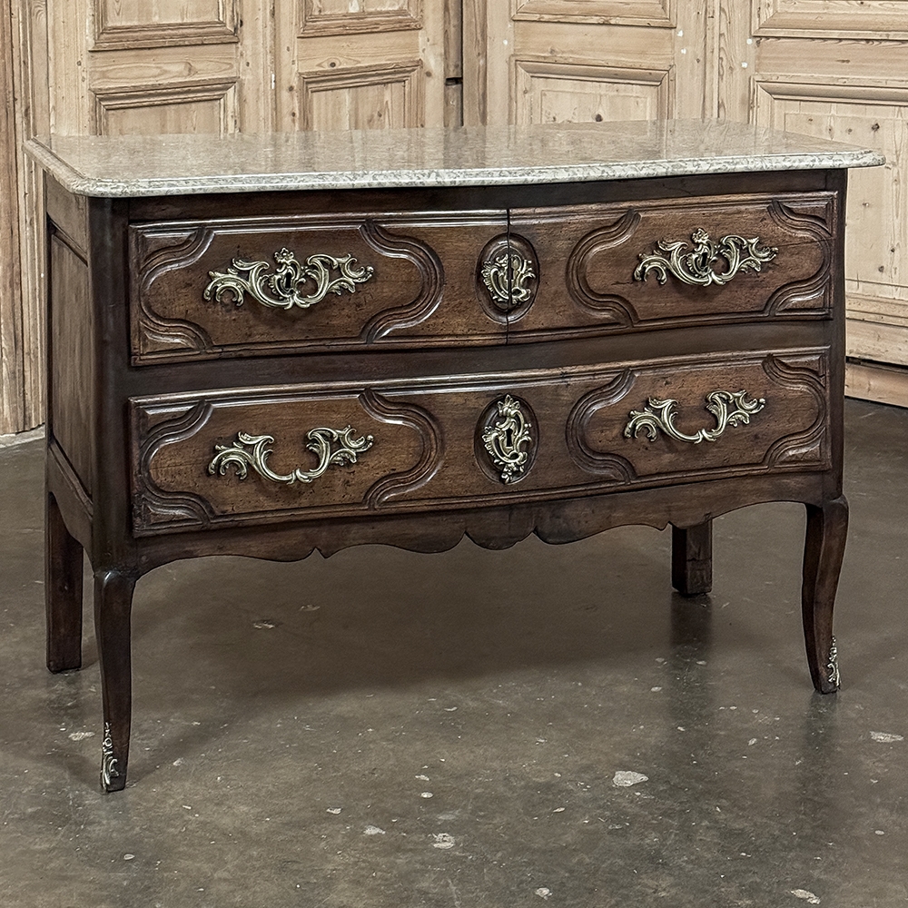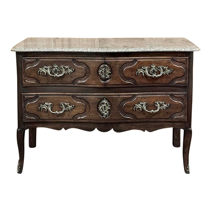 SaleSuperb! 18th Century French Louis XV Walnut Marble Top Commode combines elegance, premier craftsmanship and timeless hand-selected materials to create a special piece your family will consider an instant heirloom! Sumptuous French walnut has achieved an incredible patina over the centuries, sculpted with an intriguing contour on the subtly bowed drawer facades accented with bold cast bronze key guards and lavish Baroque-inspired pulls. A scrolled apron underneath leads the eyes to the subtly scrolled legs lifting the casework up to a convenient height. The three drawers open to reveal capacious storage. The top is a wonderfully neutral beveled marble with beveled edge for the perfect finishing touch!