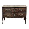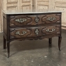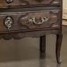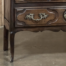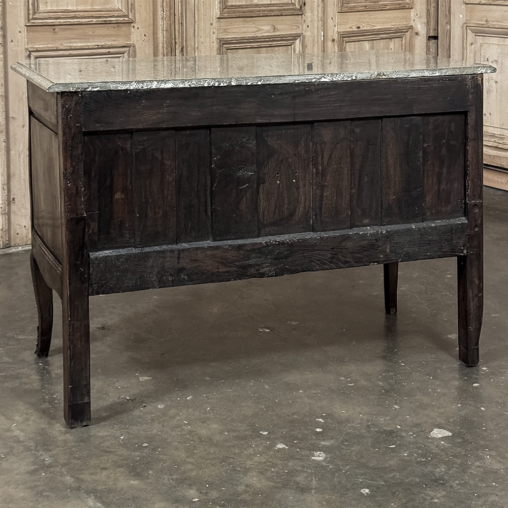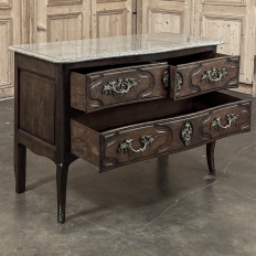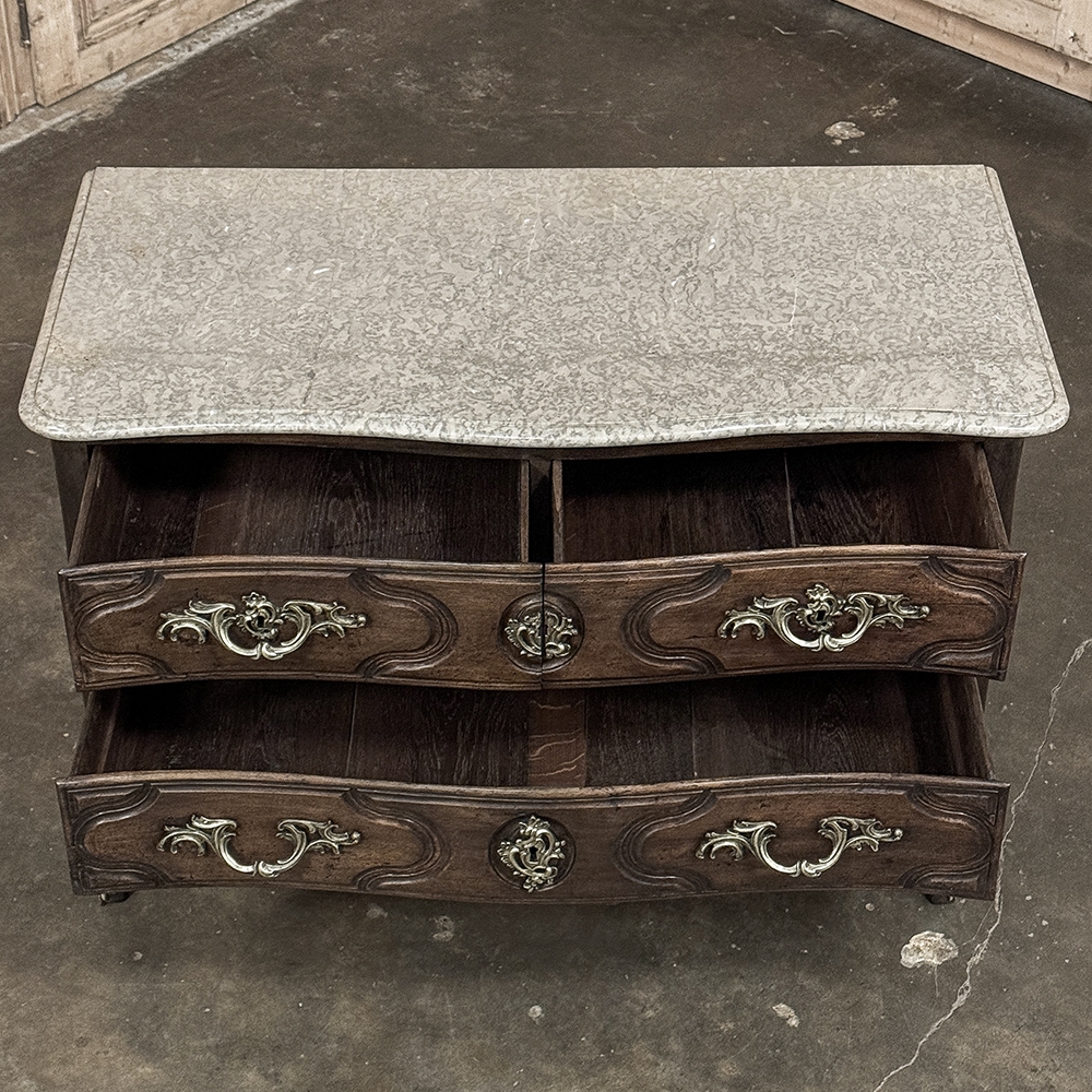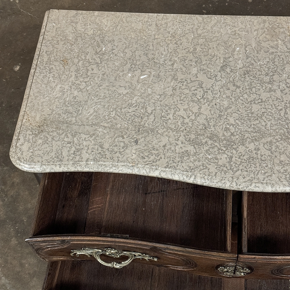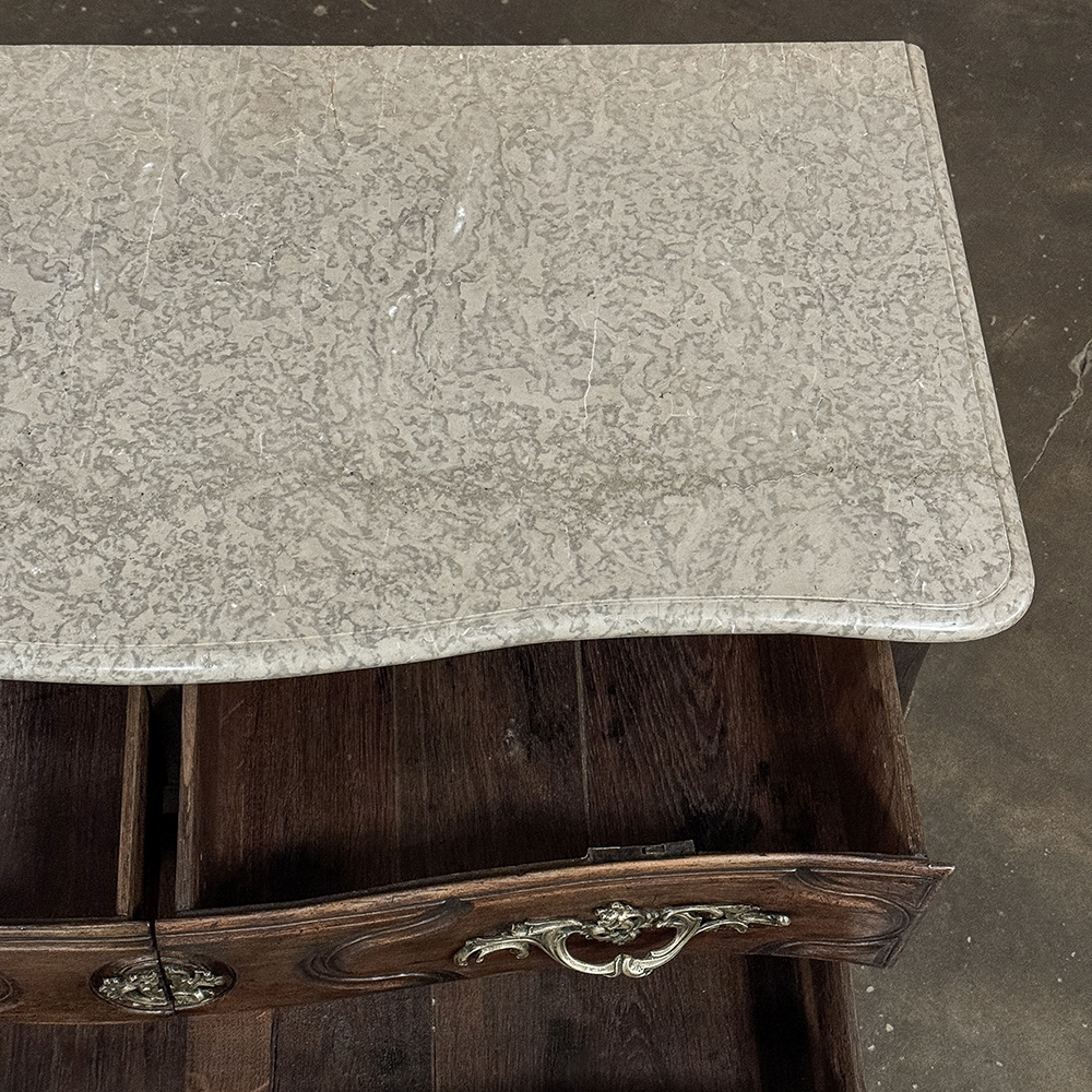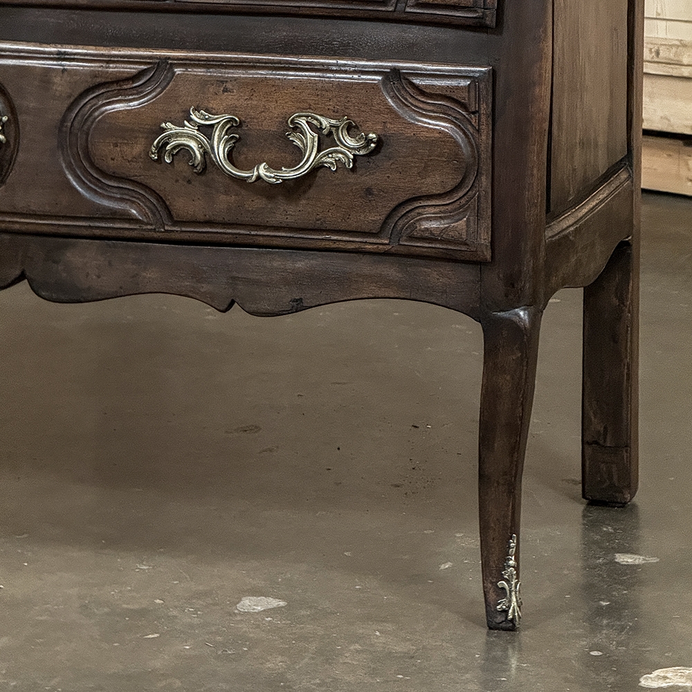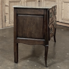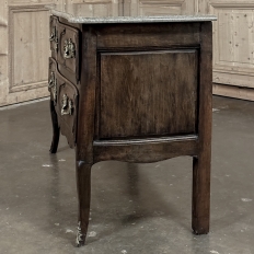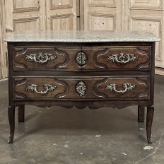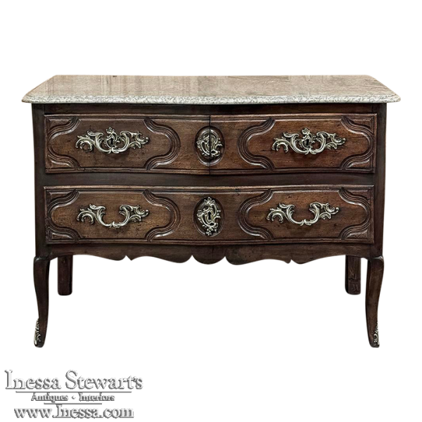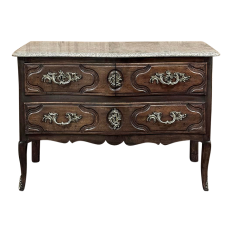 SaleSuperb! 18th Century French Louis XV Walnut Marble Top Commode combines elegance, premier craftsmanship and timeless hand-selected materials to create a special piece your family will consider an instant heirloom! Sumptuous French walnut has achieved an incredible patina over the centuries, sculpted with an intriguing contour on the subtly bowed drawer facades accented with bold cast bronze key guards and lavish Baroque-inspired pulls. A scrolled apron underneath leads the eyes to the subtly scrolled legs lifting the casework up to a convenient height. The three drawers open to reveal capacious storage. The top is a wonderfully neutral beveled marble with beveled edge for the perfect finishing touch!