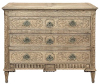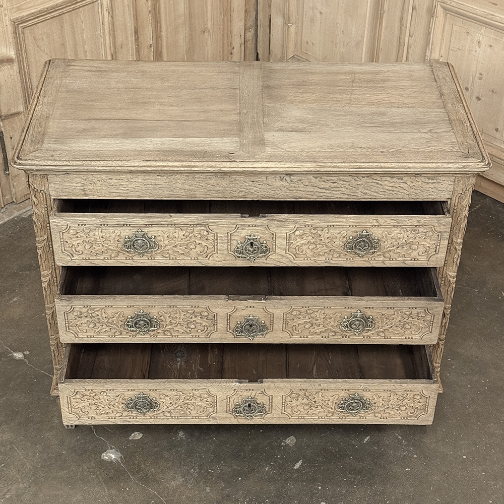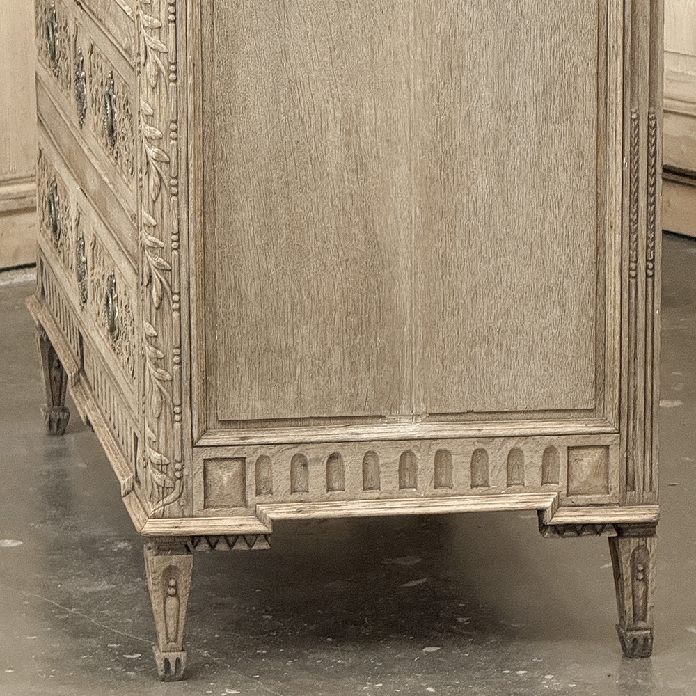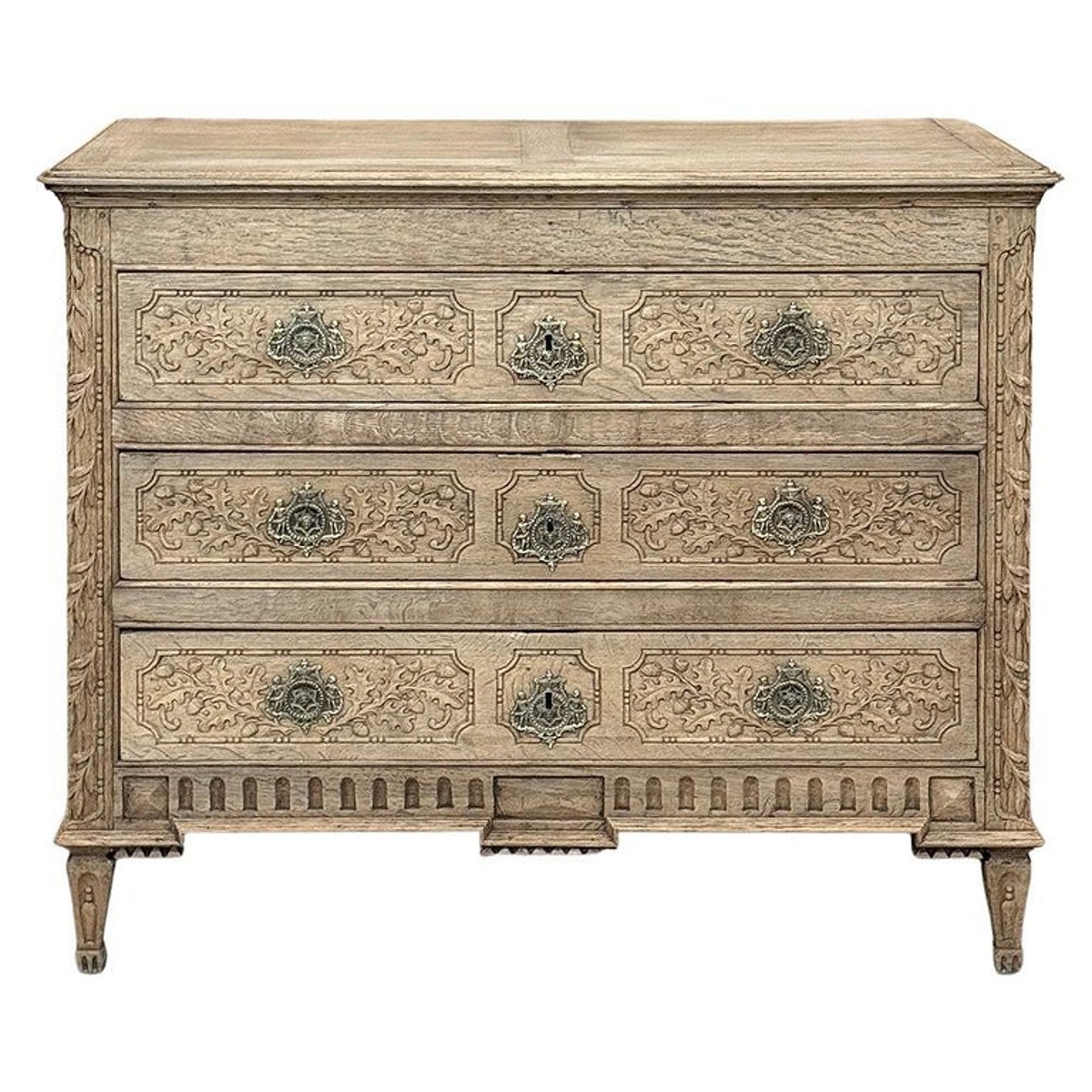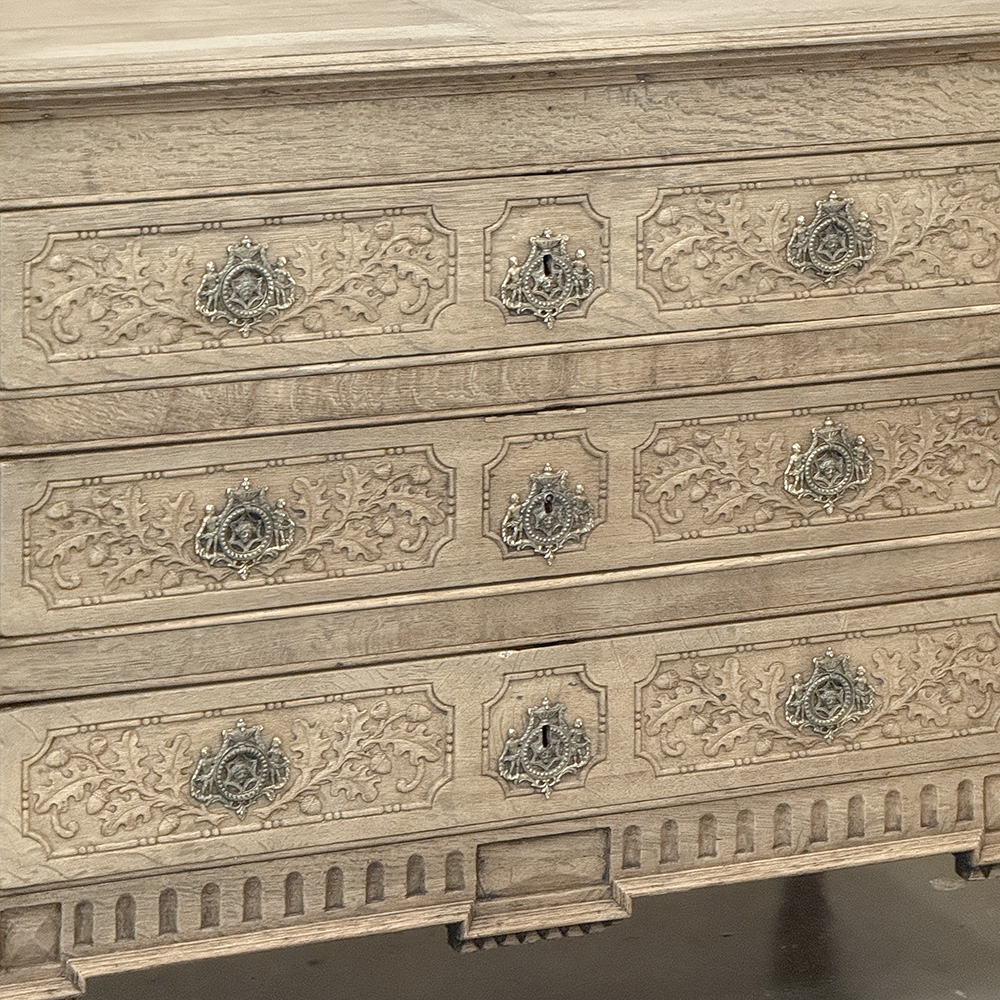 18th Century French Louis XVI Commode in Stripped Oak is a magnificent example of the genre, meticulously hand-crafted by master artisans in the neoclassical revival style from dense, old-growth oak. The tailored rectilinear architecture recalls the glory years of ancient Greece & Rome, from the complex multi-tiered molding detail on the top to the four tapered and carved legs below. In between, three drawers with three panels each are carved with exceptional relief renditions of oak leaves with acorns, and the original cast bronze pulls that exhibit jewelry-quality detail with classical figures, urns and garlands. The drawers are flanked by the rounded corner posts, carved with fascia and olive branches in relief, leading the eye down to the full width carvings on the apron below, mixing a colonnade style fluting with pyramidal plinths. Capacious storage in style! Painstakingly stripped using our proprietary process that retains the patina and sheer natural beauty of the old wood, all performed by our expert in-house staff.