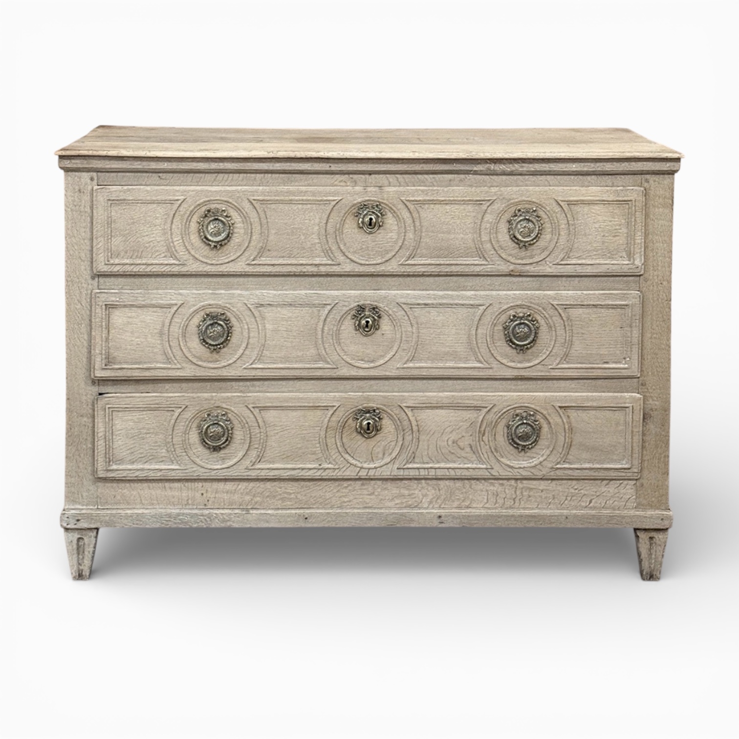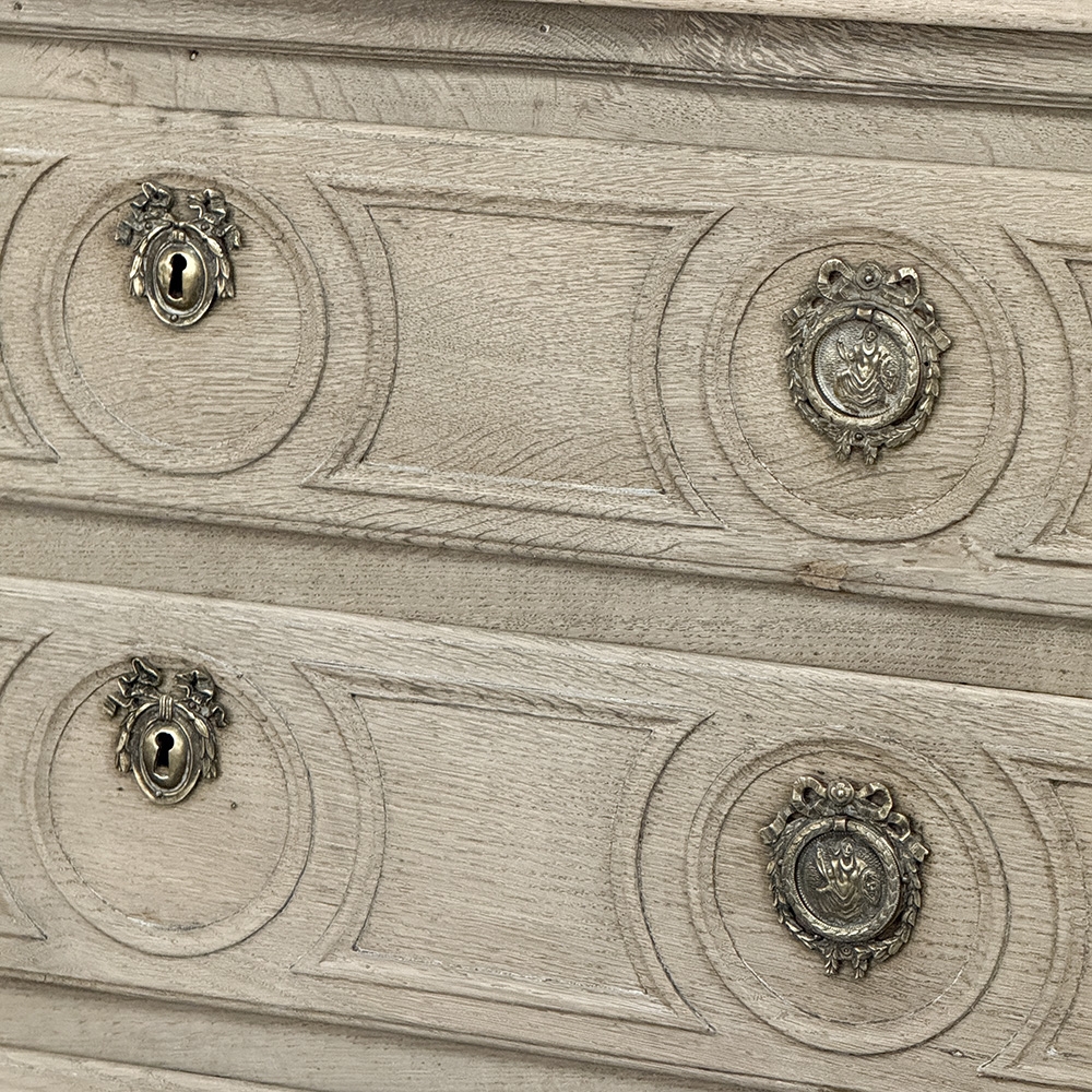 18th Century French Louis XVI Period Commode in Stripped Oak recalls a time when closets were non-existent, and commodes and armoires were used for clothes storage. This impressive example features a tailored architecture that includes roundels in triplicate across each drawer facade, into which are placed bronze ring pulls with cast bronze guards or at the centers, wonderfully intricate key guards. Our expert in-house refurbishment staff has stripped the piece using our proprietary method, revealing the sheer natural beauty of the old-growth wood, presenting a lighter visual effect that is at once attractive and charming. An excellent choice for any room that needs a generous surface and even more generous storage!
