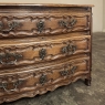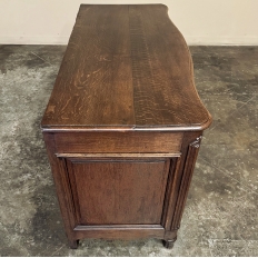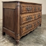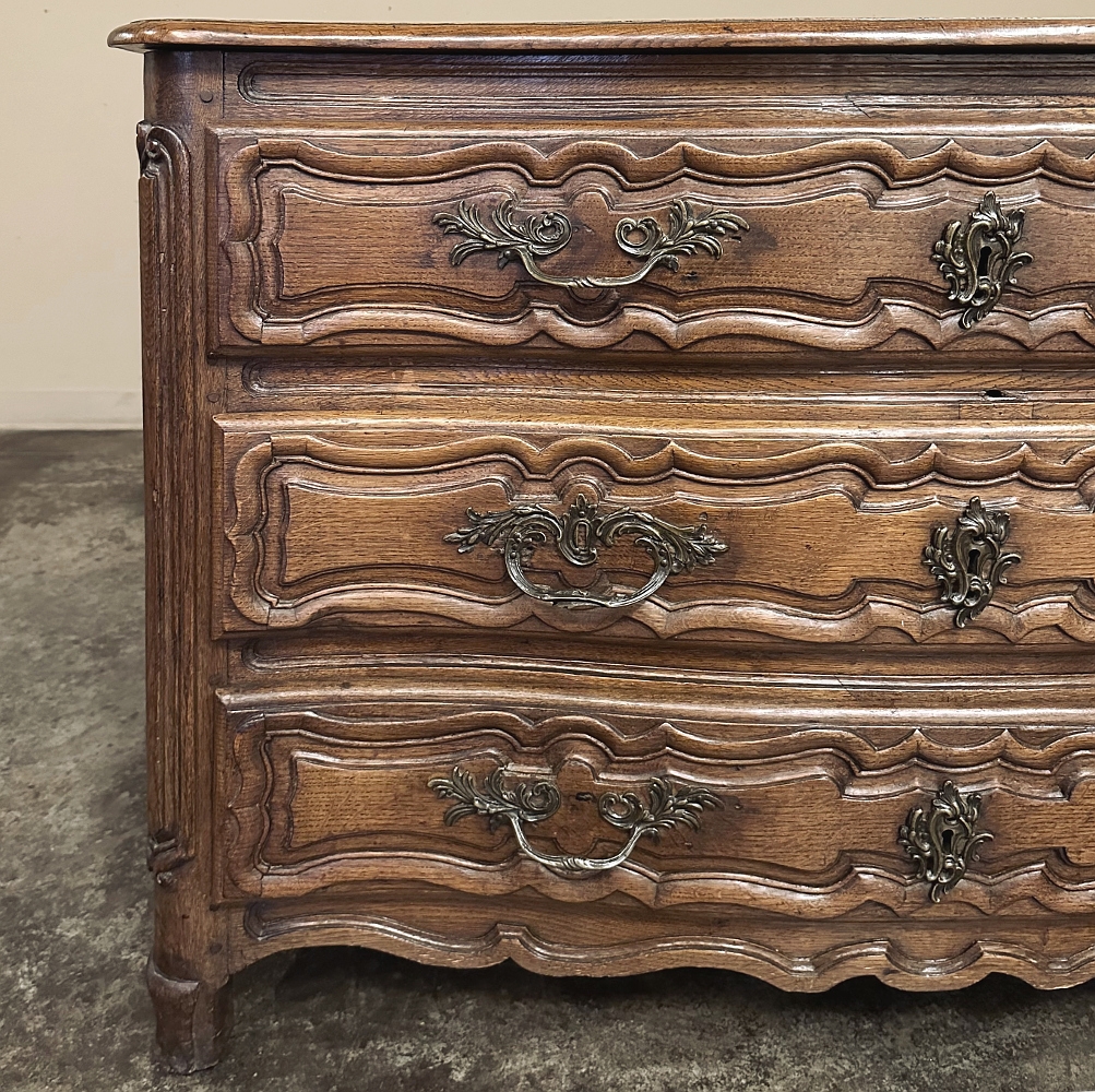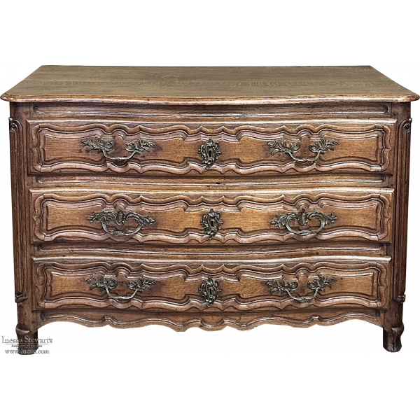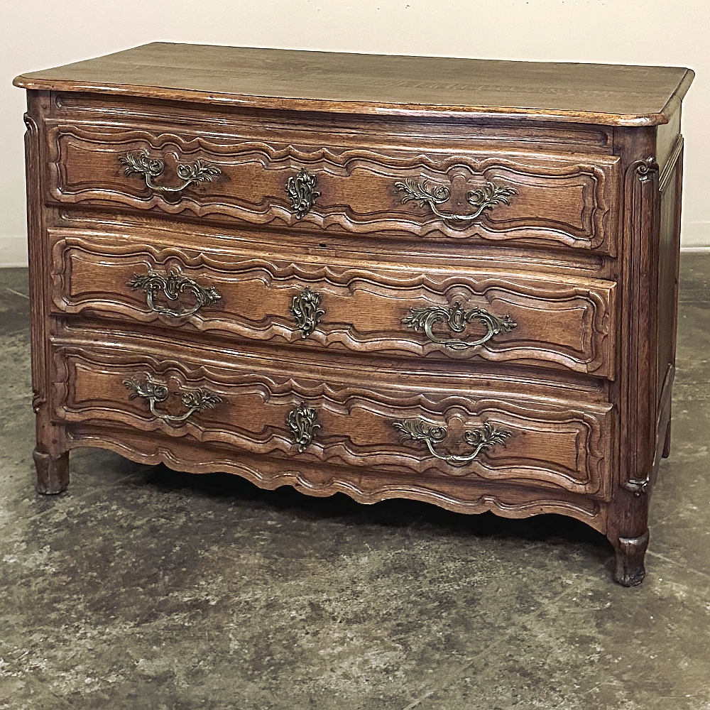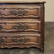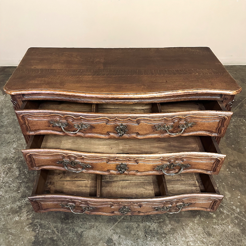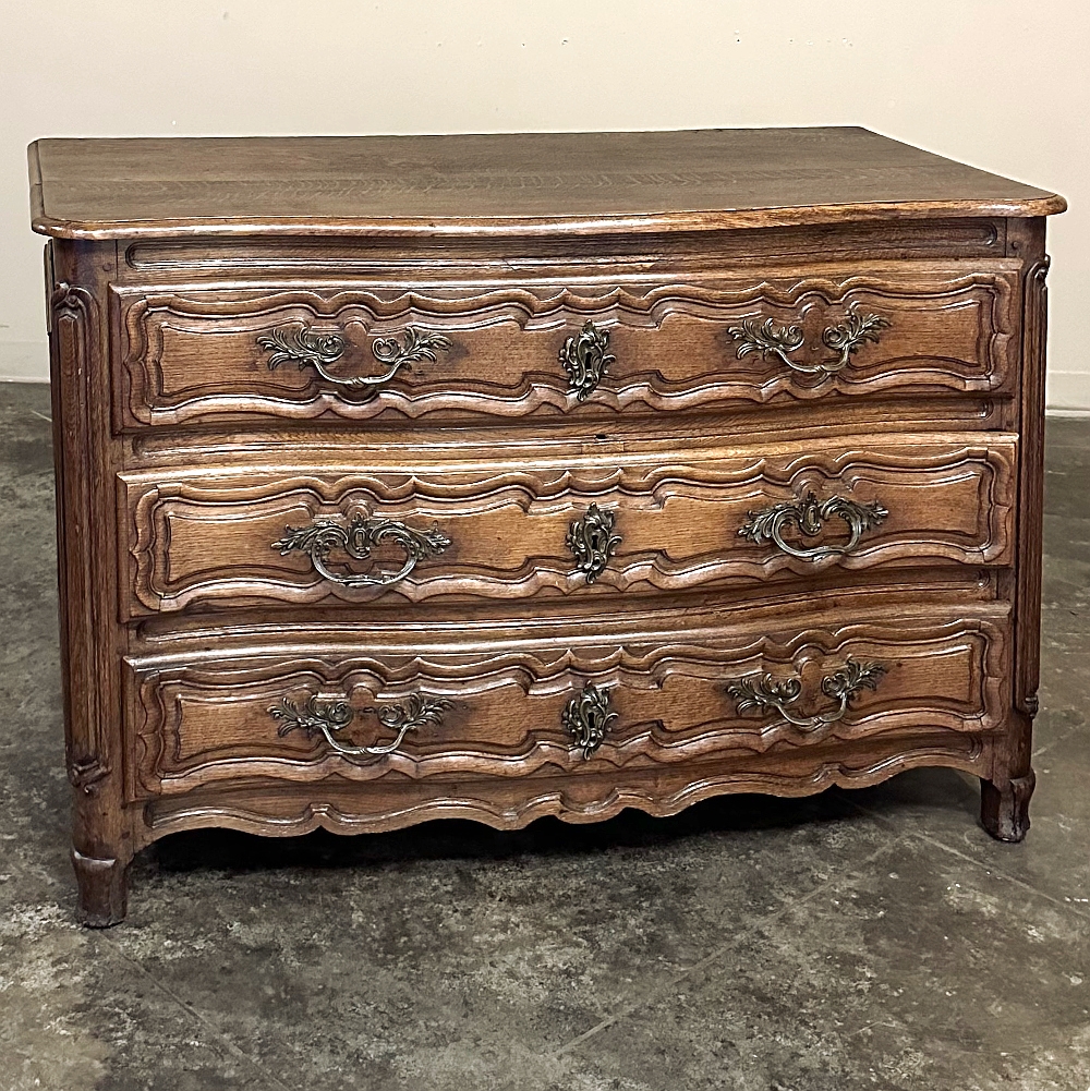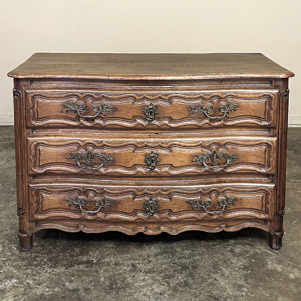 SaleGrand 18th Century French Oak Commode was considered an essential part of many rooms of a proper home during the 1700s, not just used for clothing, but for linens and other items for daily use. This example, rendered from hand-selected old-growth oak, features no knots and tight grain, and pegged mortise & tenon joinery that will ensure its longevity into the 22nd century! Raised & recessed panels on each side are fully framed with bold molding, providing visual appeal from all angles, and transition to the front via massive rounded corner posts carved with bold molded detail. The three massive drawers however, steal the show with amazingly detailed molding detail that is impressive considering it was completely sculpted by hand. The apron below features complementary lines, completing the timeless look. Brass key guards and pulls in two styles provide access to the voluminous storage space within.