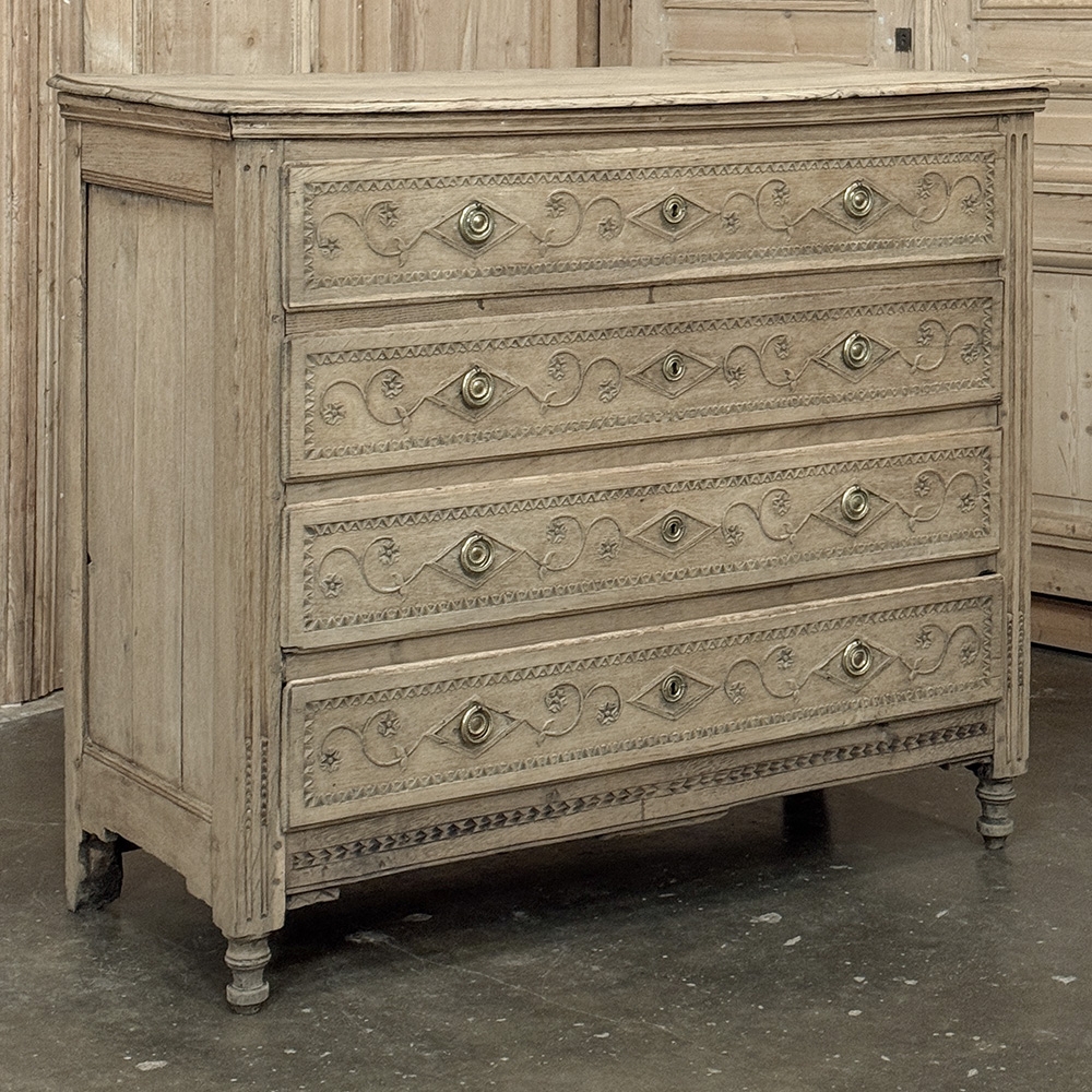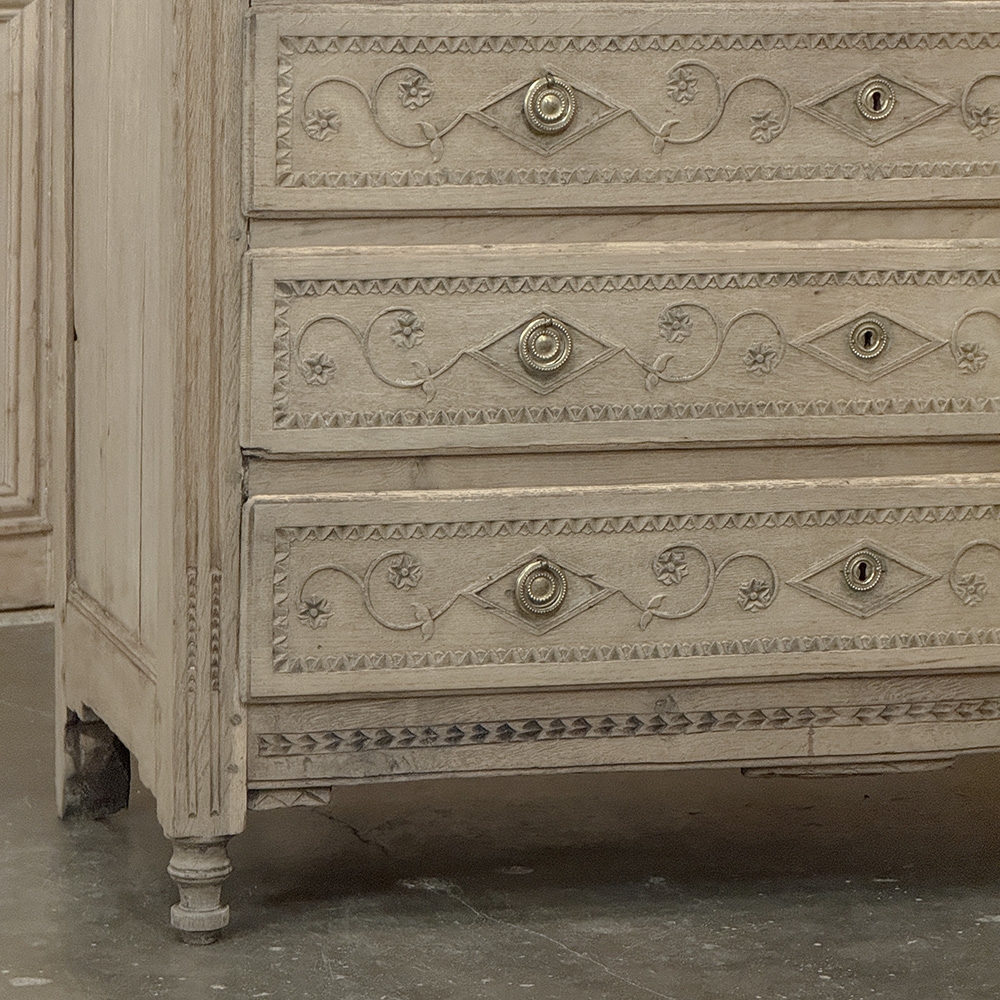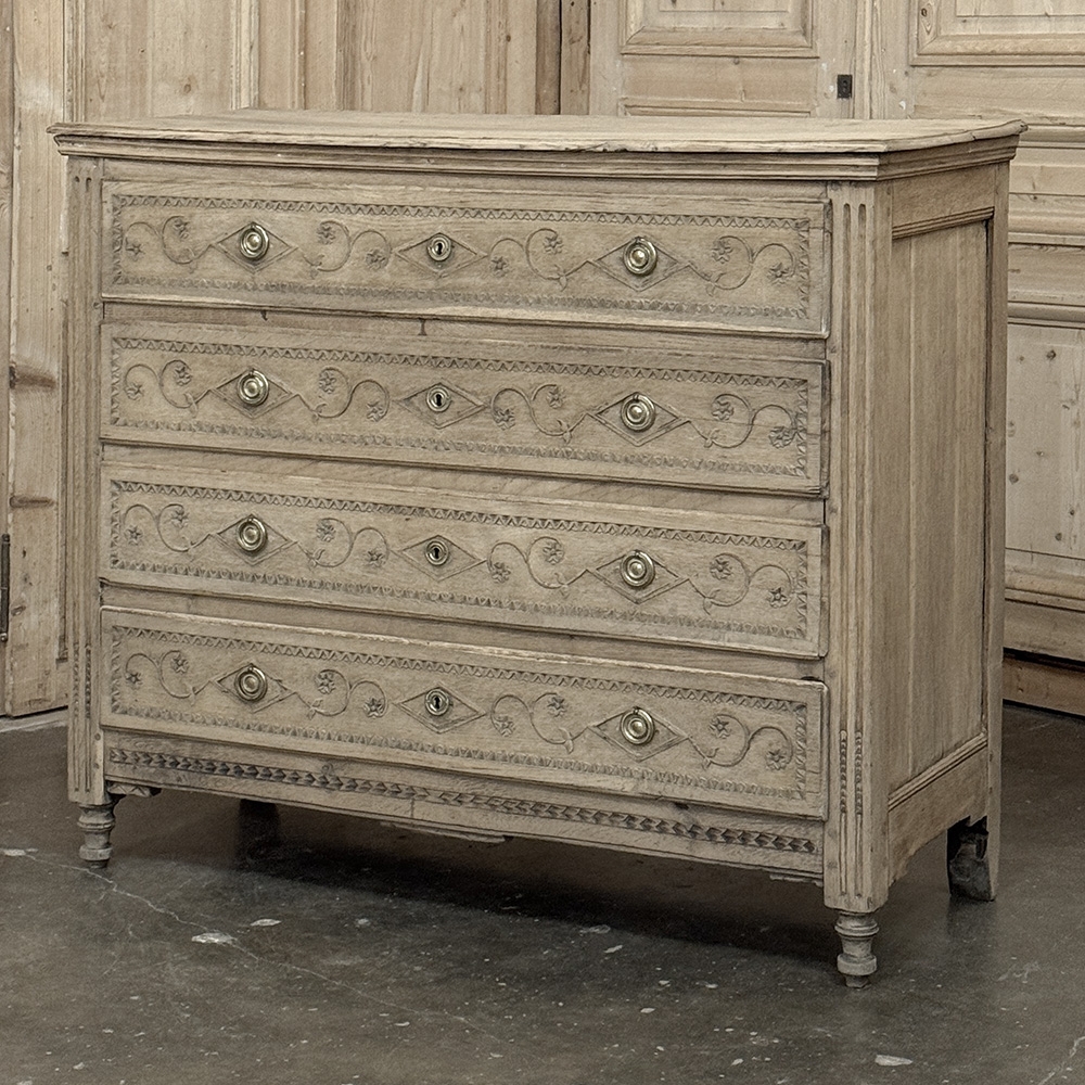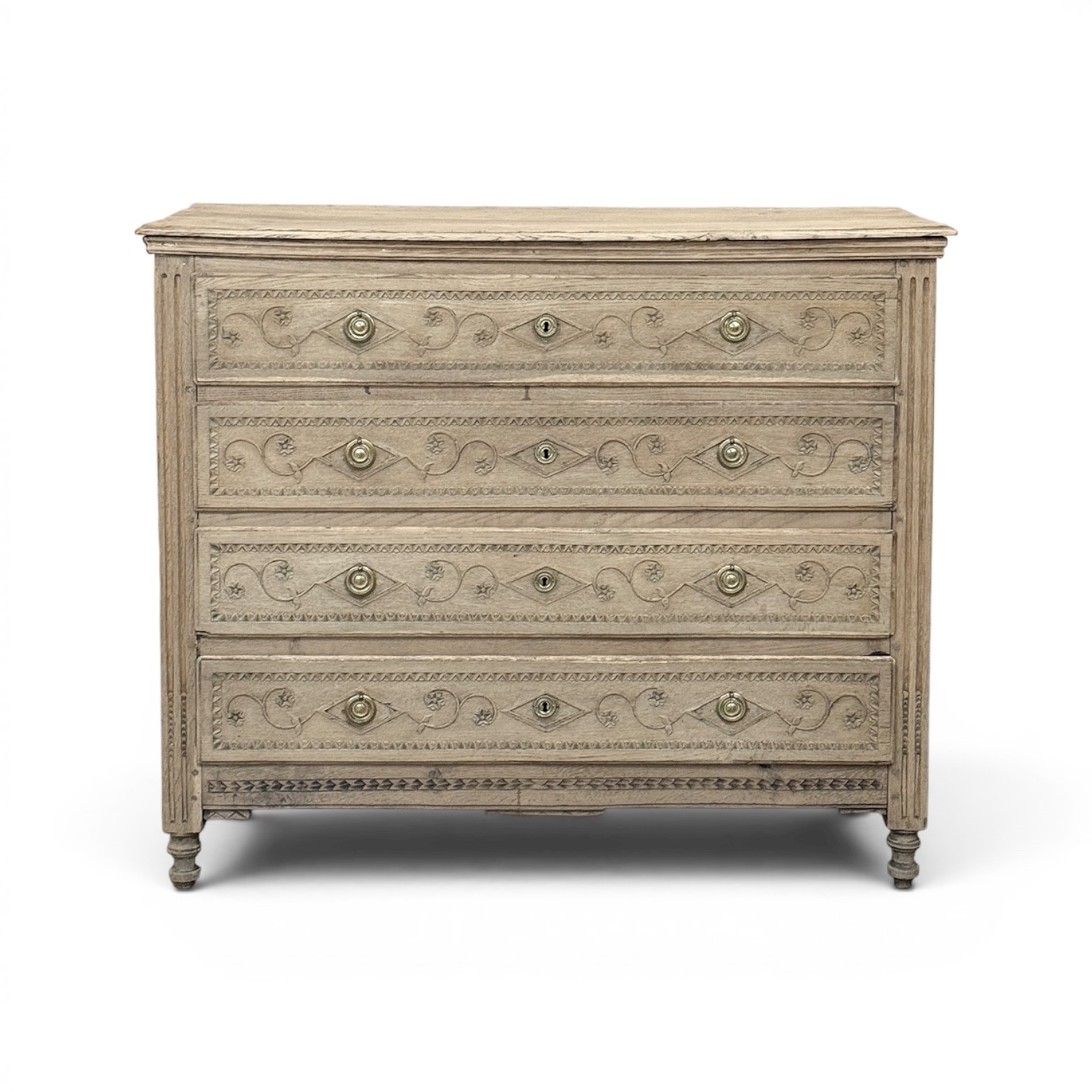 The façade is richly detailed with carved scrollwork and geometric ornament, giving the front a lovely rhythm and texture without disturbing its tailored simplicity. The stripped finish reveals the softness of the oak grain and the depth of its aged surface, allowing the natural beauty of the wood to take center stage. Fluted corner details, original keyholes, and classic pulls further reinforce its period character.
