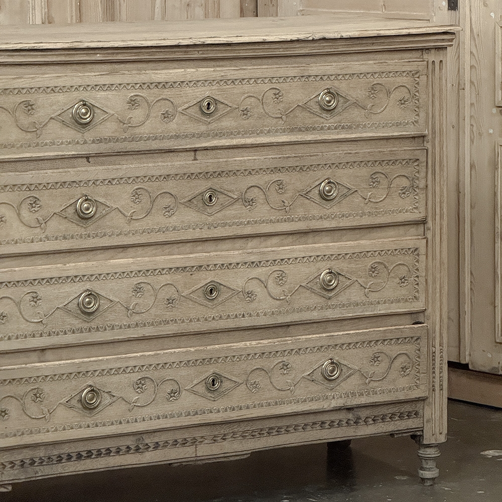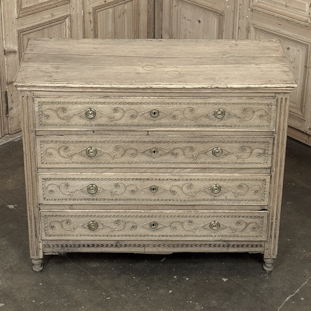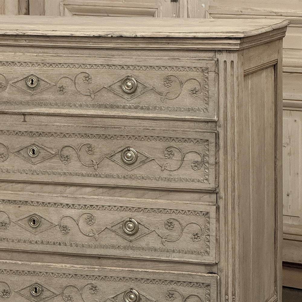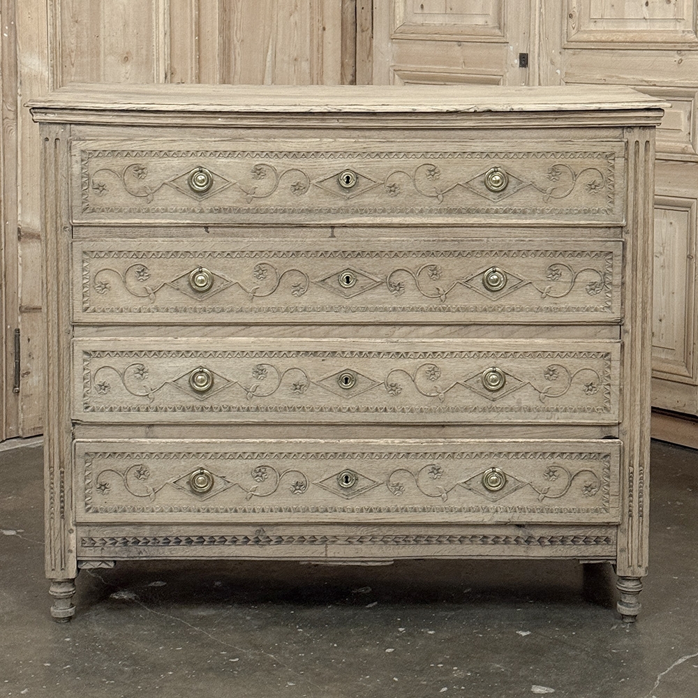 The façade is richly detailed with carved scrollwork and geometric ornament, giving the front a lovely rhythm and texture without disturbing its tailored simplicity. The stripped finish reveals the softness of the oak grain and the depth of its aged surface, allowing the natural beauty of the wood to take center stage. Fluted corner details, original keyholes, and classic pulls further reinforce its period character.