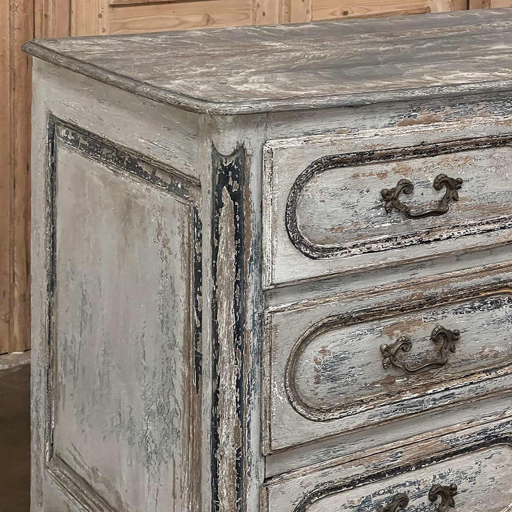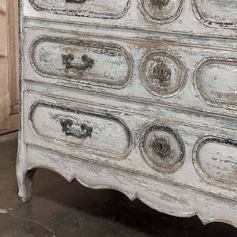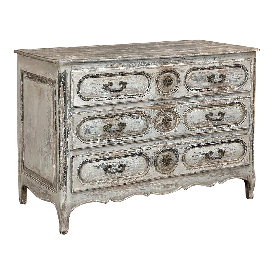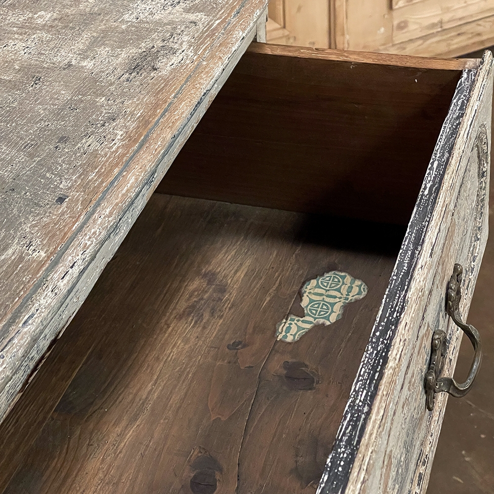 Sale18th Century Swedish Painted Commode ~ Chest of Drawers is a timeless example of the craftsmanship and artistry in cabinetmaking for which the Swedes are well known. Their reputation also extends into shipbuilding, as an anecdote, illustrated by the historical display of the Vasa, although the naval architect would not be included in the accolades... This example was designed for copious storage, with deep, wide drawers each accessed with a brace of cast brass pulls and centered with finely cast brass key guards. The ornamentation is very tailored, with recessed chamfered panels on the sides, a subtly scrolled apron, and a mixture of oval and circular molded panels on the drawer facades. The multi-hued painted finish enhances the detail, and with the distressed finish makes for a look that is superb for casual decors.