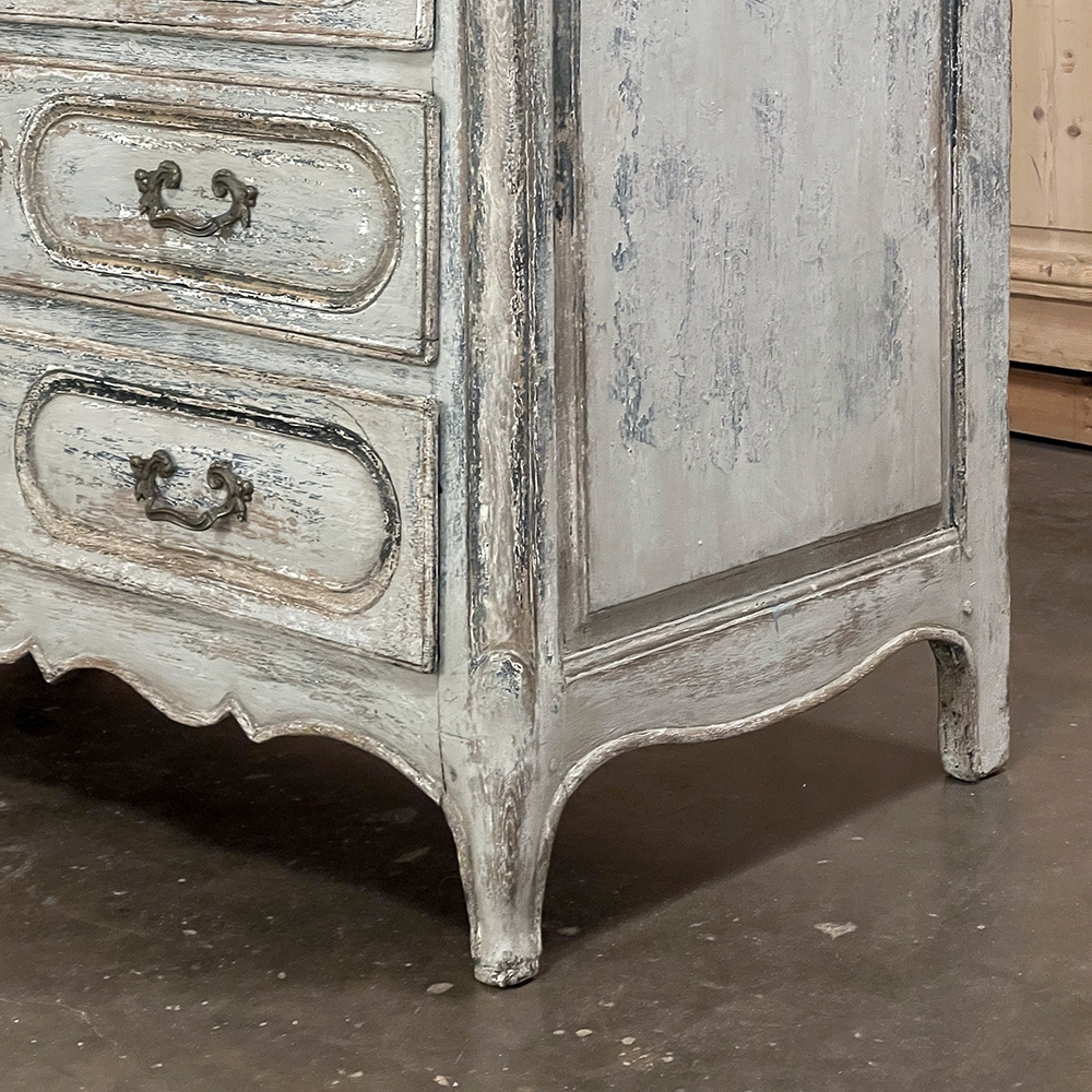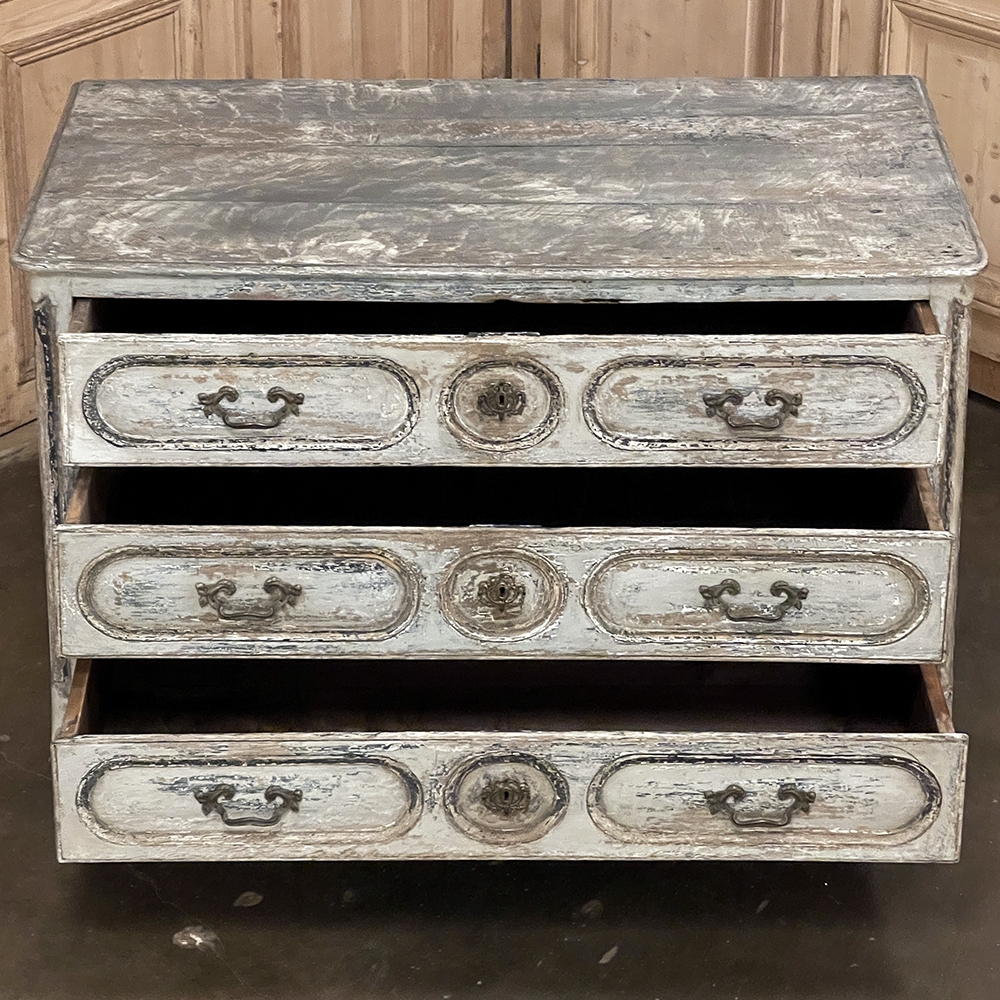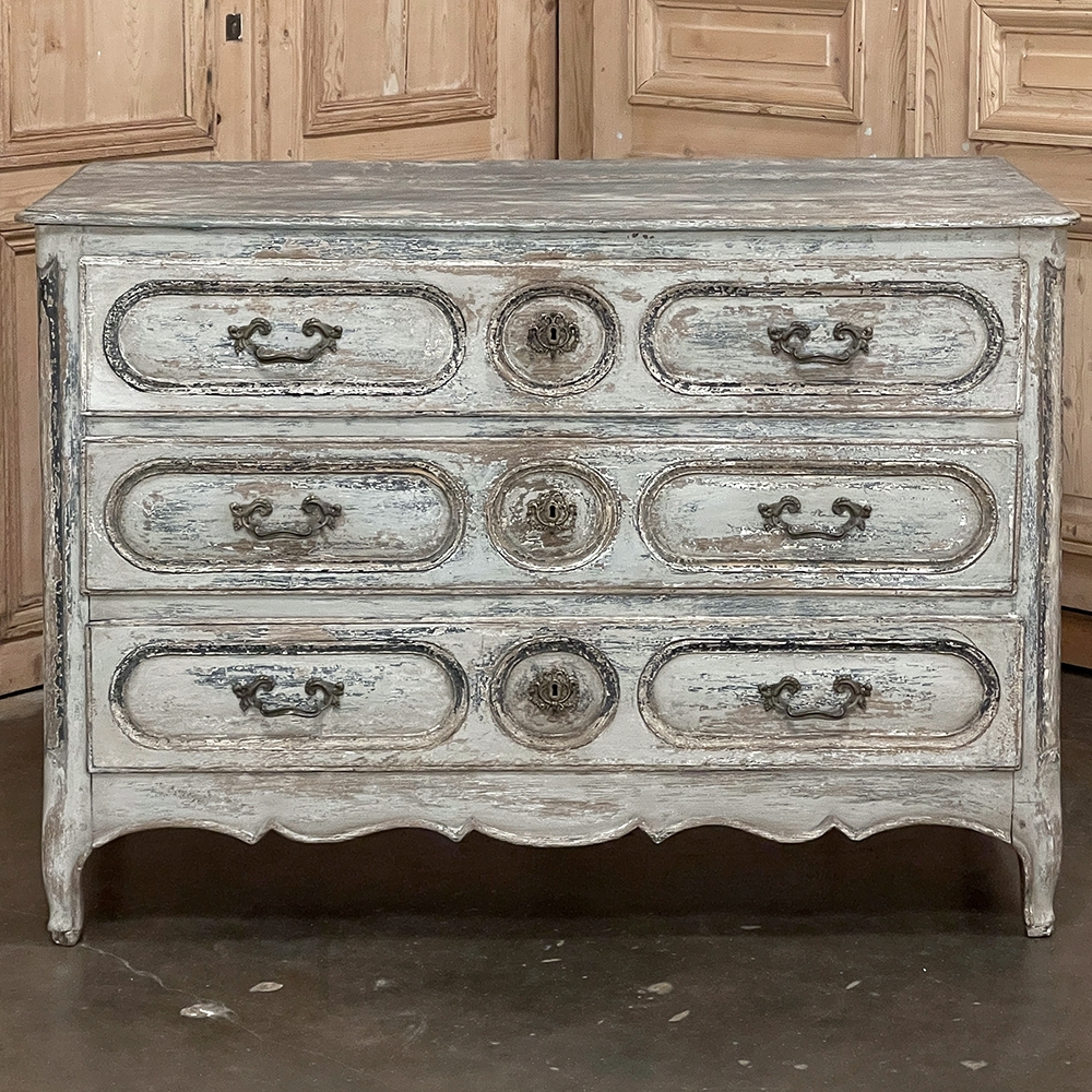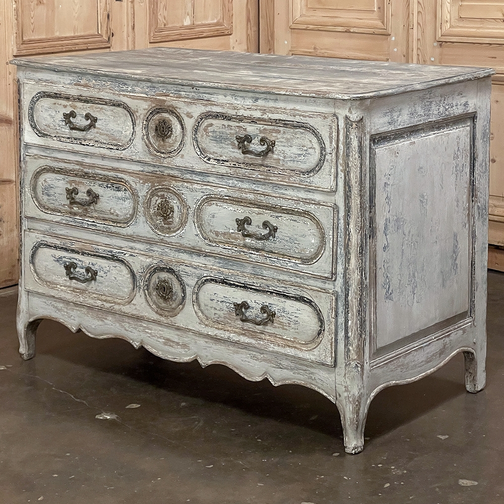 Sale18th Century Swedish Painted Commode ~ Chest of Drawers is a timeless example of the craftsmanship and artistry in cabinetmaking for which the Swedes are well known. Their reputation also extends into shipbuilding, as an anecdote, illustrated by the historical display of the Vasa, although the naval architect would not be included in the accolades... This example was designed for copious storage, with deep, wide drawers each accessed with a brace of cast brass pulls and centered with finely cast brass key guards. The ornamentation is very tailored, with recessed chamfered panels on the sides, a subtly scrolled apron, and a mixture of oval and circular molded panels on the drawer facades. The multi-hued painted finish enhances the detail, and with the distressed finish makes for a look that is superb for casual decors.