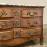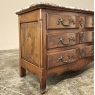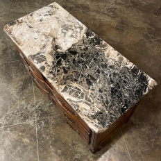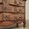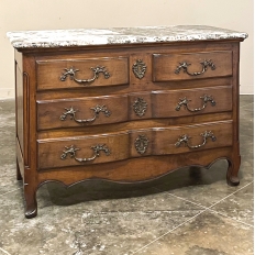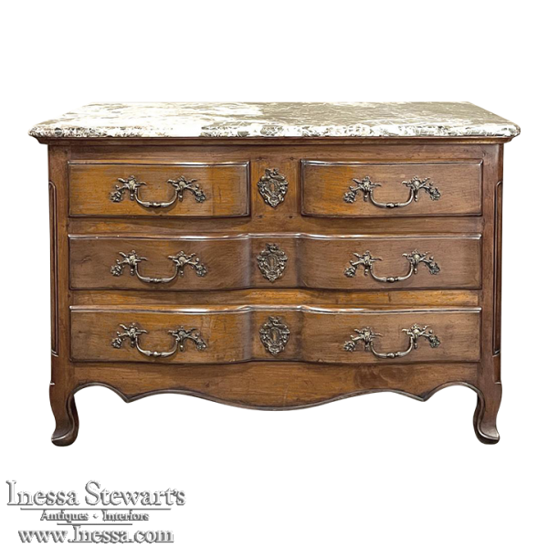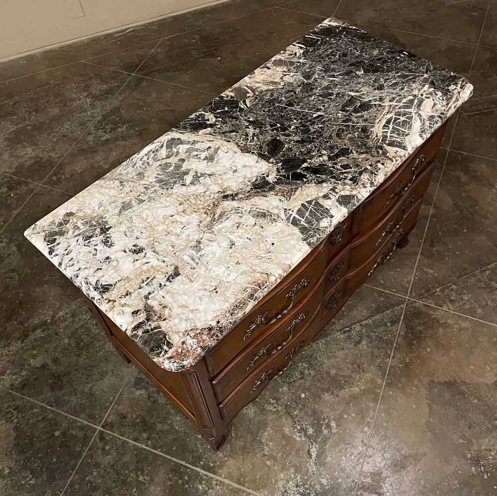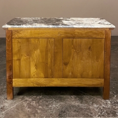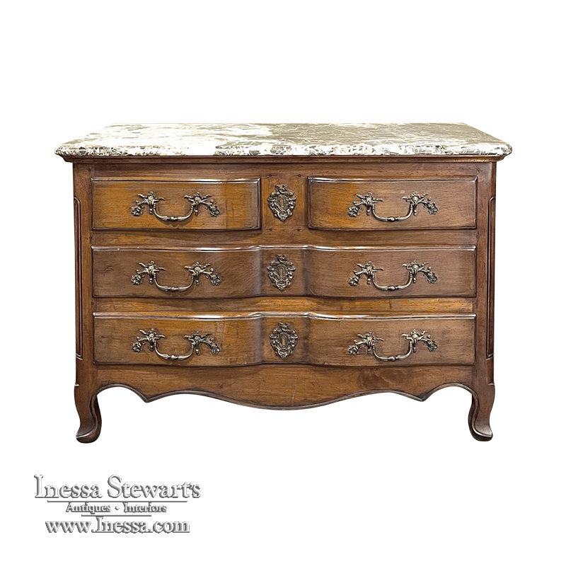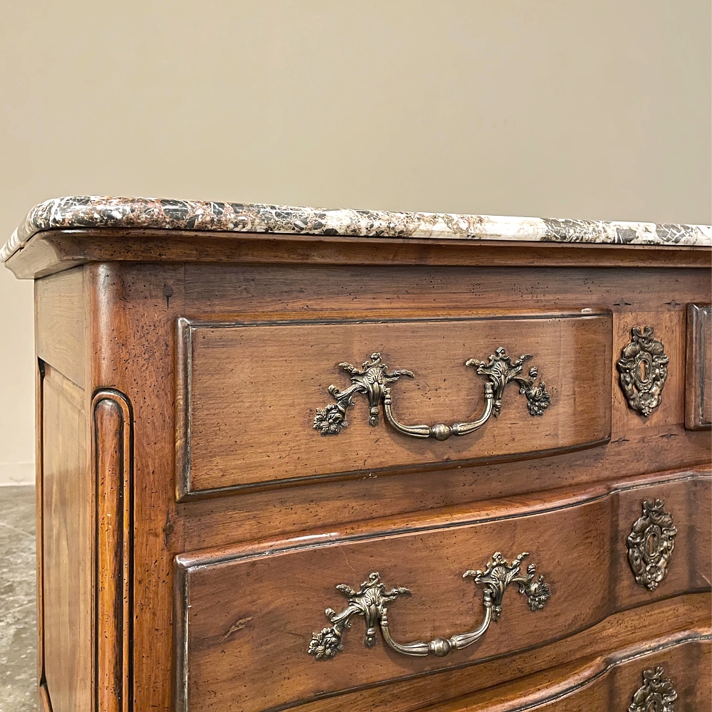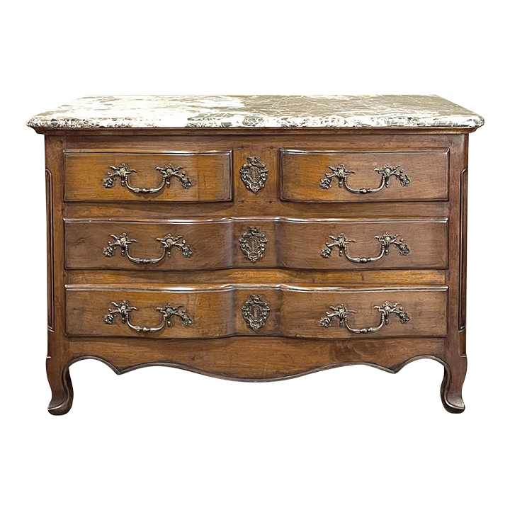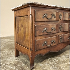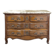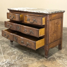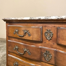 Sale19th Century Country French Cherry Wood Marble Top Commode combines the best of all worlds! Exuding a somewhat rustic look thanks to the natural beauty of the solid aged cherry wood, it features refined embellishments in the form of finely cast bronze pulls and key guards, and lastly the carefree elegance of a beveled marble top. The casework is of a tailored design, with simple raised panels on each side and a scrolled apron in front. The drawers were cut with an arbalette form, named after a quiver of arrows, and consist of a pair of full width drawers combined with an upper tier of two smaller sized units. Each drawer is fitted with pulls cast in the likeness of bouquets of flowers with foliate flourishes. The key guards are equally remarkable, depicting a pair of dolphins with intertwined tails being fed by cherubs! The luxurious veining of the marble, the richness of the exquisite cherry wood, and the allure of the bronze appointments truly make an exquisite combination!