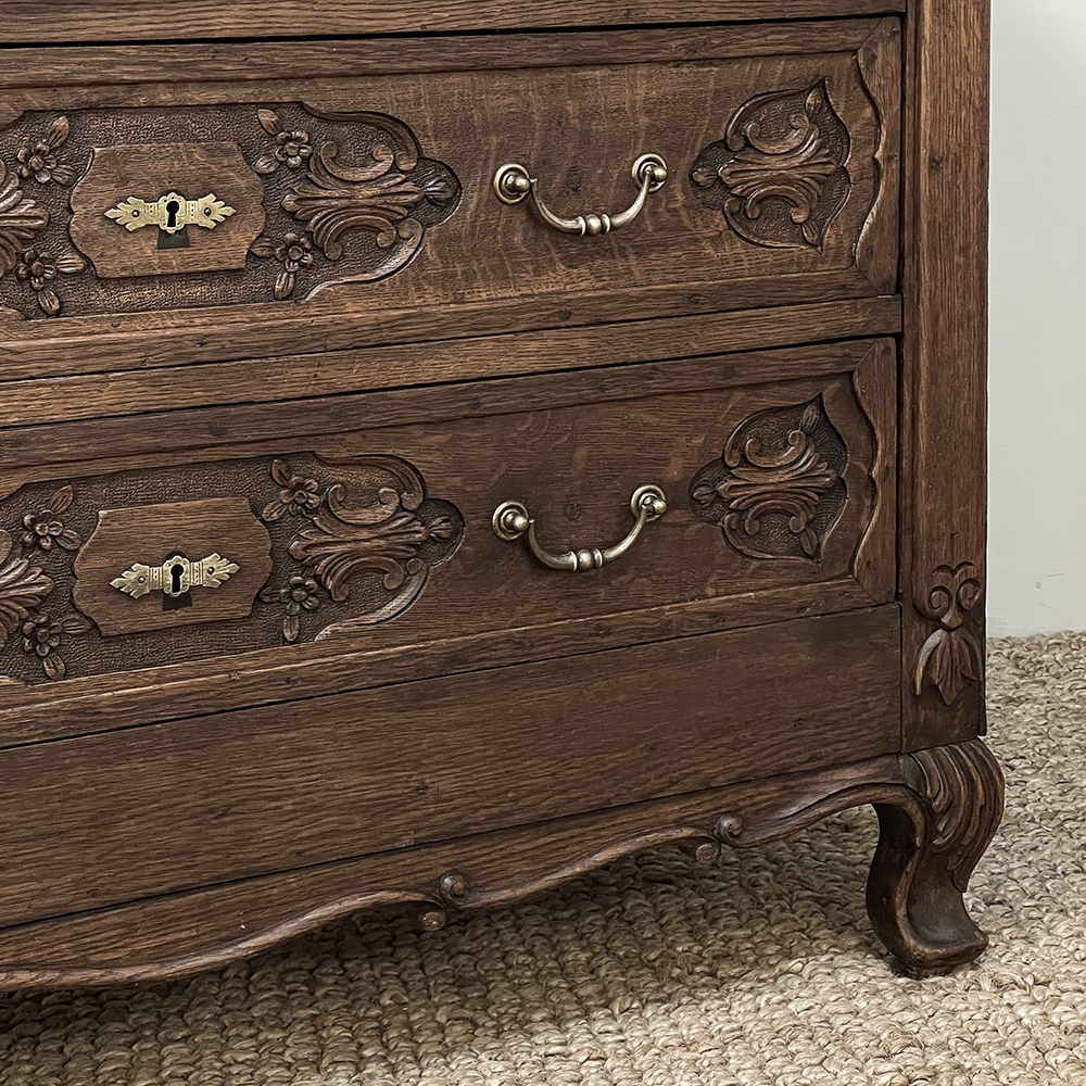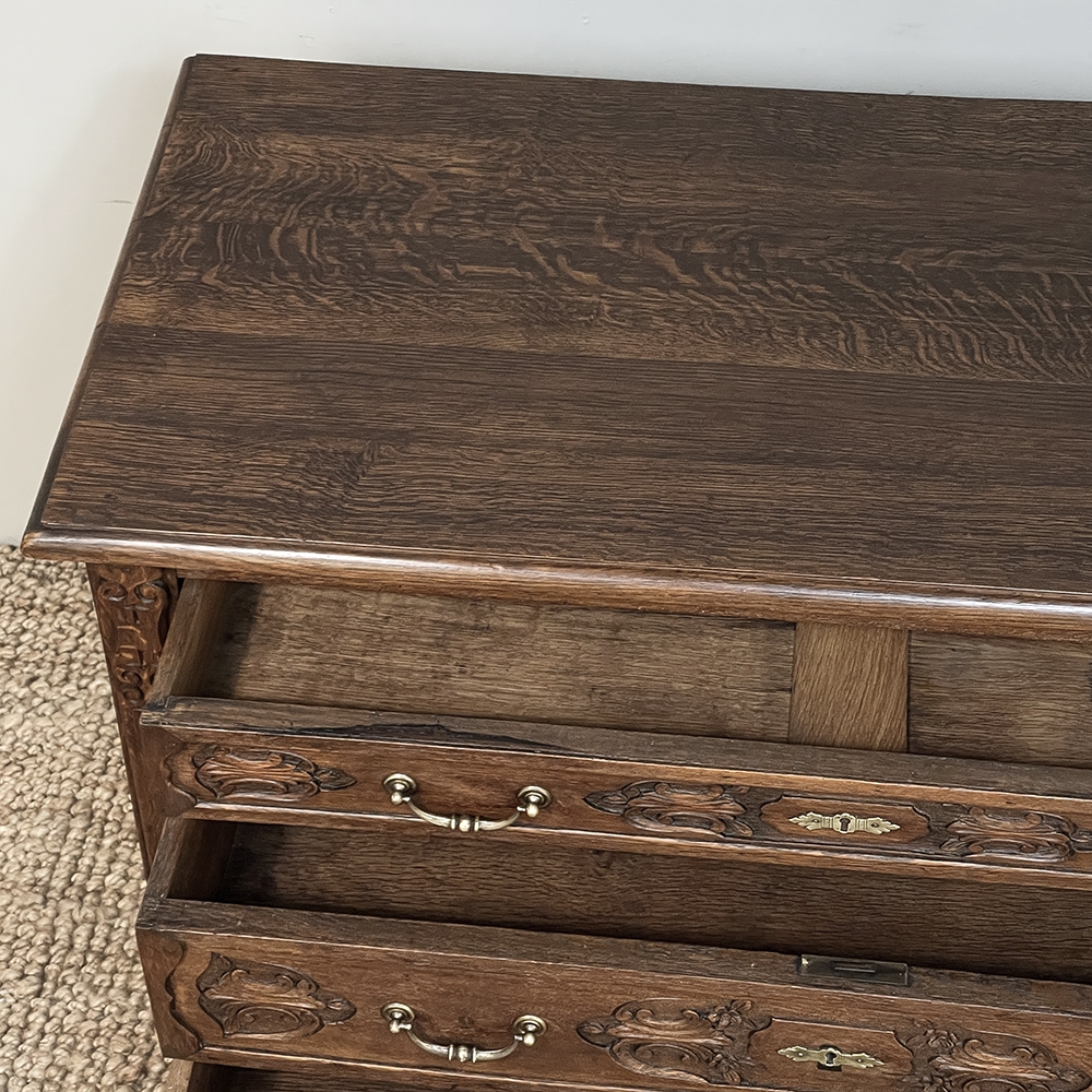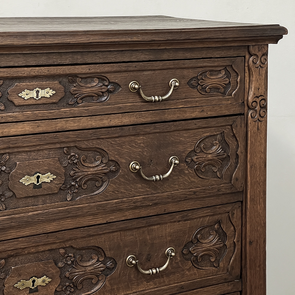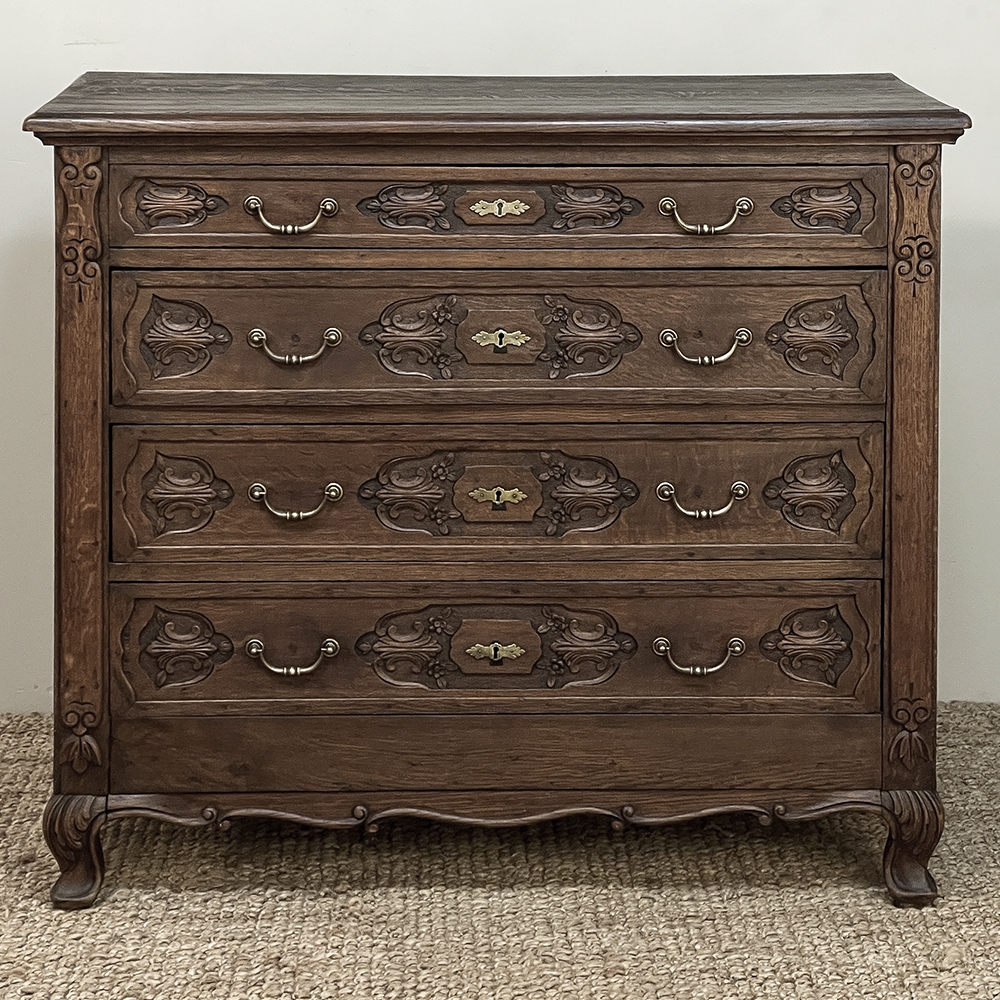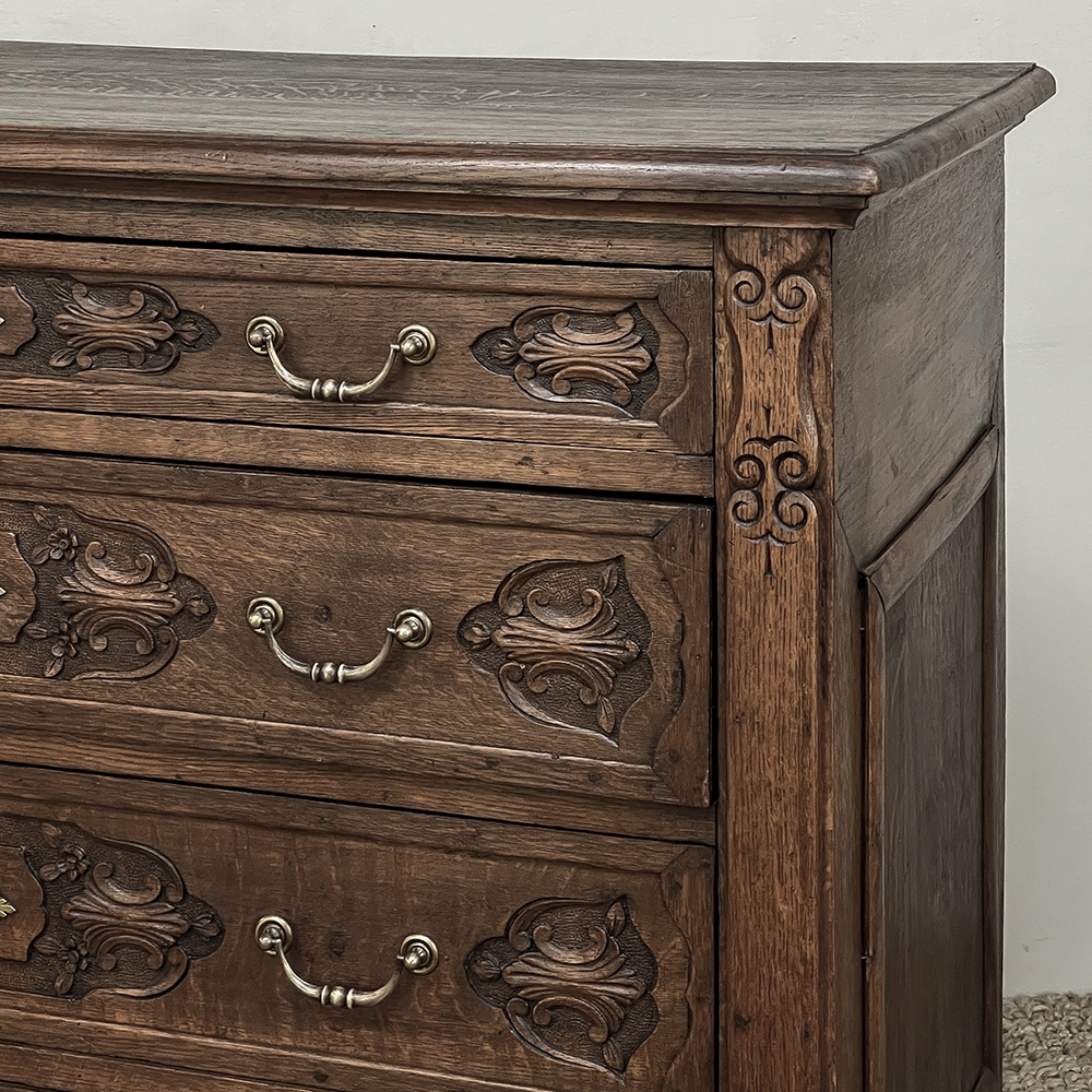 19th Century Dutch Country French Commode ~ Chest of Drawers is a handsome piece, indeed, hand-crafted from old-growth quarter-sawn oak to literally last for decade after decade. The solid plank top features a bullnose style edge, with reverse cove trim melding with the top of the casework. Tailored side panels contrast with the elegantly scrolled molding on the apron below. Similar treatment appears on the front apron, flanked by a brace of scrolled legs carved with acanthus plumes. On each corner, a raised pilaster carving provides a framework for the four drawers that are the highlight of the design. Each features three carved segments with stylized foliates recessed into the face. Brass key guards and bale pulls provide additional accent and functionality. An excellent choice to provide a bit of style as well as copious storage for any room!