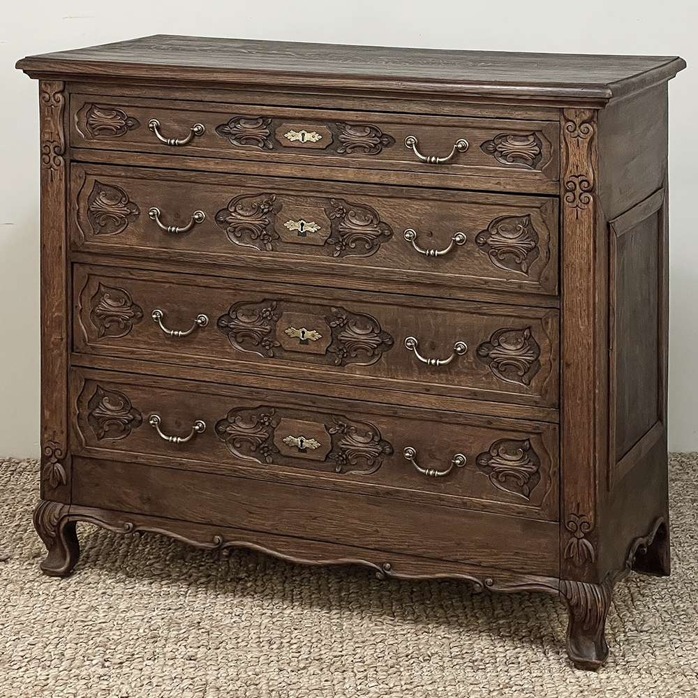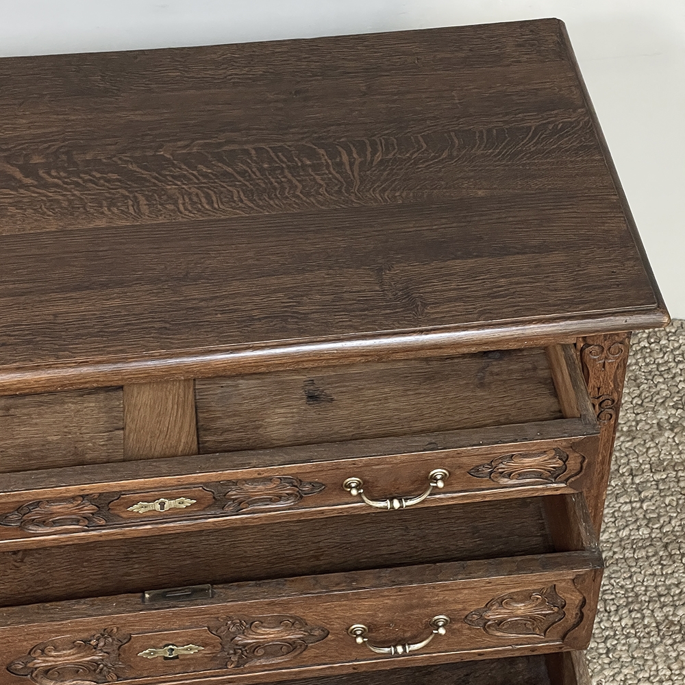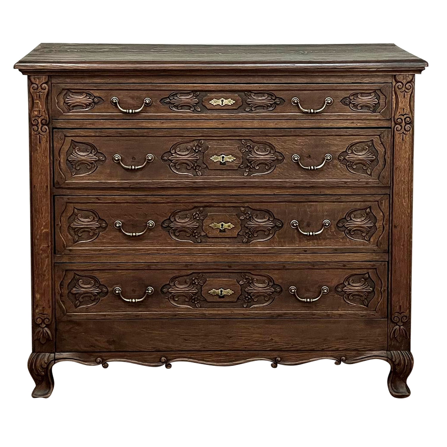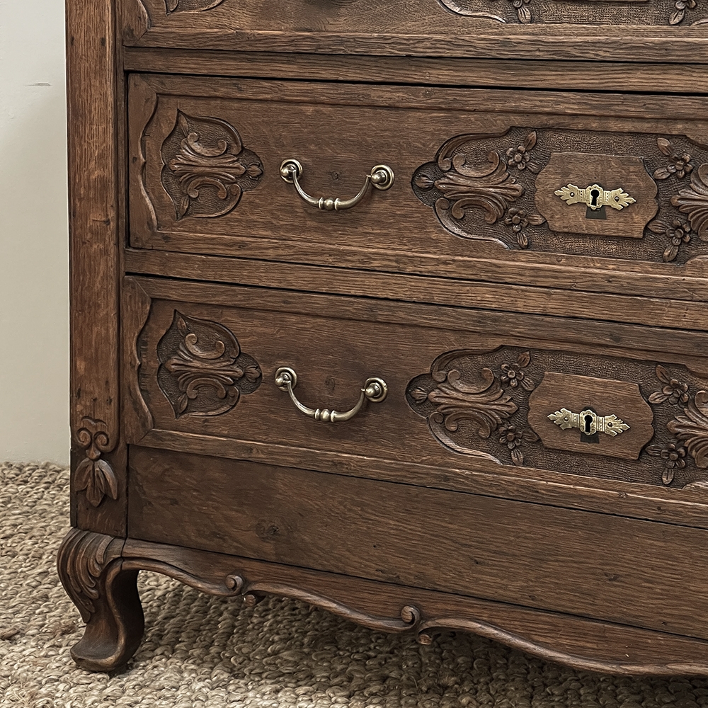 19th Century Dutch Country French Commode ~ Chest of Drawers is a handsome piece, indeed, hand-crafted from old-growth quarter-sawn oak to literally last for decade after decade. The solid plank top features a bullnose style edge, with reverse cove trim melding with the top of the casework. Tailored side panels contrast with the elegantly scrolled molding on the apron below. Similar treatment appears on the front apron, flanked by a brace of scrolled legs carved with acanthus plumes. On each corner, a raised pilaster carving provides a framework for the four drawers that are the highlight of the design. Each features three carved segments with stylized foliates recessed into the face. Brass key guards and bale pulls provide additional accent and functionality. An excellent choice to provide a bit of style as well as copious storage for any room!