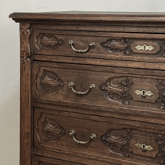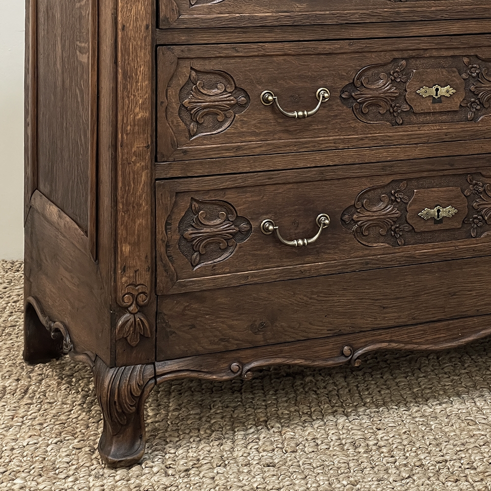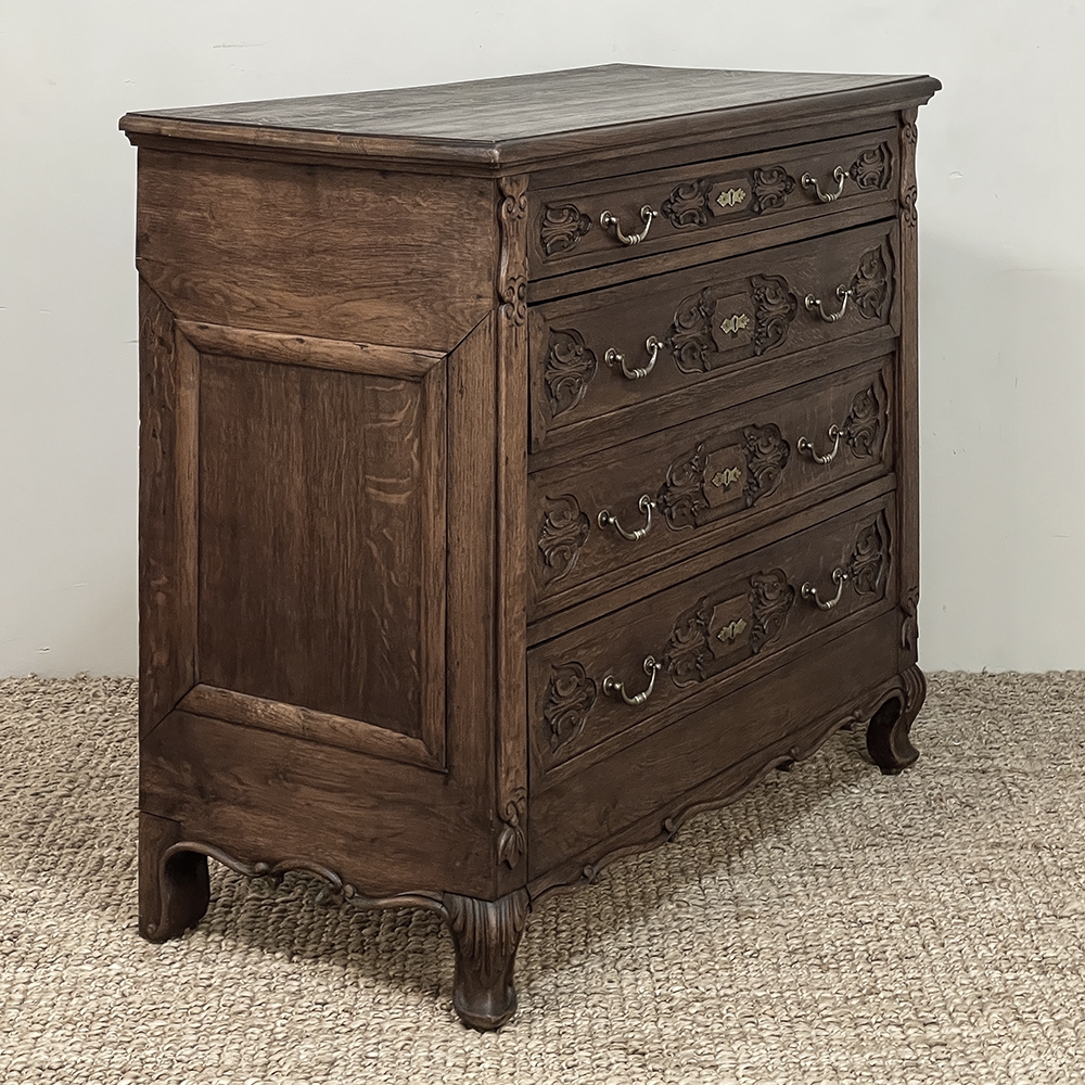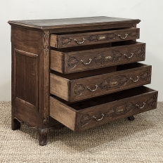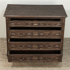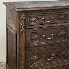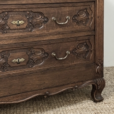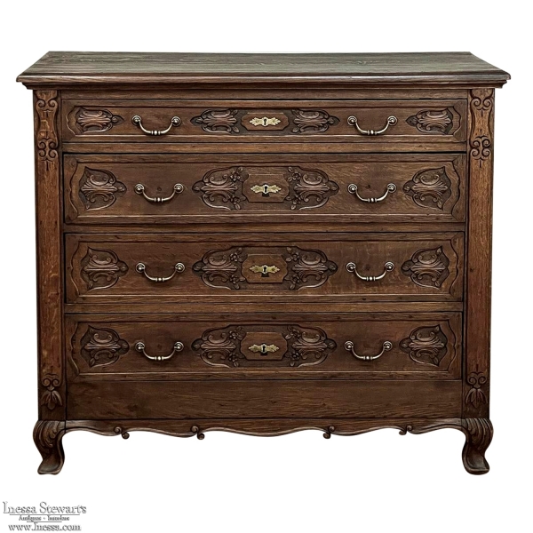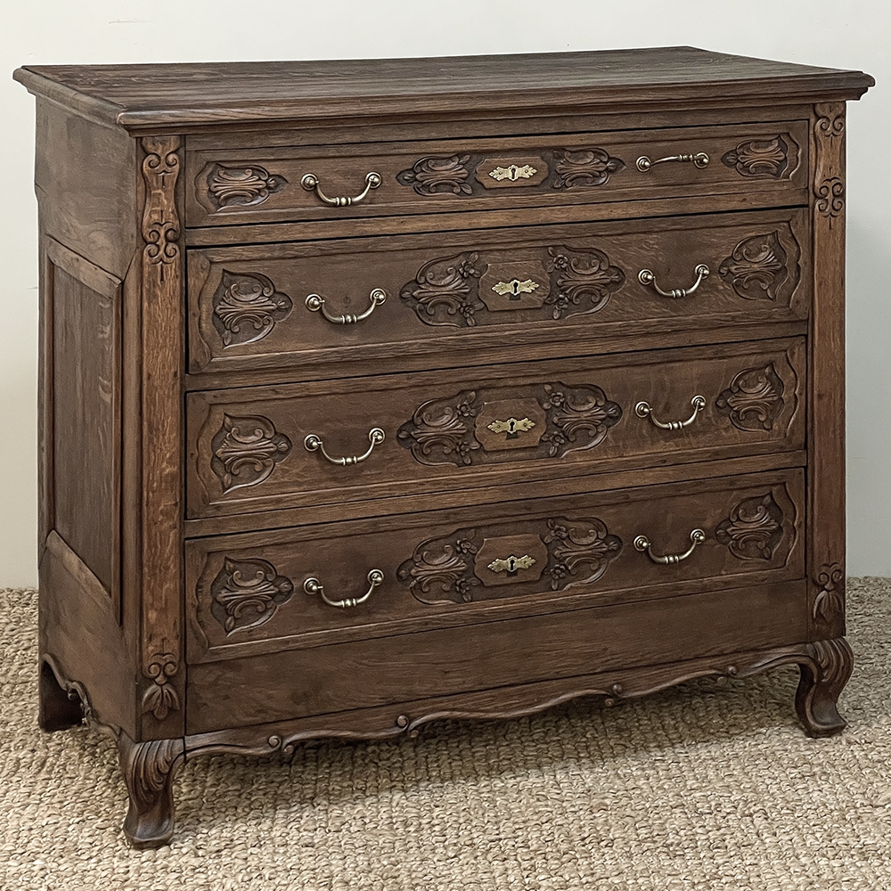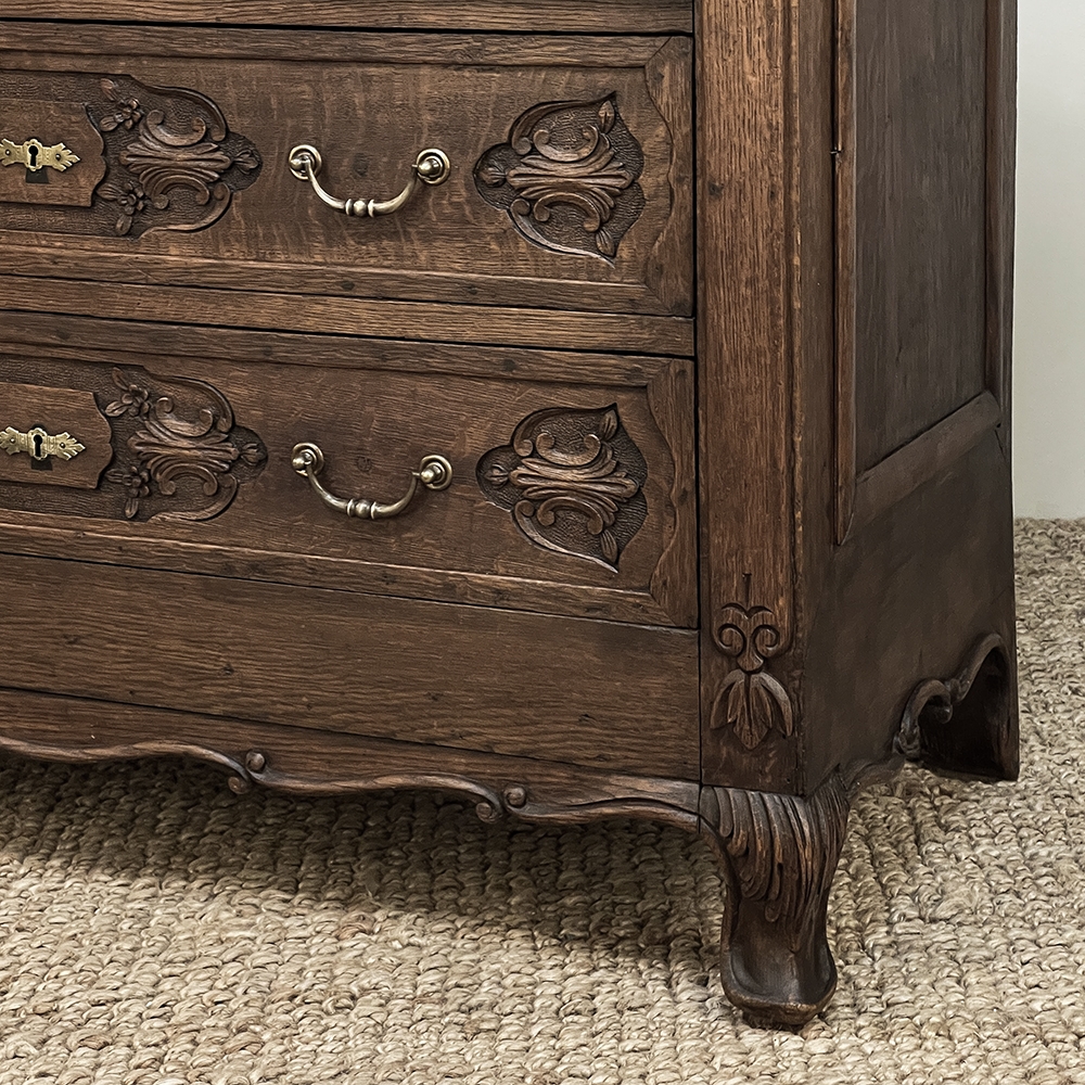 19th Century Dutch Country French Commode ~ Chest of Drawers is a handsome piece, indeed, hand-crafted from old-growth quarter-sawn oak to literally last for decade after decade. The solid plank top features a bullnose style edge, with reverse cove trim melding with the top of the casework. Tailored side panels contrast with the elegantly scrolled molding on the apron below. Similar treatment appears on the front apron, flanked by a brace of scrolled legs carved with acanthus plumes. On each corner, a raised pilaster carving provides a framework for the four drawers that are the highlight of the design. Each features three carved segments with stylized foliates recessed into the face. Brass key guards and bale pulls provide additional accent and functionality. An excellent choice to provide a bit of style as well as copious storage for any room!
