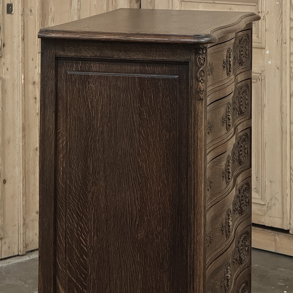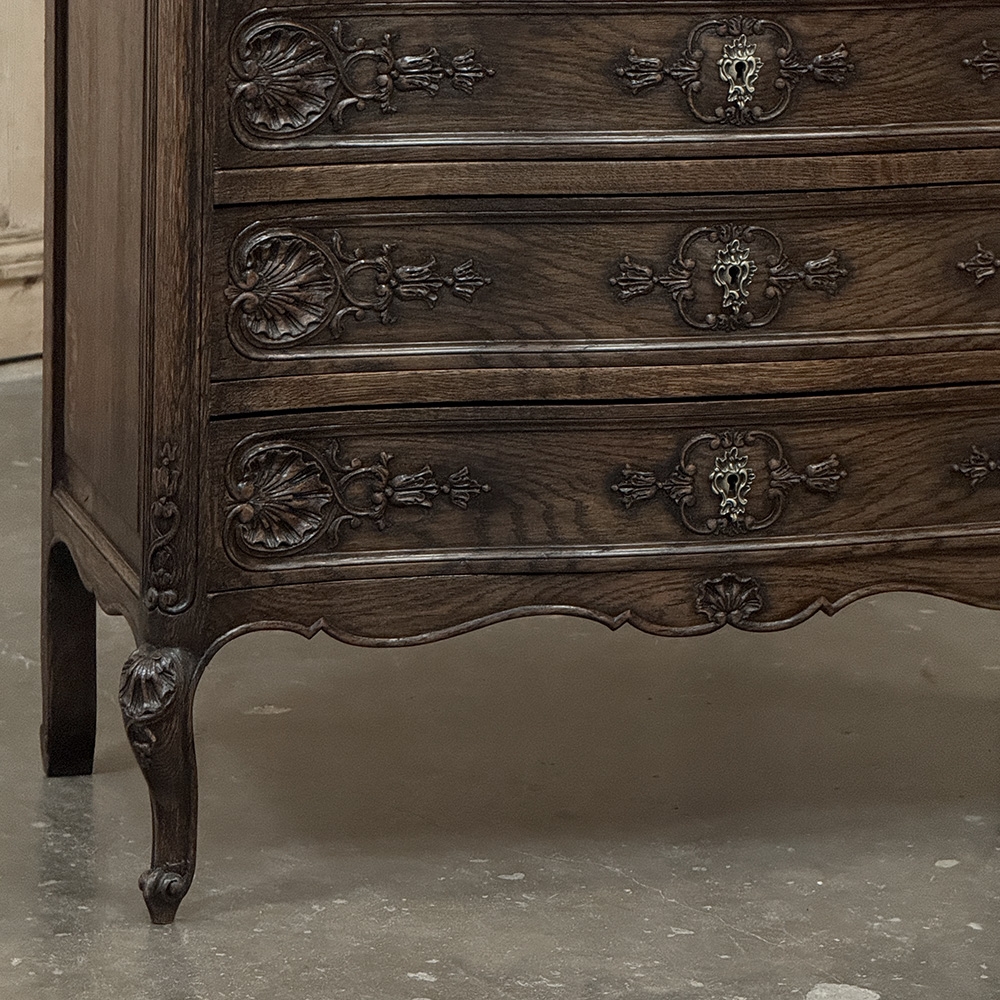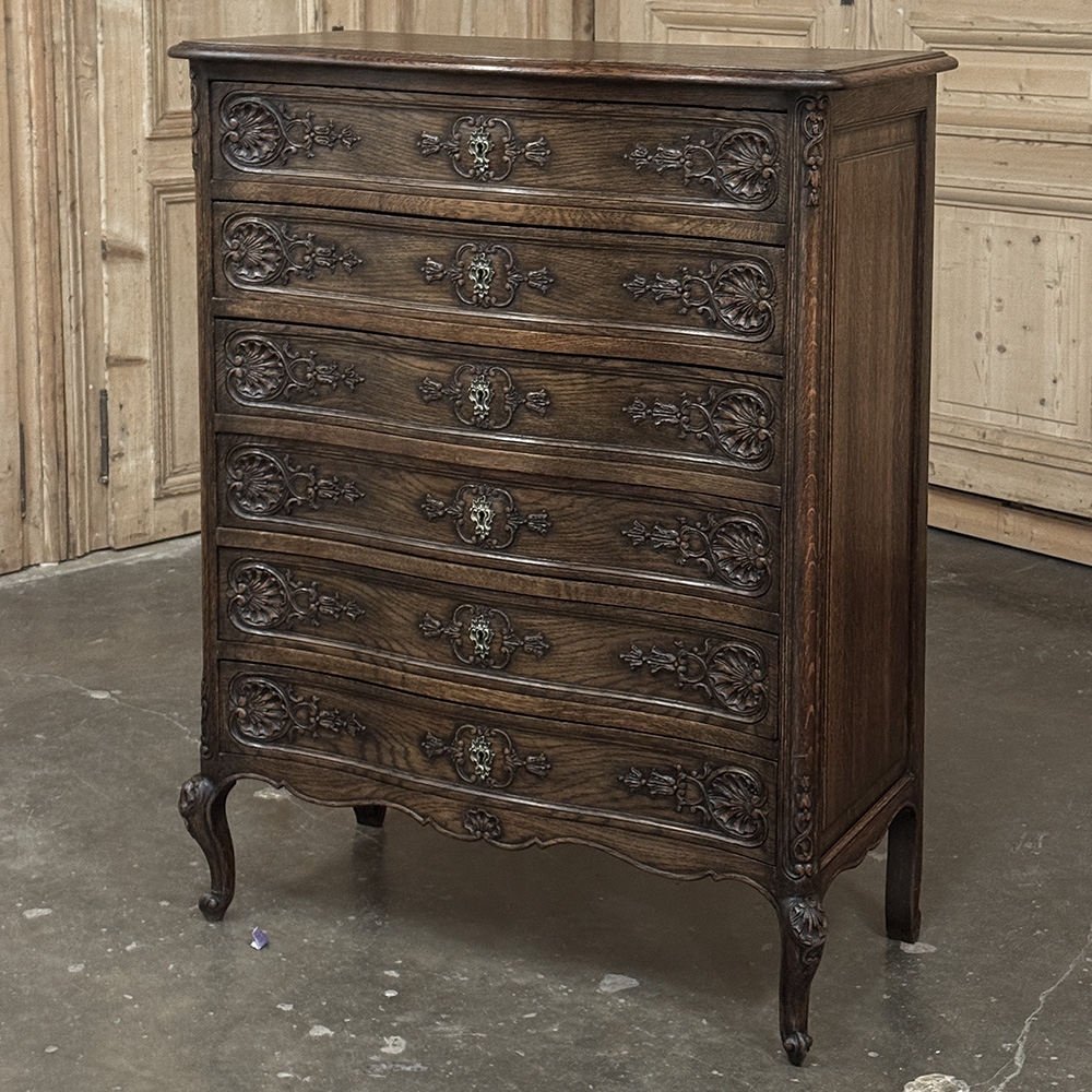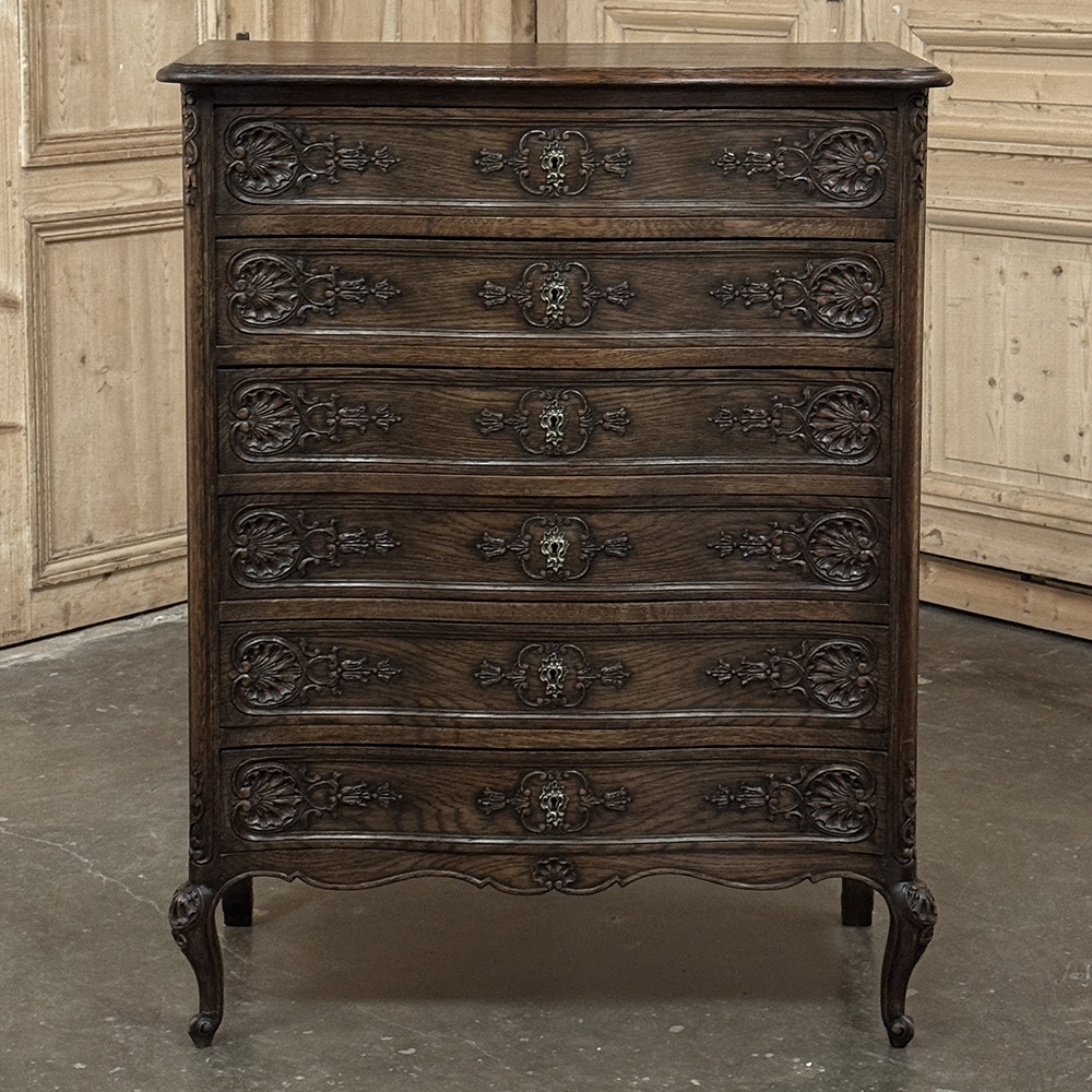 Antique Country French Chiffoniere ~ Chest of Drawers is perfect for storage and organization while occupying a small footprint on the room's floor plan. Only sixteen and a half inches deep, it is perfect for high traffic zones as well. Six drawers all feature a subtle bowfront shape, plus carvings of stylized shell and foliates mated with a finely cast brass key guard. Scrolled legs with escargot feet provide support, and the apron is contoured on all visible sides. Even the rounded corner posts have carved detail, leading the eye to the solid chamfered raised panel on each side. Great for cozy spots!