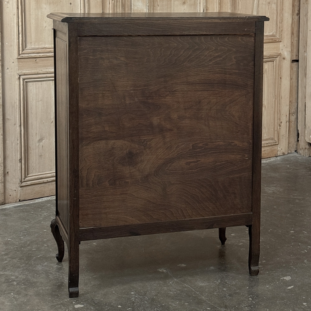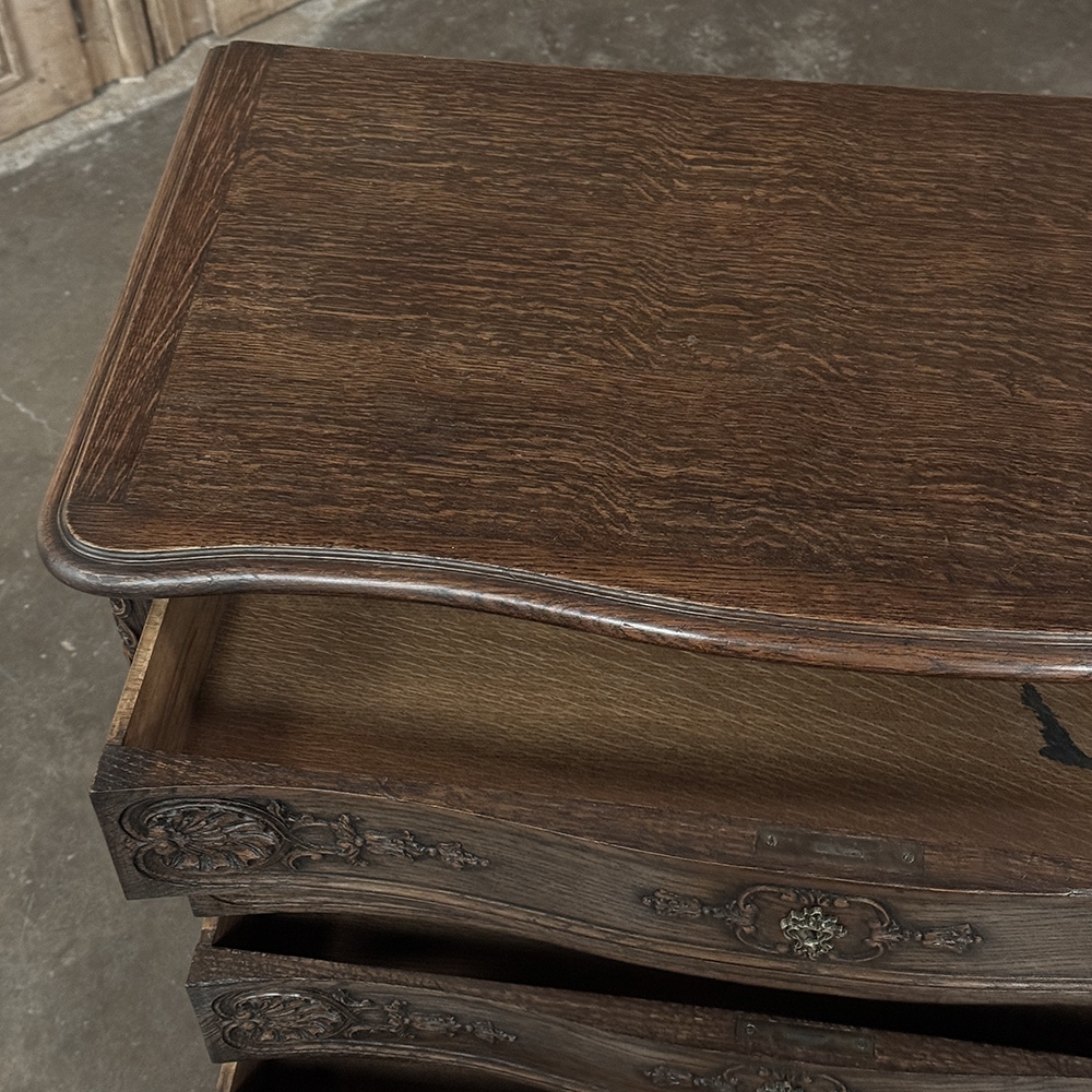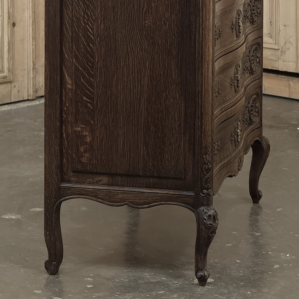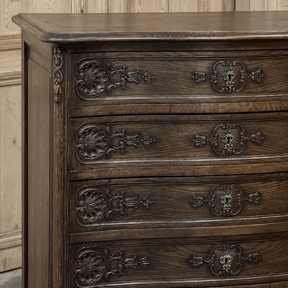 Antique Country French Chiffoniere ~ Chest of Drawers is perfect for storage and organization while occupying a small footprint on the room's floor plan. Only sixteen and a half inches deep, it is perfect for high traffic zones as well. Six drawers all feature a subtle bowfront shape, plus carvings of stylized shell and foliates mated with a finely cast brass key guard. Scrolled legs with escargot feet provide support, and the apron is contoured on all visible sides. Even the rounded corner posts have carved detail, leading the eye to the solid chamfered raised panel on each side. Great for cozy spots!