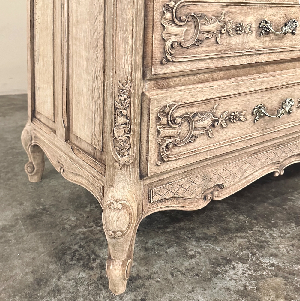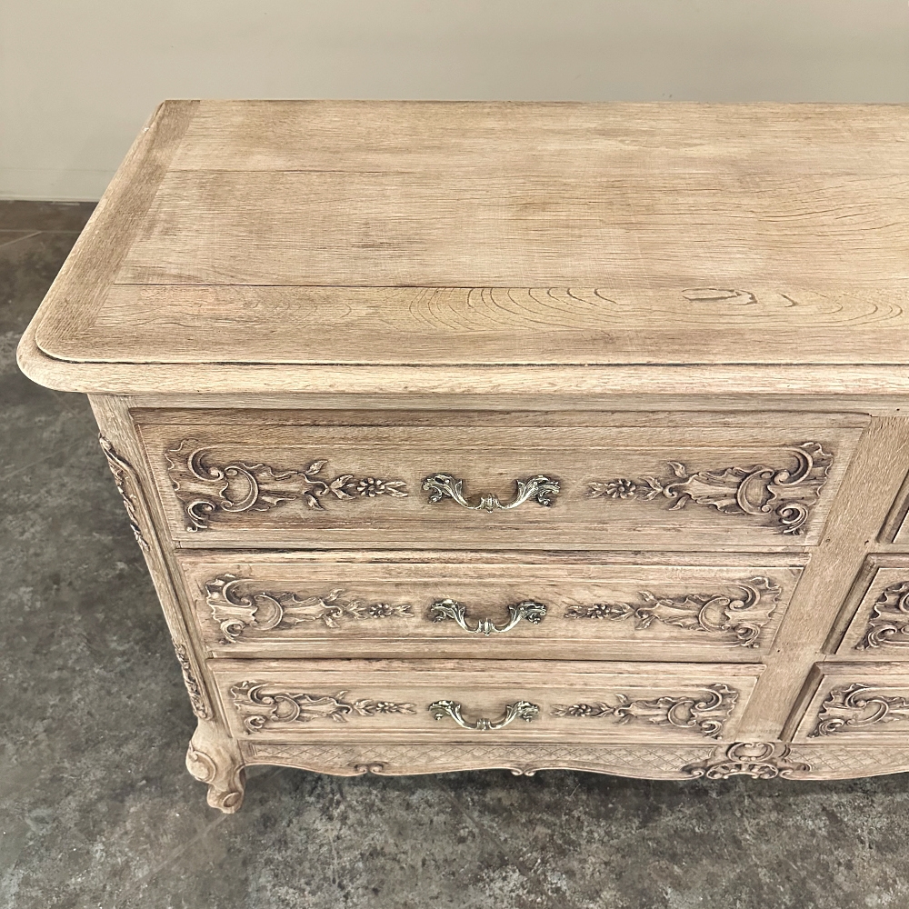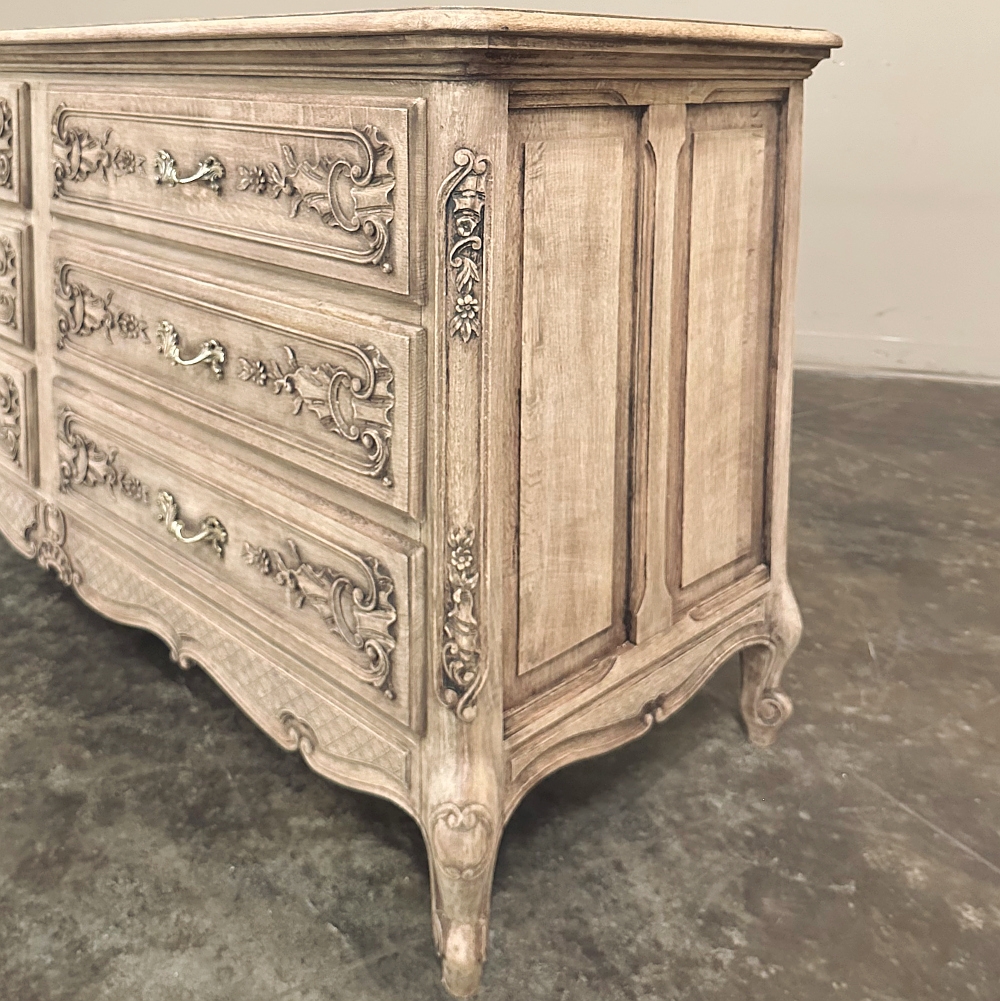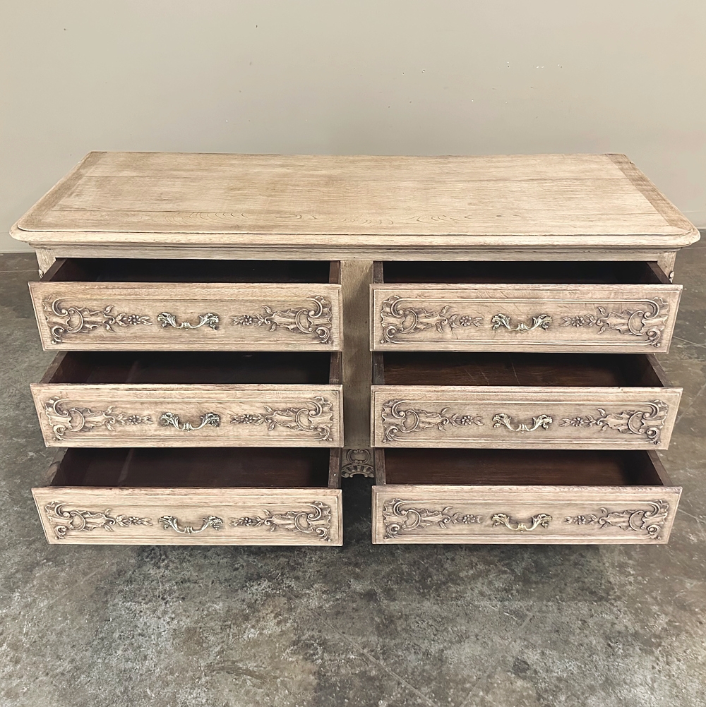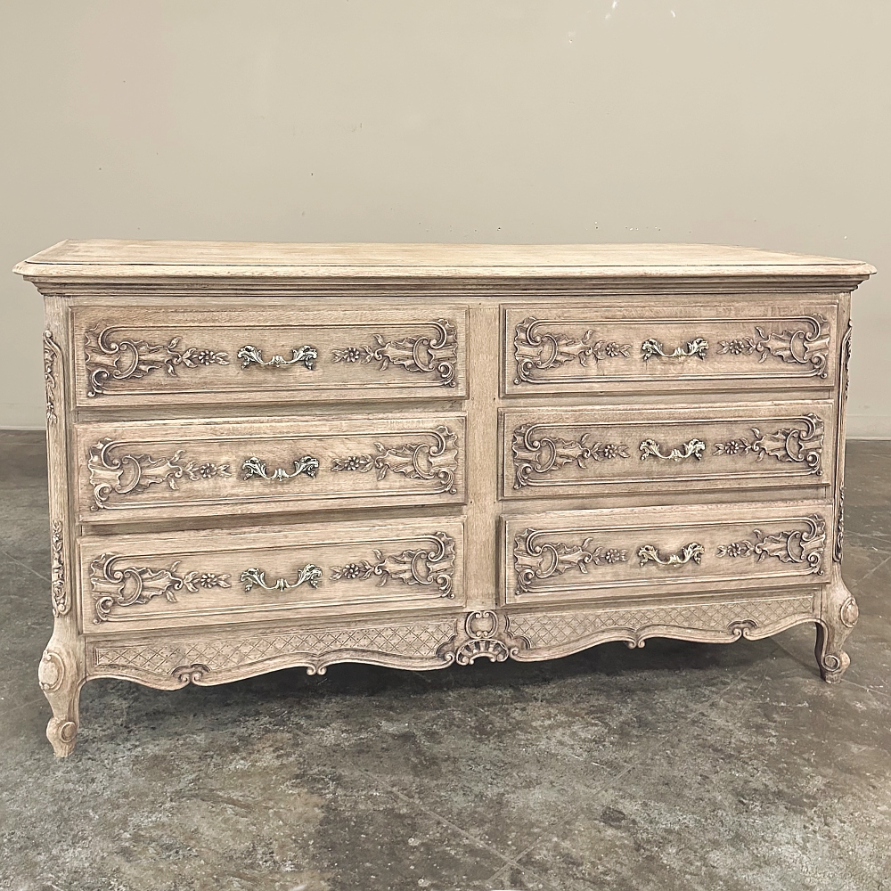 Antique Country French Double Commode in Stripped Oak provides six drawers for capacious storage in style! Hand-crafted and carved from solid oak, it features double raised & recessed panels on each side, plus beautifully carved drawer facades and a scrolled apron to match the scrolled legs ~ making it visually appealing from any angle. Stylized shell, floral and foliate motifs as well as cross-hatching on the apron are definitive of the style, enhanced even more by the solid cast brass pulls. Only 34 inches high yet able to contain copious amounts of clothing or personal items, it is a great choice to add flair and efficiency to any room!Painstakingly stripped using our proprietary process that retains the patina and sheer natural beauty of the old wood, all performed by our expert in-house staff.