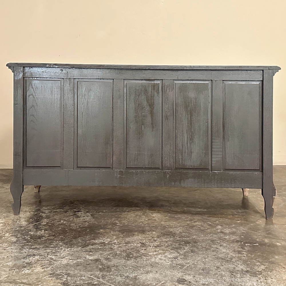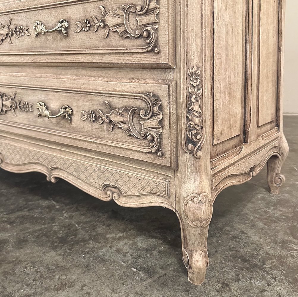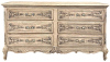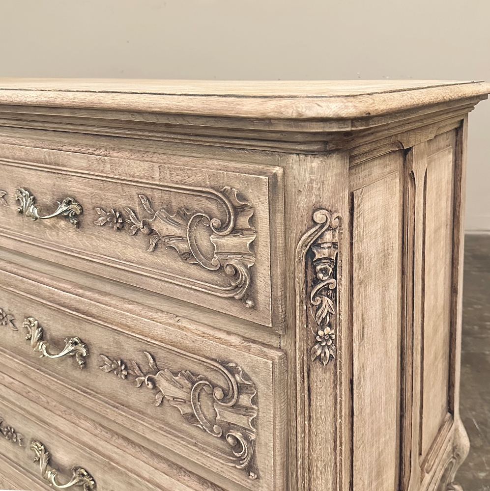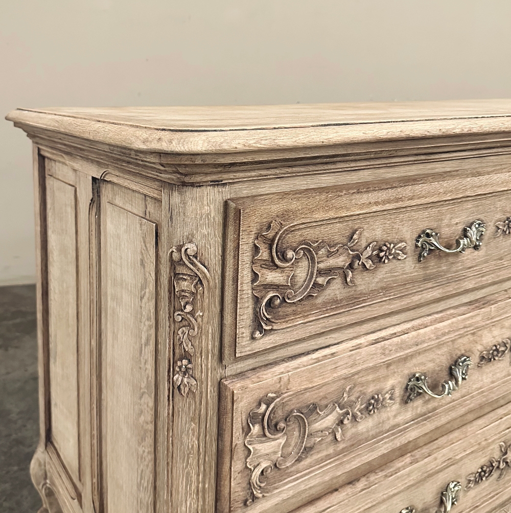 Antique Country French Double Commode in Stripped Oak provides six drawers for capacious storage in style! Hand-crafted and carved from solid oak, it features double raised & recessed panels on each side, plus beautifully carved drawer facades and a scrolled apron to match the scrolled legs ~ making it visually appealing from any angle. Stylized shell, floral and foliate motifs as well as cross-hatching on the apron are definitive of the style, enhanced even more by the solid cast brass pulls. Only 34 inches high yet able to contain copious amounts of clothing or personal items, it is a great choice to add flair and efficiency to any room!Painstakingly stripped using our proprietary process that retains the patina and sheer natural beauty of the old wood, all performed by our expert in-house staff.
