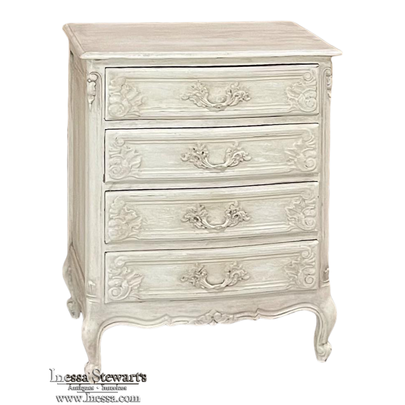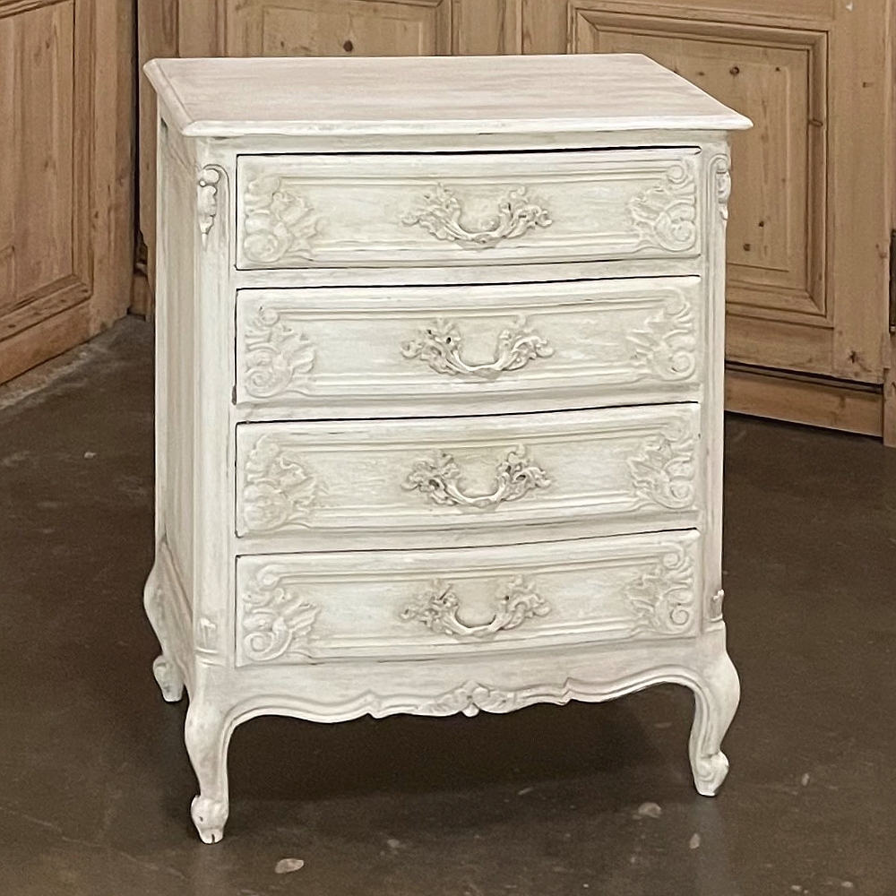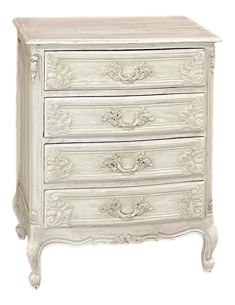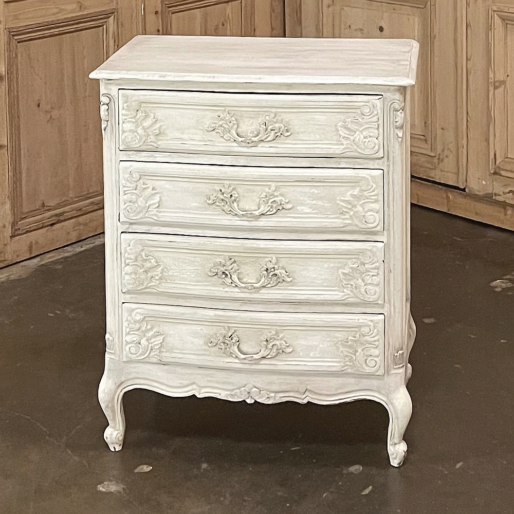SaleAntique Country French Painted Commode features a graceful appearance enhanced with subtle scrollwork from the carved ornamentation on the drawer facades to the four legs below, each tipped with esgargot carvings. The subtly scrolled apron has been carved with wildflower and foliates to complement the drawer facades above, which also have been crafted with a bowed front facade for intriguing visual appeal. A single Rococo style brass pull at the center of each drawer provides access to the surprisingly spacious interiors, and the patinaed painted finish highlights the carvings while simultaneously creating a soft visual palette that will add to any decor!