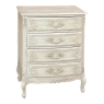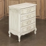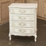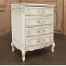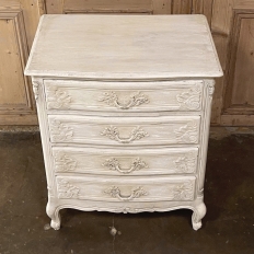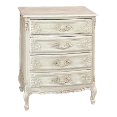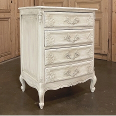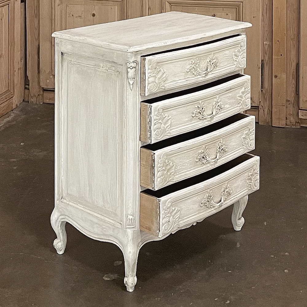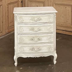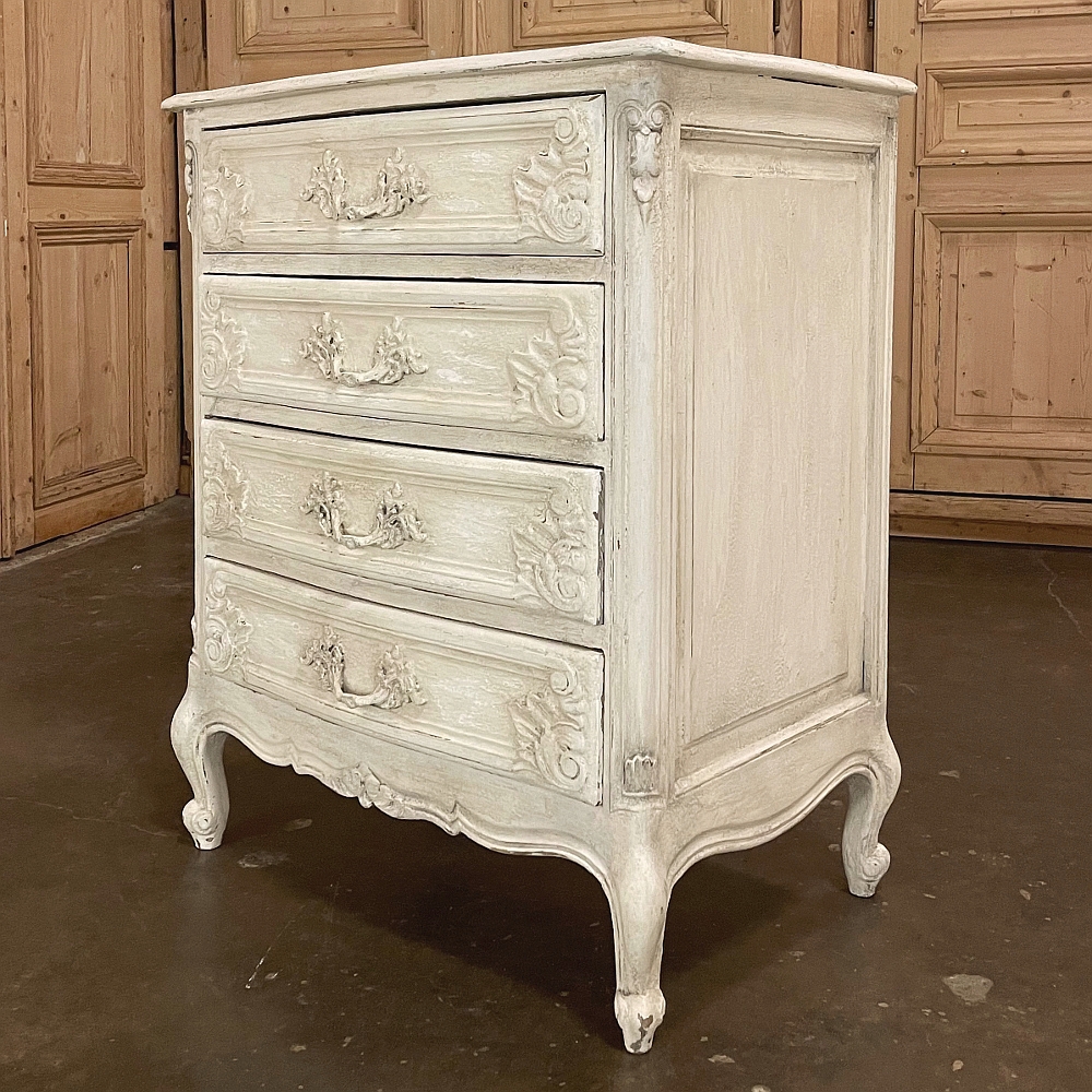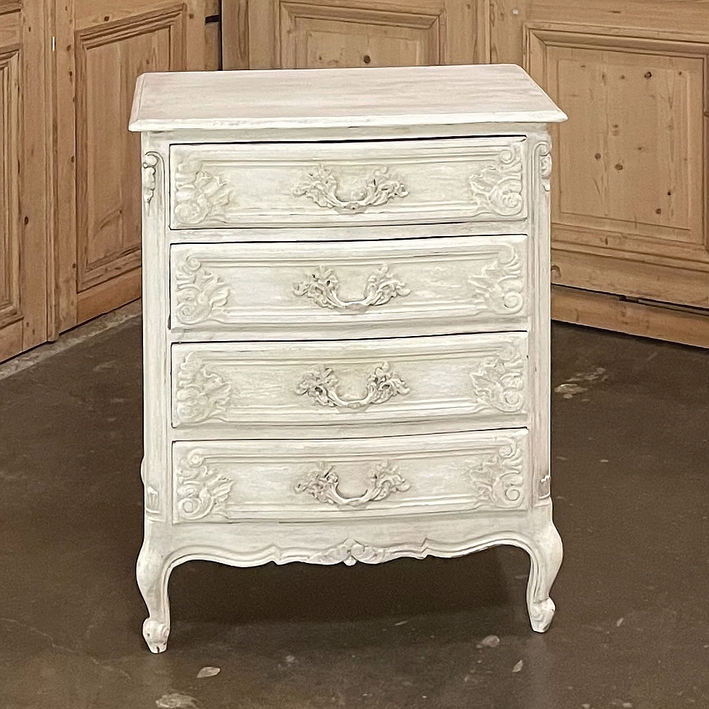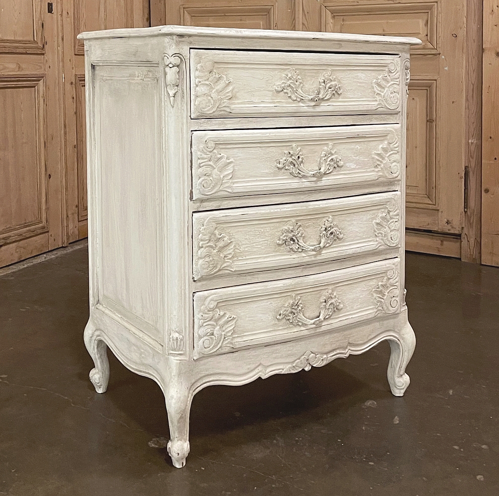 SaleAntique Country French Painted Commode features a graceful appearance enhanced with subtle scrollwork from the carved ornamentation on the drawer facades to the four legs below, each tipped with esgargot carvings. The subtly scrolled apron has been carved with wildflower and foliates to complement the drawer facades above, which also have been crafted with a bowed front facade for intriguing visual appeal. A single Rococo style brass pull at the center of each drawer provides access to the surprisingly spacious interiors, and the patinaed painted finish highlights the carvings while simultaneously creating a soft visual palette that will add to any decor!