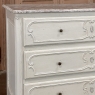 SaleAntique Country French Painted Commode ~ Chest of Drawers features subtle styling and a beautiful patinaed painted finish that is perfect for today's casual decors. The top has been whitewashed and sealed for a contrasting effect, while the main body features a fully painted facade. Three spacious drawers provide ample storage, with each decorated with tailored trim molding encircling the drawer, with scrollwork embellishments calling attention to the key guards at each center. Brass knobs provide easy access. The tailored design continues with the subtly scrolled apron and legs, with molded corners and panels on each side. Even the interiors of the drawers have been painted for a great all-around finished effect. Ideal for a sophisticated yet sedate look.