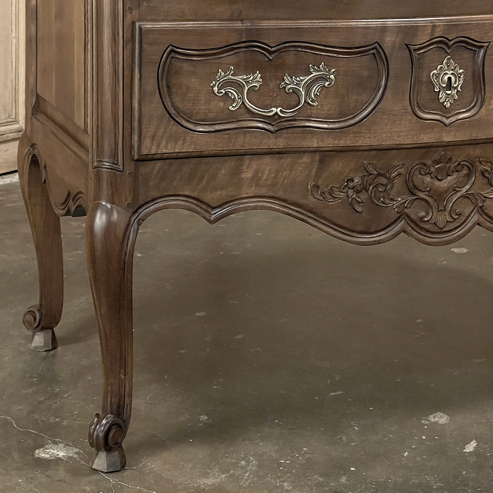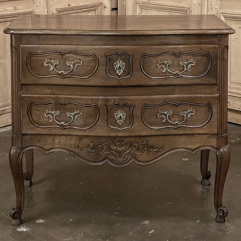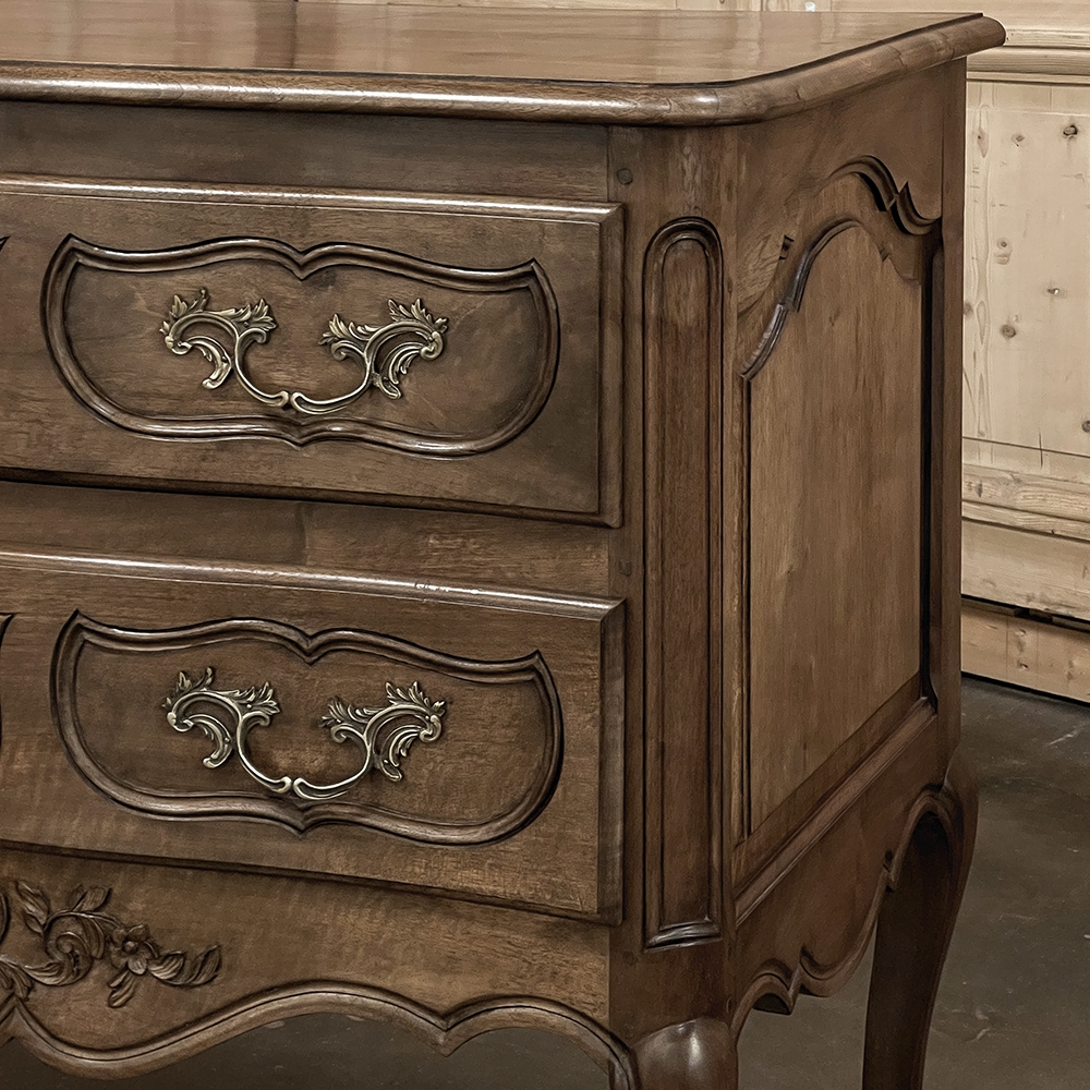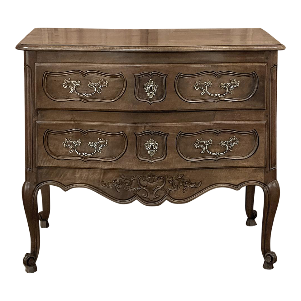 SaleAntique Country French Regence Walnut Commode was hand-crafted from the premier indigenous hardwood of Europe, sumptuous French walnut! The beveled top features a subtle bowed contour along the front, with the remainder of the facade following the same form leading the eyes down to the elegantly scrolled cabriole legs with escargot feet framing a boldly scrolled apron lavished with relief carvings of a crest and wildflowers. The two full width drawers feature a relatively restrained decorative appeal, with shield forms in triplicate defined by hand-carved molding detail, with the outermost fitted with luxurious cast bronze pulls and the centermost finely cast key guards. Even the side panels feature elegantly contoured, chamfered and framed panels with scrolled aprons and cabriole legs in the back, making this piece a visual masterpiece no matter from what angle it is viewed! The Regence style is known for being a more delicate interpretation of the Louis XIV style, and is revered world-wide.