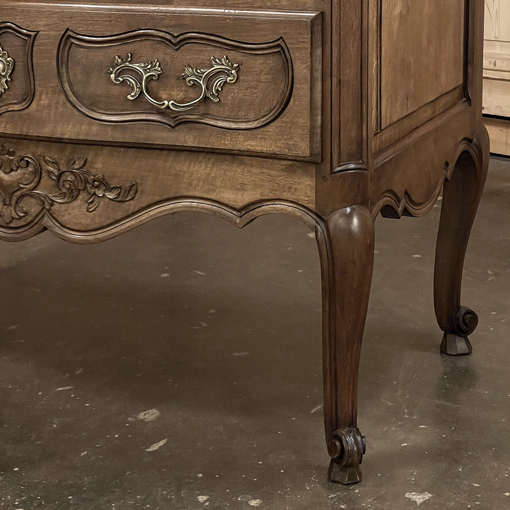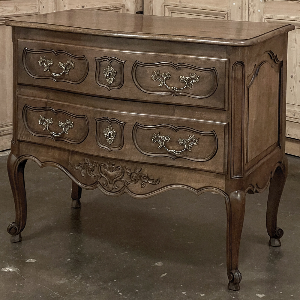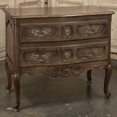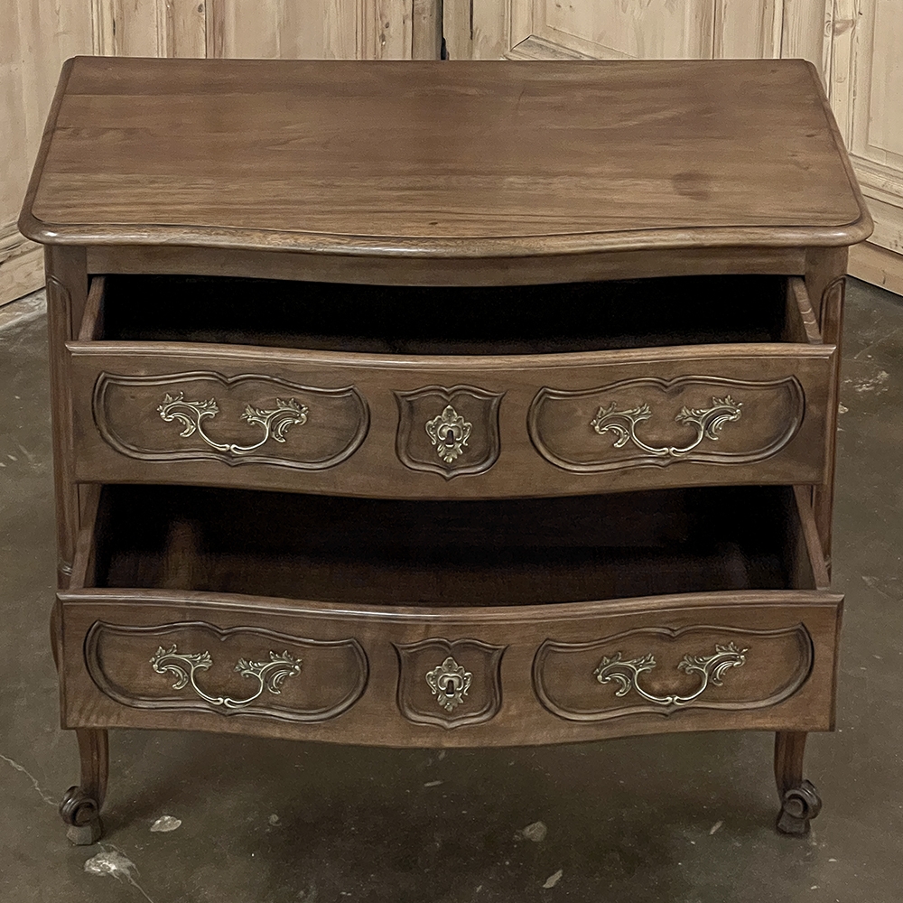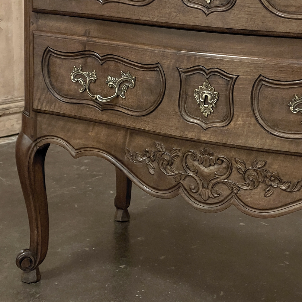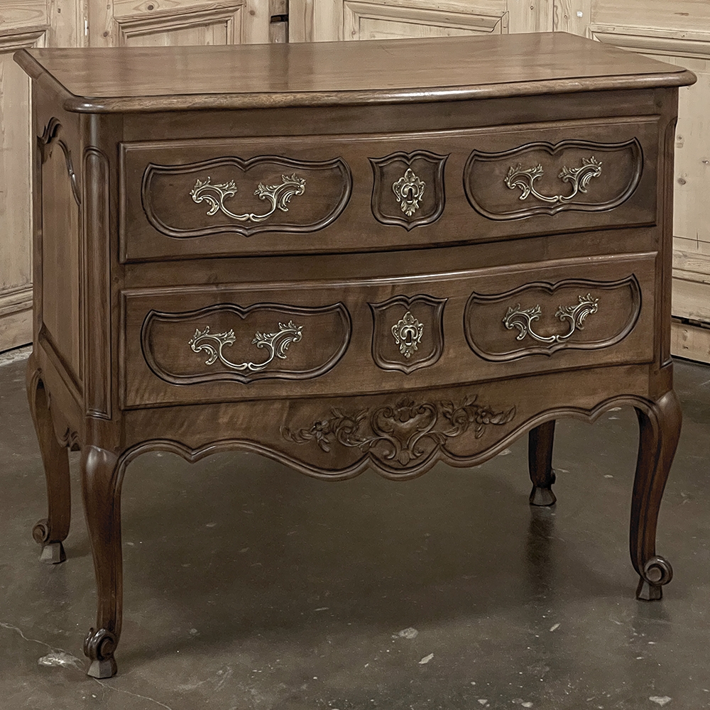 SaleAntique Country French Regence Walnut Commode was hand-crafted from the premier indigenous hardwood of Europe, sumptuous French walnut! The beveled top features a subtle bowed contour along the front, with the remainder of the facade following the same form leading the eyes down to the elegantly scrolled cabriole legs with escargot feet framing a boldly scrolled apron lavished with relief carvings of a crest and wildflowers. The two full width drawers feature a relatively restrained decorative appeal, with shield forms in triplicate defined by hand-carved molding detail, with the outermost fitted with luxurious cast bronze pulls and the centermost finely cast key guards. Even the side panels feature elegantly contoured, chamfered and framed panels with scrolled aprons and cabriole legs in the back, making this piece a visual masterpiece no matter from what angle it is viewed! The Regence style is known for being a more delicate interpretation of the Louis XIV style, and is revered world-wide.