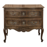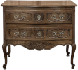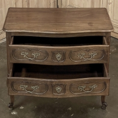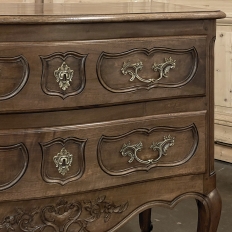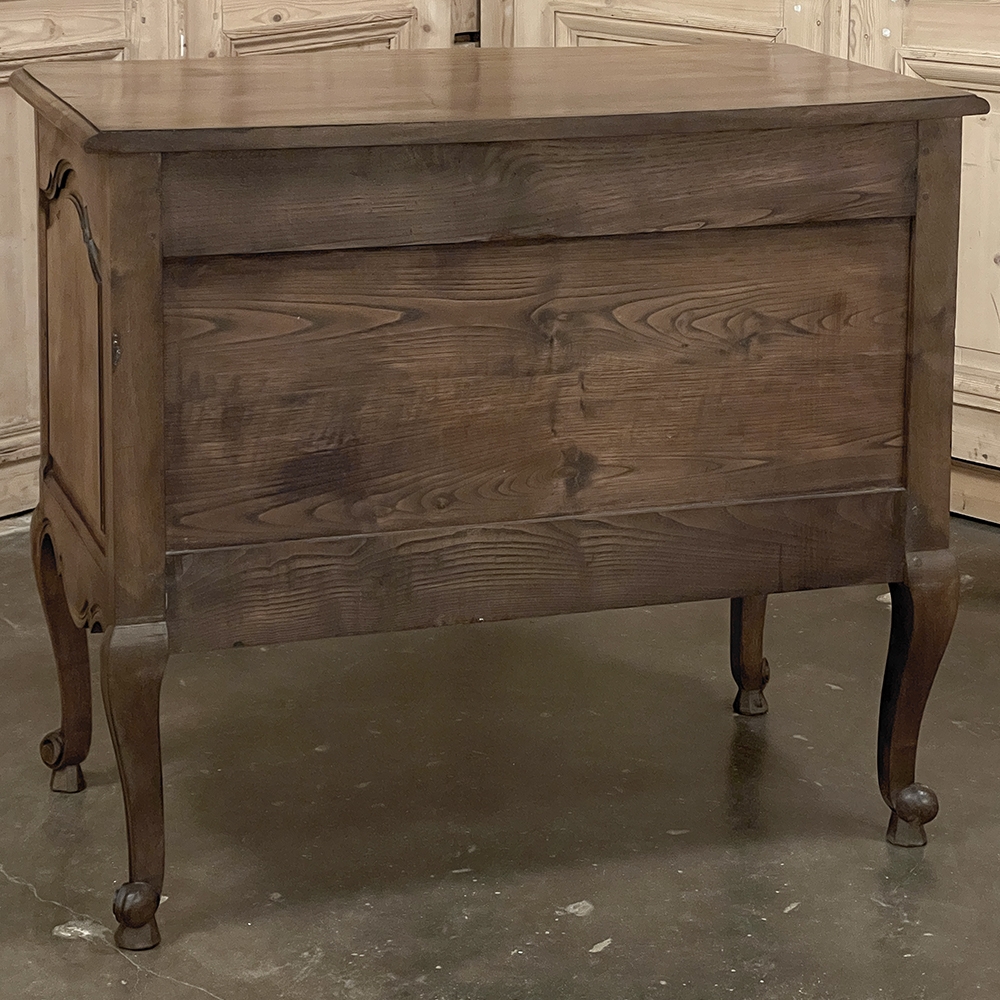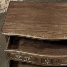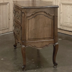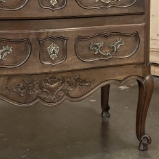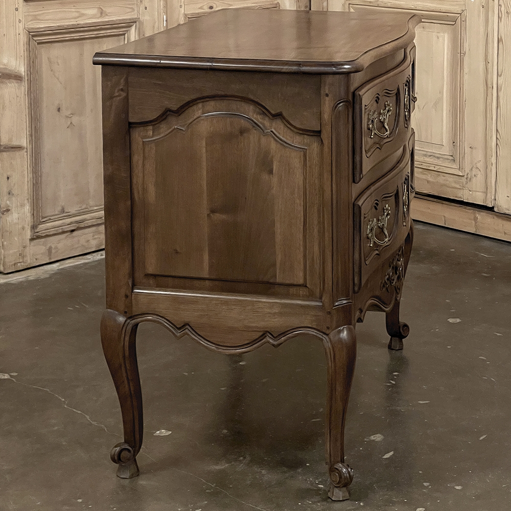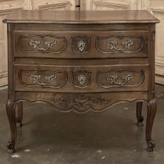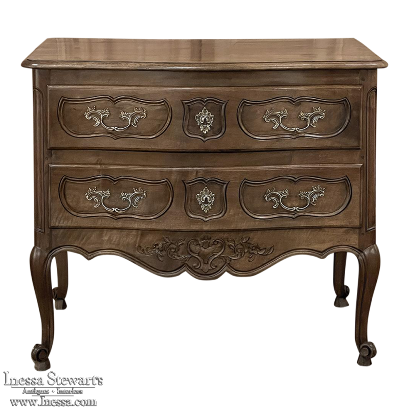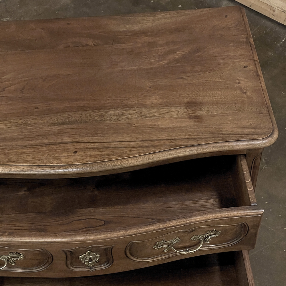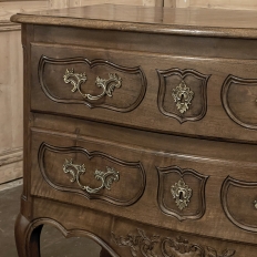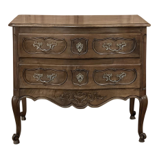 SaleAntique Country French Regence Walnut Commode was hand-crafted from the premier indigenous hardwood of Europe, sumptuous French walnut! The beveled top features a subtle bowed contour along the front, with the remainder of the facade following the same form leading the eyes down to the elegantly scrolled cabriole legs with escargot feet framing a boldly scrolled apron lavished with relief carvings of a crest and wildflowers. The two full width drawers feature a relatively restrained decorative appeal, with shield forms in triplicate defined by hand-carved molding detail, with the outermost fitted with luxurious cast bronze pulls and the centermost finely cast key guards. Even the side panels feature elegantly contoured, chamfered and framed panels with scrolled aprons and cabriole legs in the back, making this piece a visual masterpiece no matter from what angle it is viewed! The Regence style is known for being a more delicate interpretation of the Louis XIV style, and is revered world-wide.