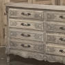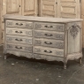 Grand Antique French Louis XIV Serpentine Commode in Stripped Oak features no less than eight drawers! Perfect for keeping everything organized and in its place, and doing it in style, this piece was fashioned from solid oak, and features a serpentine design allowing it to remain shallow against the wall for optimum traffic flow in the room. Each drawer is centered with a cast brass pull, and every drawer facade, as well as the apron and serpentine sides are carved with Louis XIV-inspired shell & foliate carvings for excellent visual appeal. Combined with the softness of the finish, it has been painstakingly stripped using our proprietary process that retains the patina and sheer natural beauty of the old wood, all performed by our expert in-house staff.